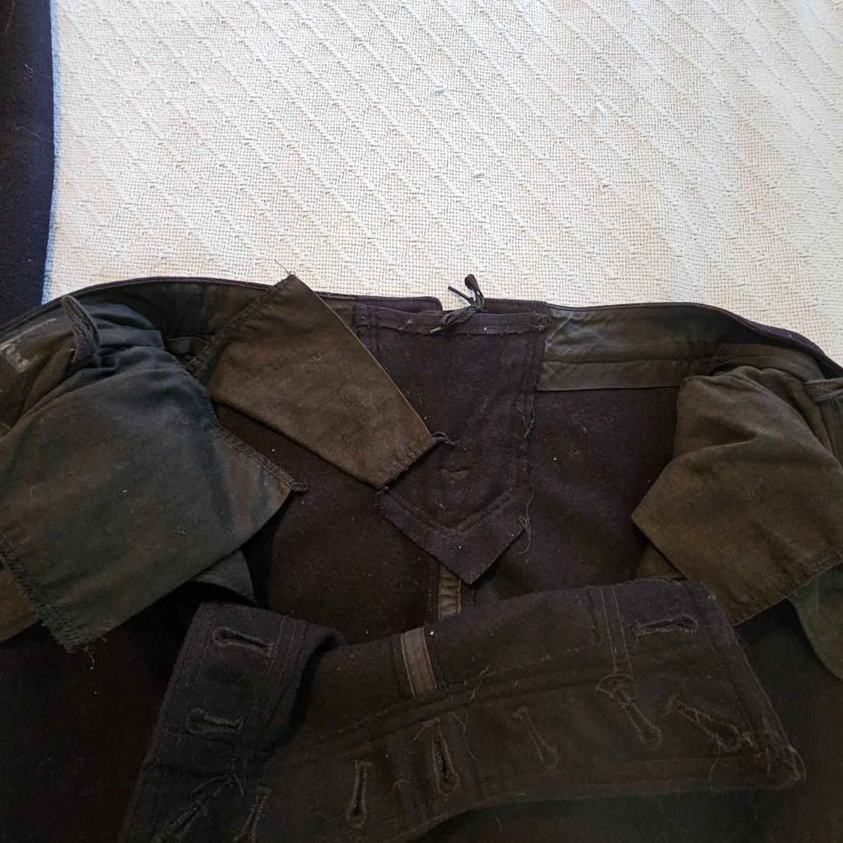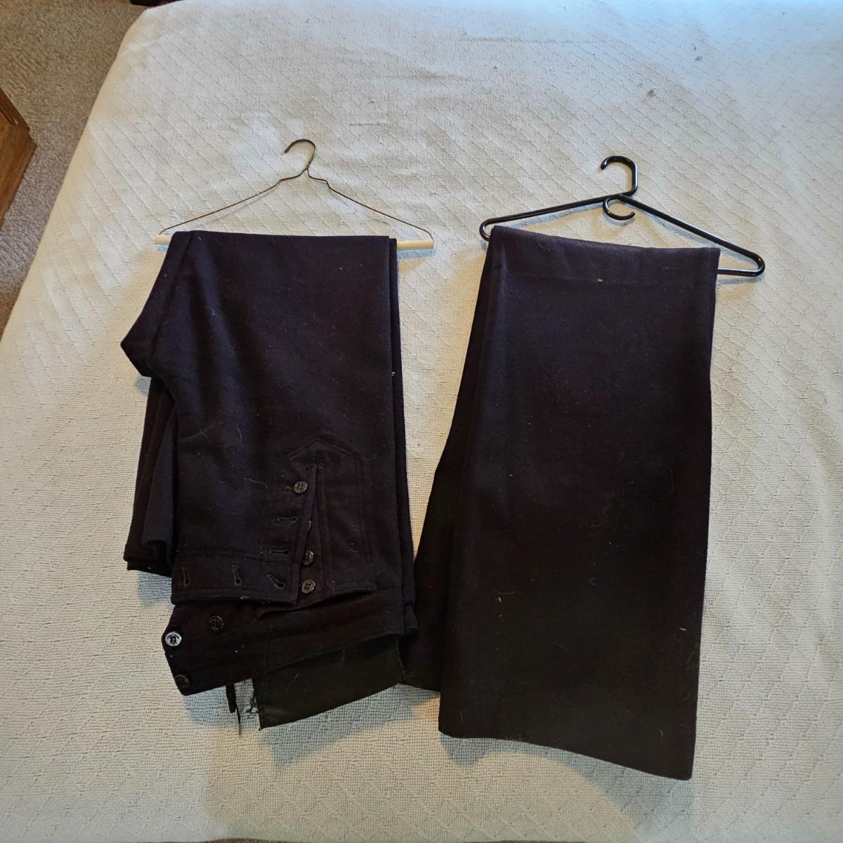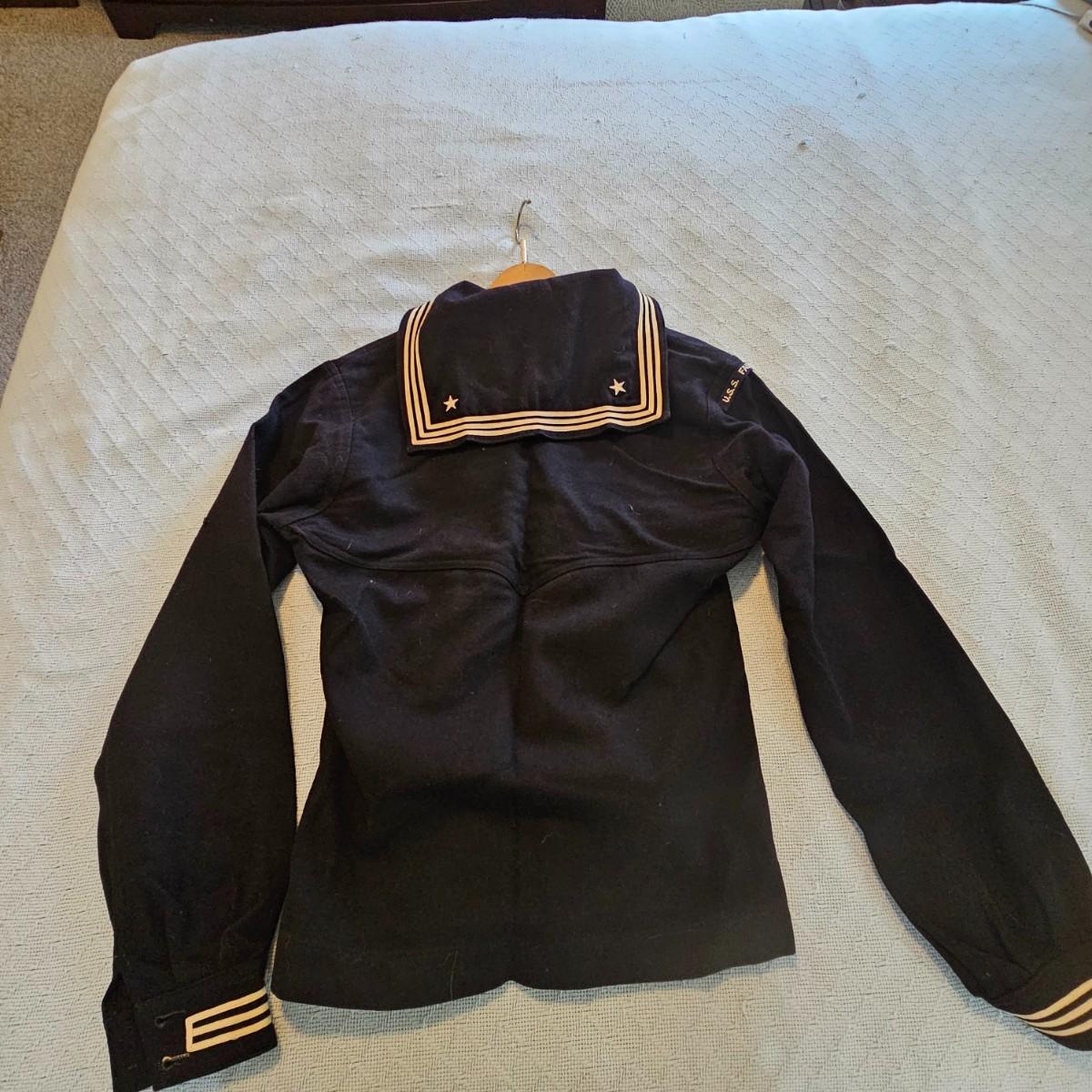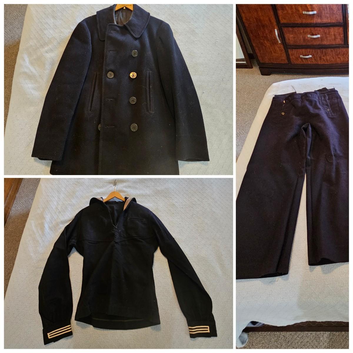 A pea coat, a blouse and two pair of pants, all naval issue and all wool. Full length pea coat has anchor image buttons, is double breasted in either direction and has slash pockets. There is wear and staining around collar ring. Naval jumper has V-neck, flap at back of collar, indicates service on U.S.S. Falgout which appeared to be commissioned from 1943-1969. Two pair of button-front blue pants with square bottom legs and Navy logo buttons. All items show some wear. See photos for details. Shipping available.