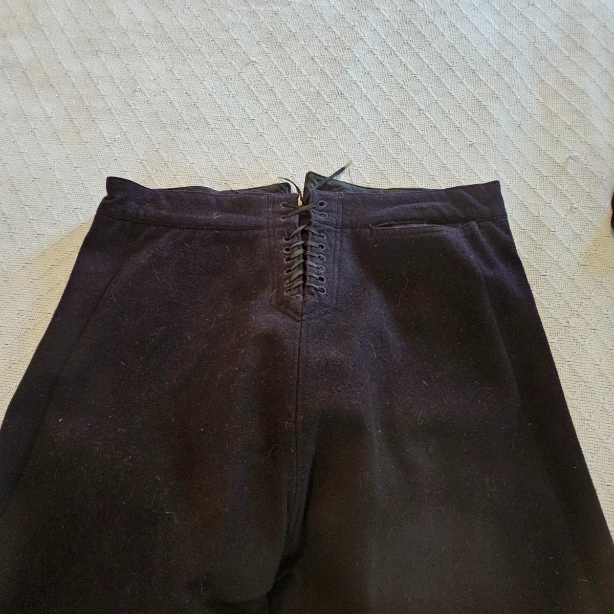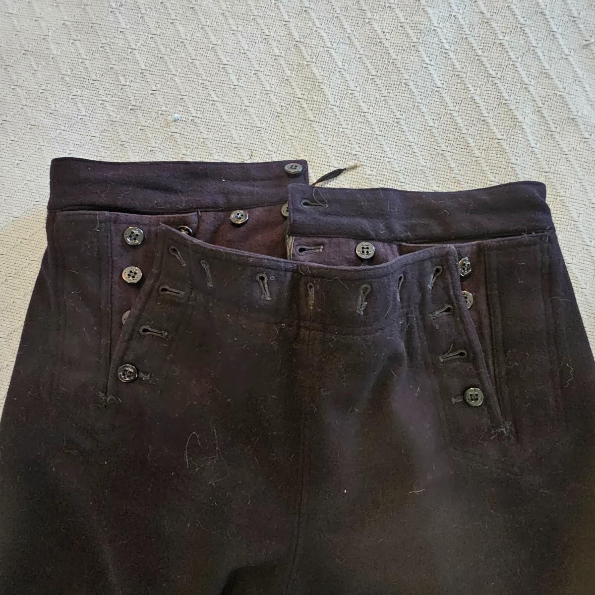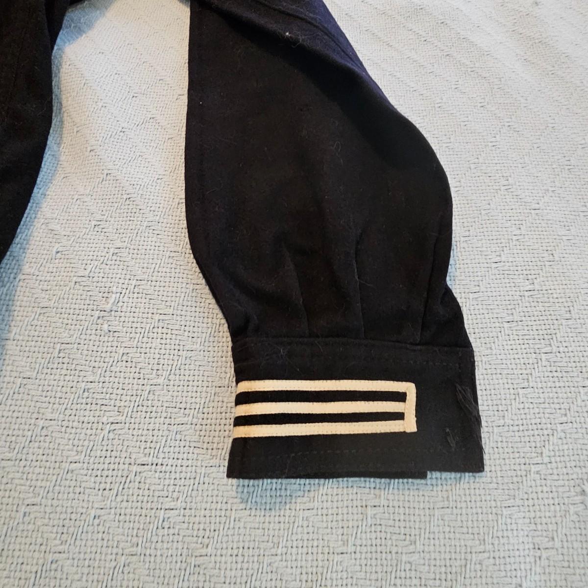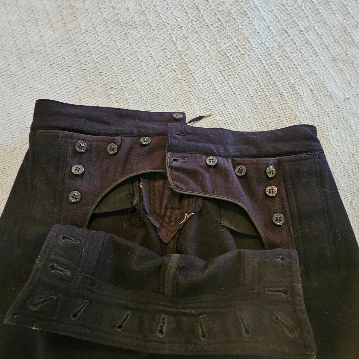 A pea coat, a blouse and two pair of pants, all naval issue and all wool. Full length pea coat has anchor image buttons, is double breasted in either direction and has slash pockets. There is wear and staining around collar ring. Naval jumper has V-neck, flap at back of collar, indicates service on U.S.S. Falgout which appeared to be commissioned from 1943-1969. Two pair of button-front blue pants with square bottom legs and Navy logo buttons. All items show some wear. See photos for details. Shipping available.