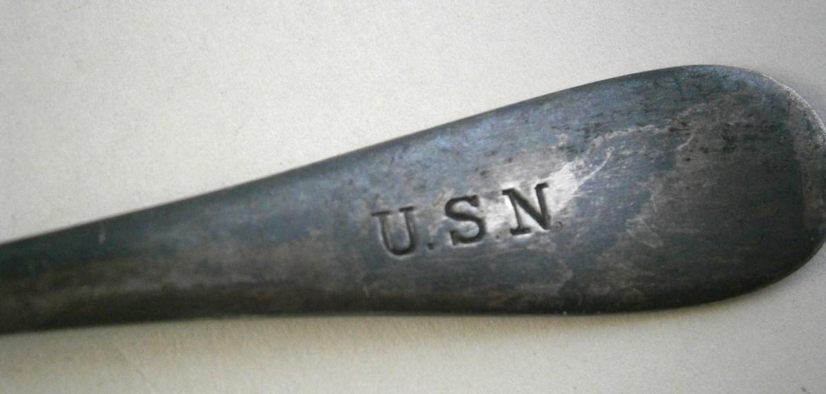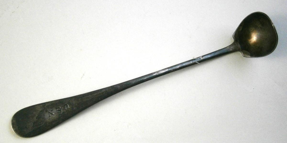 US Navy Condiment or Olive Spoon, vintage, by William Rogers & Sons, silverplate, 5 in. long.