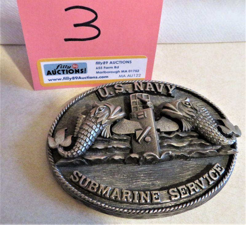 Vintage U.S. NAVY SUBMARINE SERVICE Metal Paperweight. Made by R. PETTE CO. Prov. R.I.., measures approx 4.25 x 3.25 x 1" h., weighs approx 15 oz.