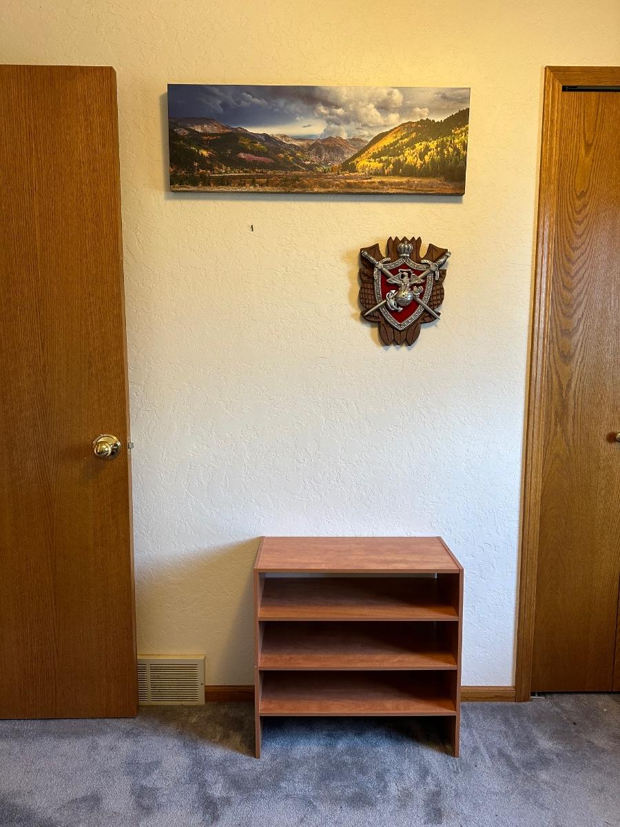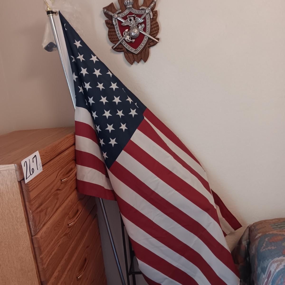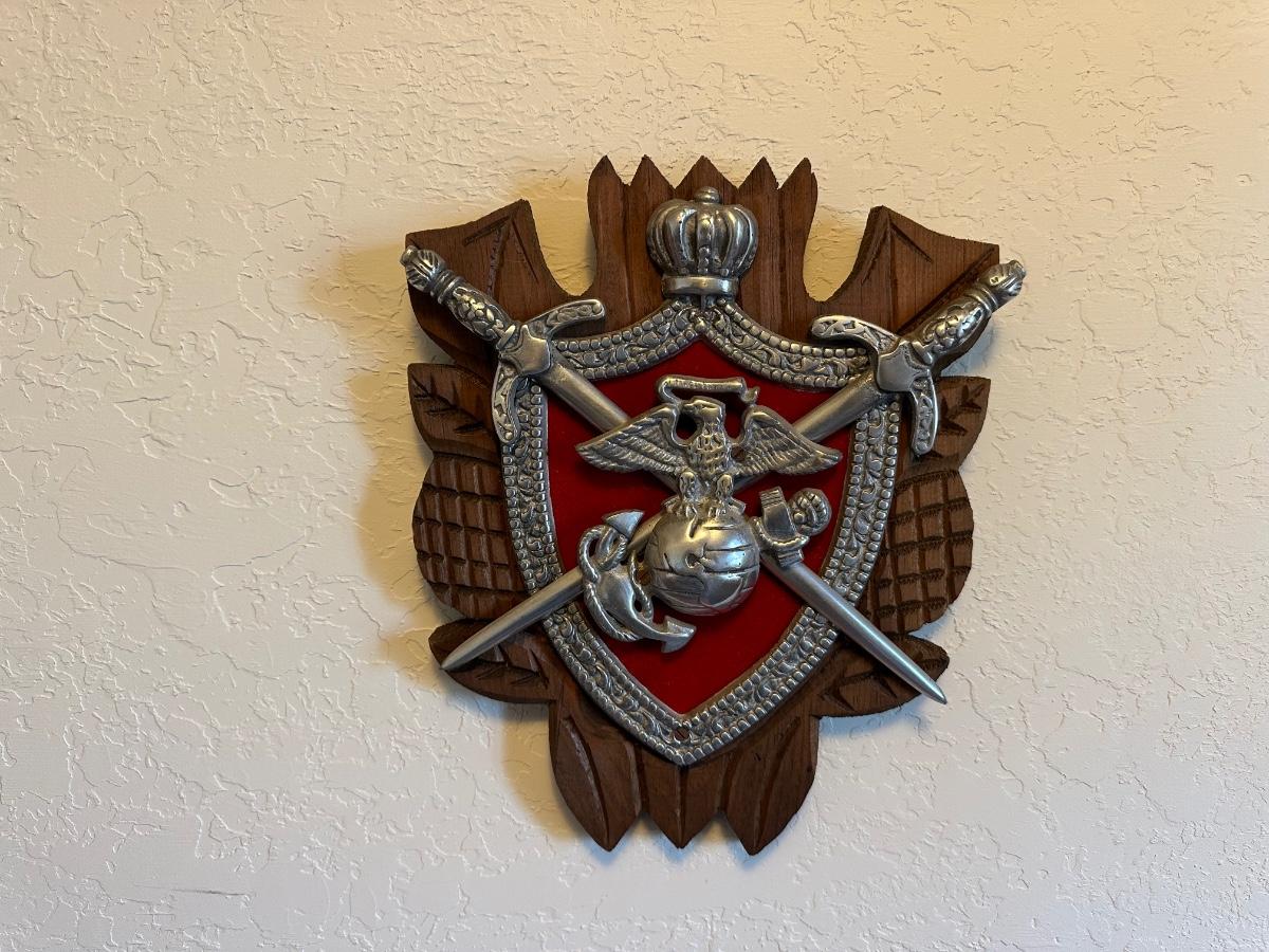 US NAVY WALL HUNG SEAL, PHOTO, US FLAG ON POLE AND A SMALL SHELF