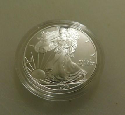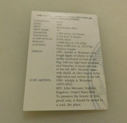 U.S. One Troy Ounce 1996 P Fine .999% Silver Eagle $1 Coin UNC in Velvet Box Case