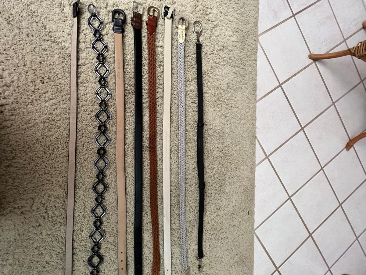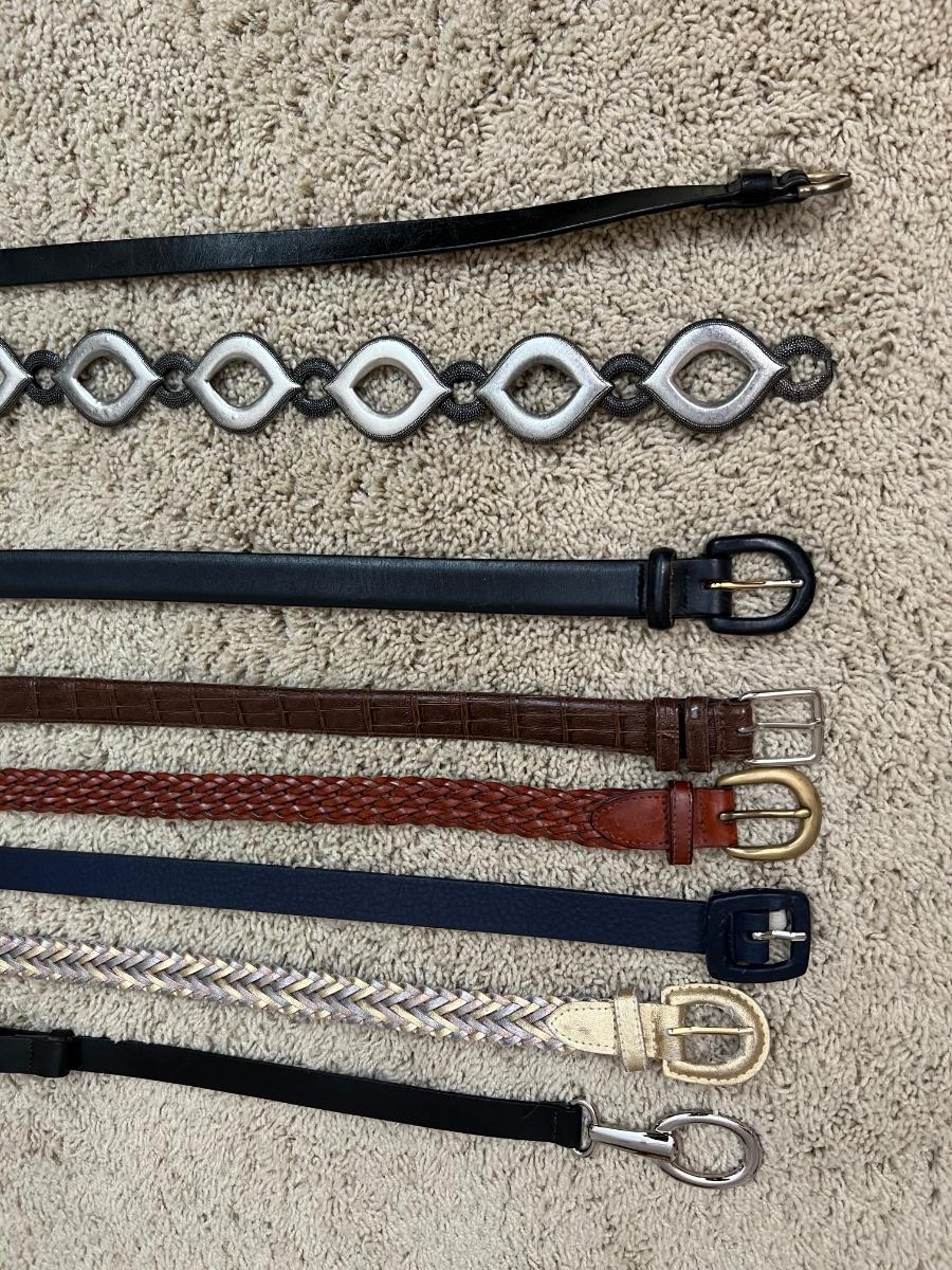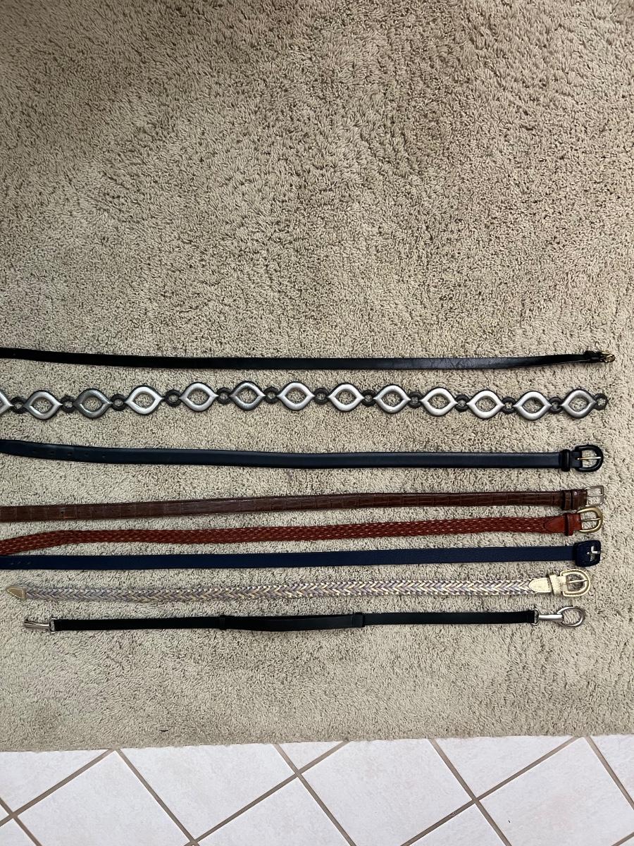 16 scarves includes pure silk and a U.S. Sherpa brand scarf plus more. The eight belts come in a range of sizes, from 35”-42”, mostly leather like, with one Coldwater Creek that is genuine leather and also a metal belt. See images for any labels found on scarves and brands and sizes of the belts. Hangers in photos are included.
