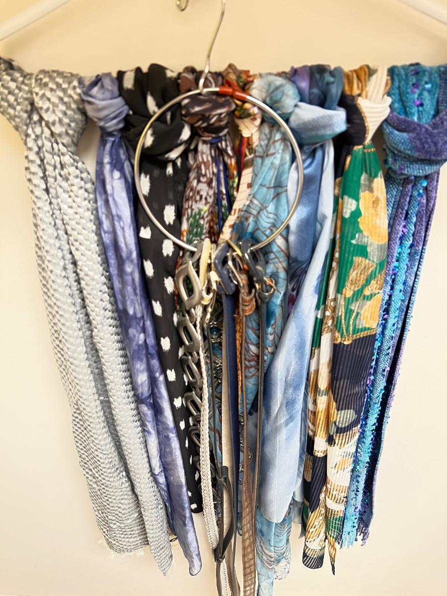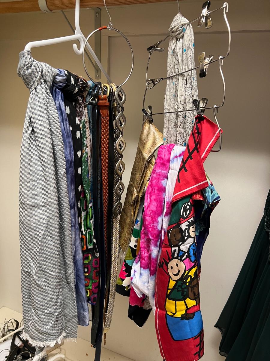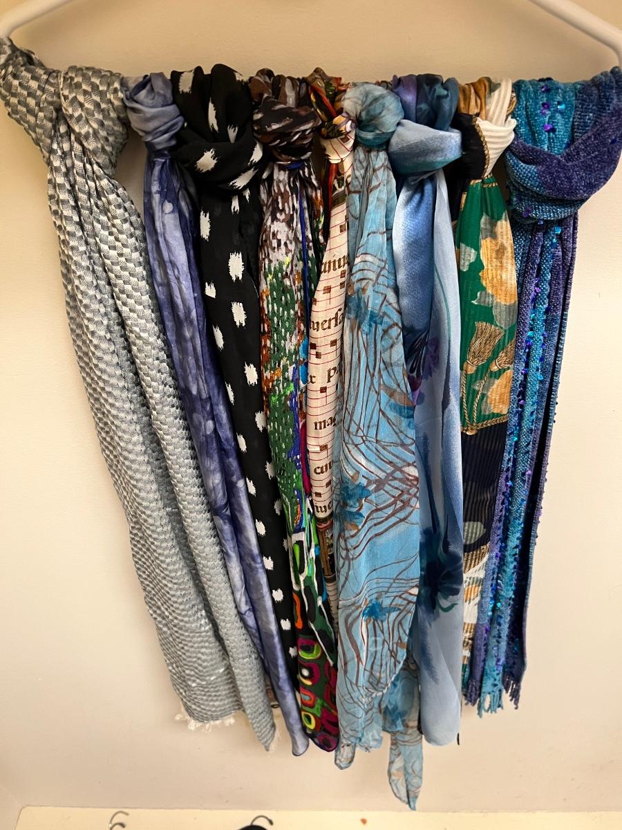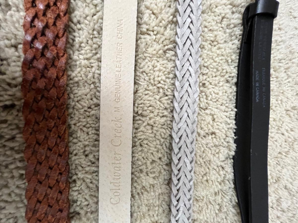 16 scarves includes pure silk and a U.S. Sherpa brand scarf plus more. The eight belts come in a range of sizes, from 35”-42”, mostly leather like, with one Coldwater Creek that is genuine leather and also a metal belt. See images for any labels found on scarves and brands and sizes of the belts. Hangers in photos are included.