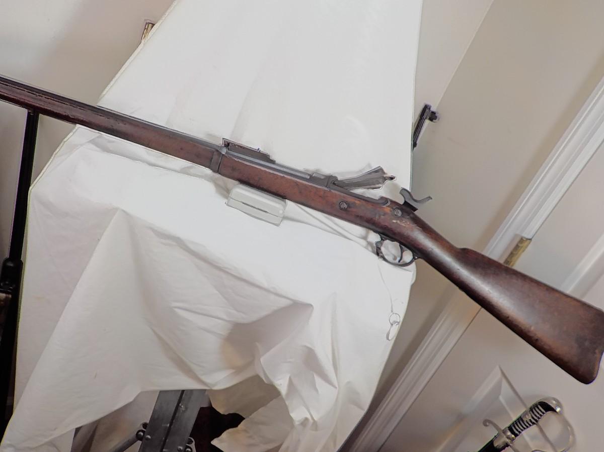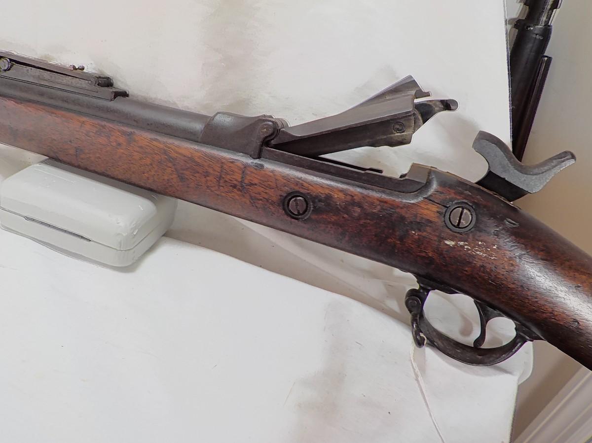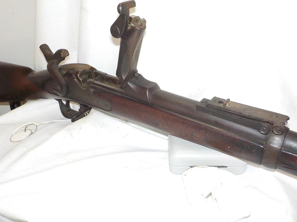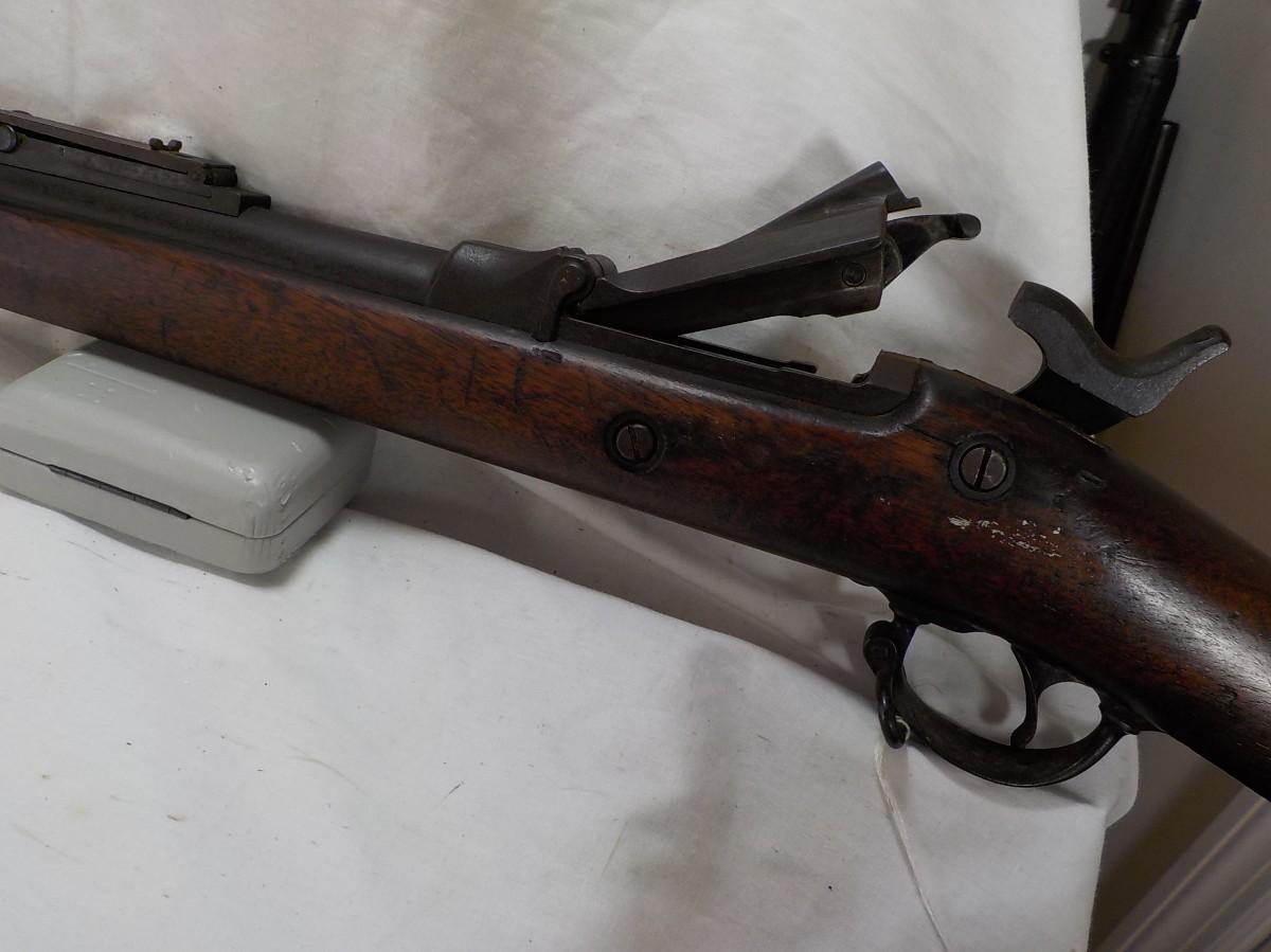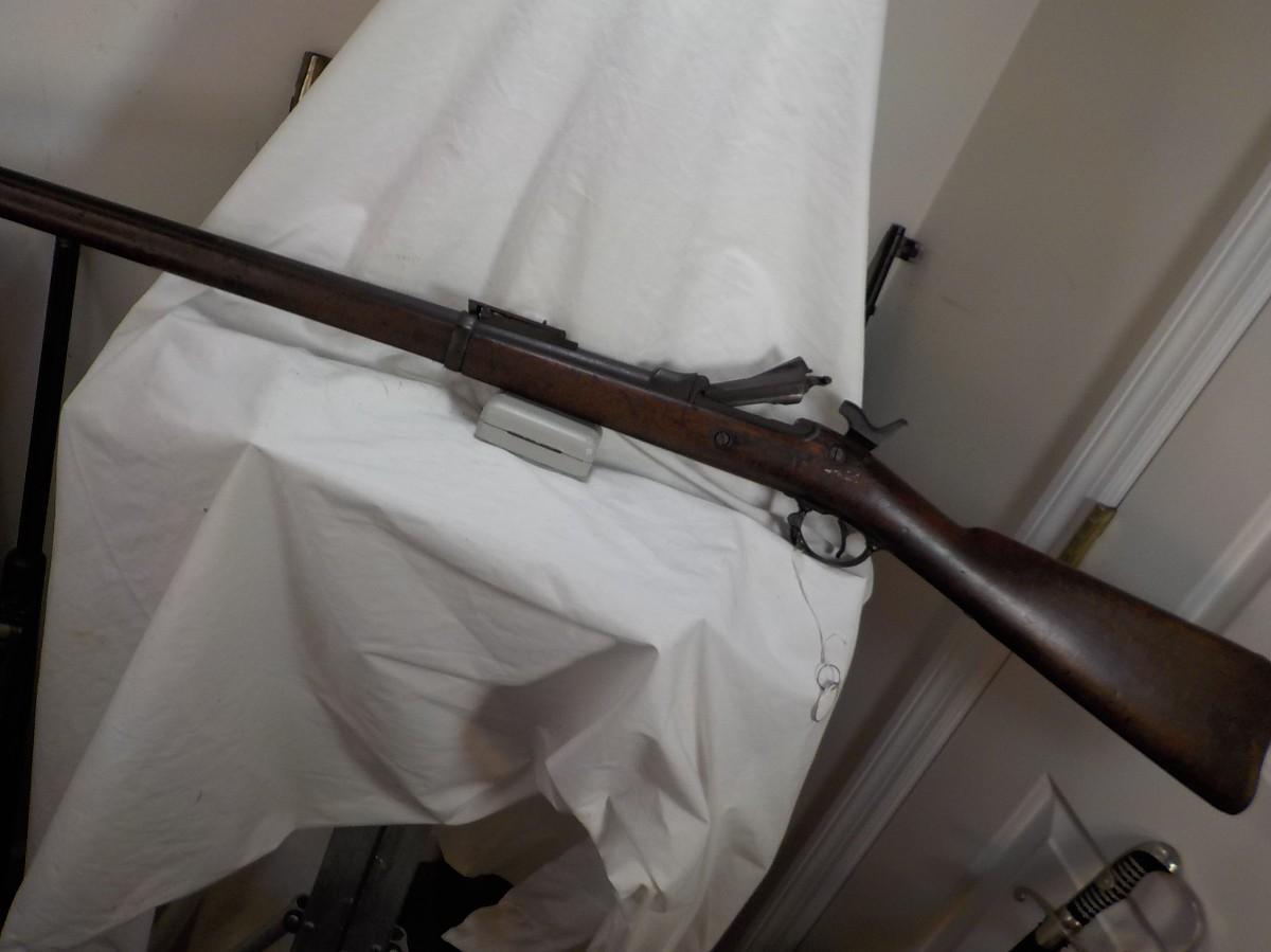 This is the real deal 1884 trap door springfield, .45 cal, uses 70 grains of black powder and a bullet weighting405 grains.