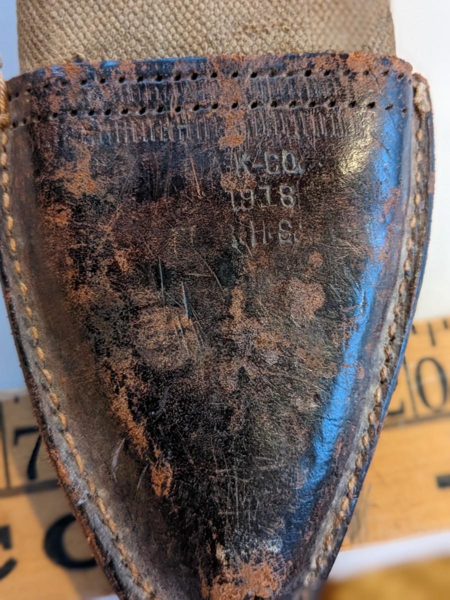 Very nice US WW1 bolo knife made by “Plumb, St. Louis” dated “1918” the nice webbing/leather made scabbard maker marked “Fred Medart MFG Co. and dated “1918” as well.