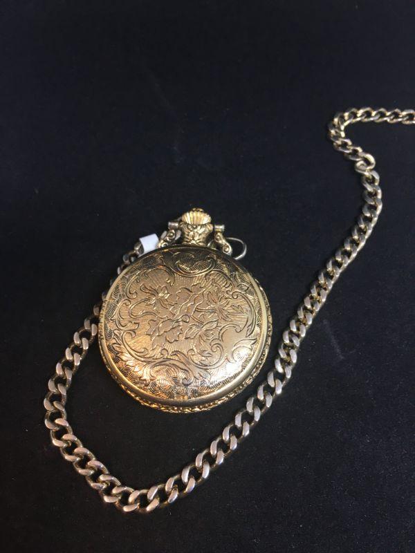 This pocket watch has a half dollar as its face. Its still in good condition and comes with a chain.