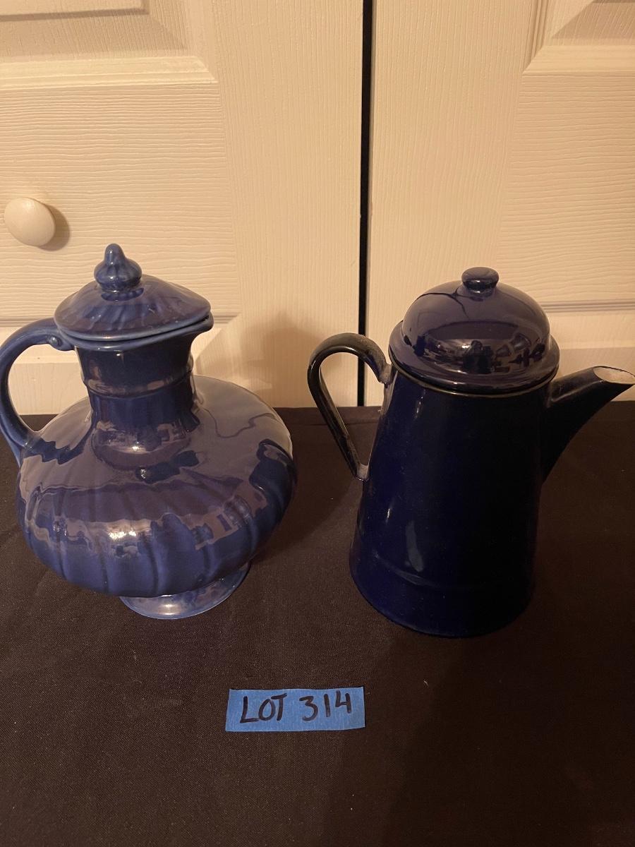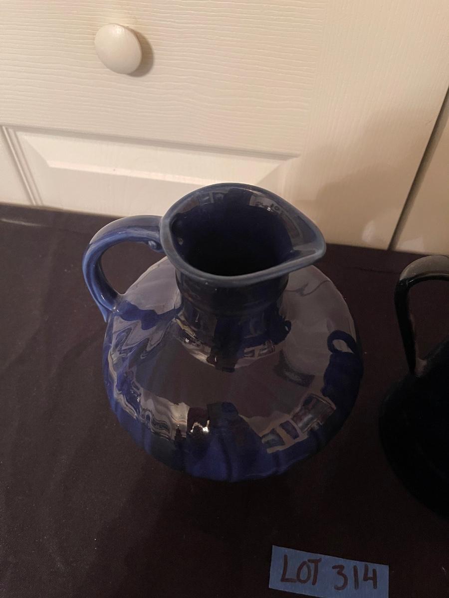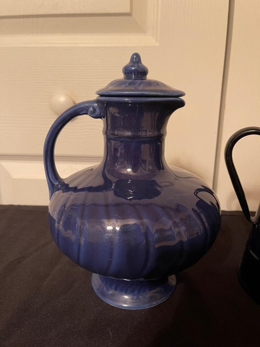 USA made vintage pottery pitcher with lid & blue pitcher