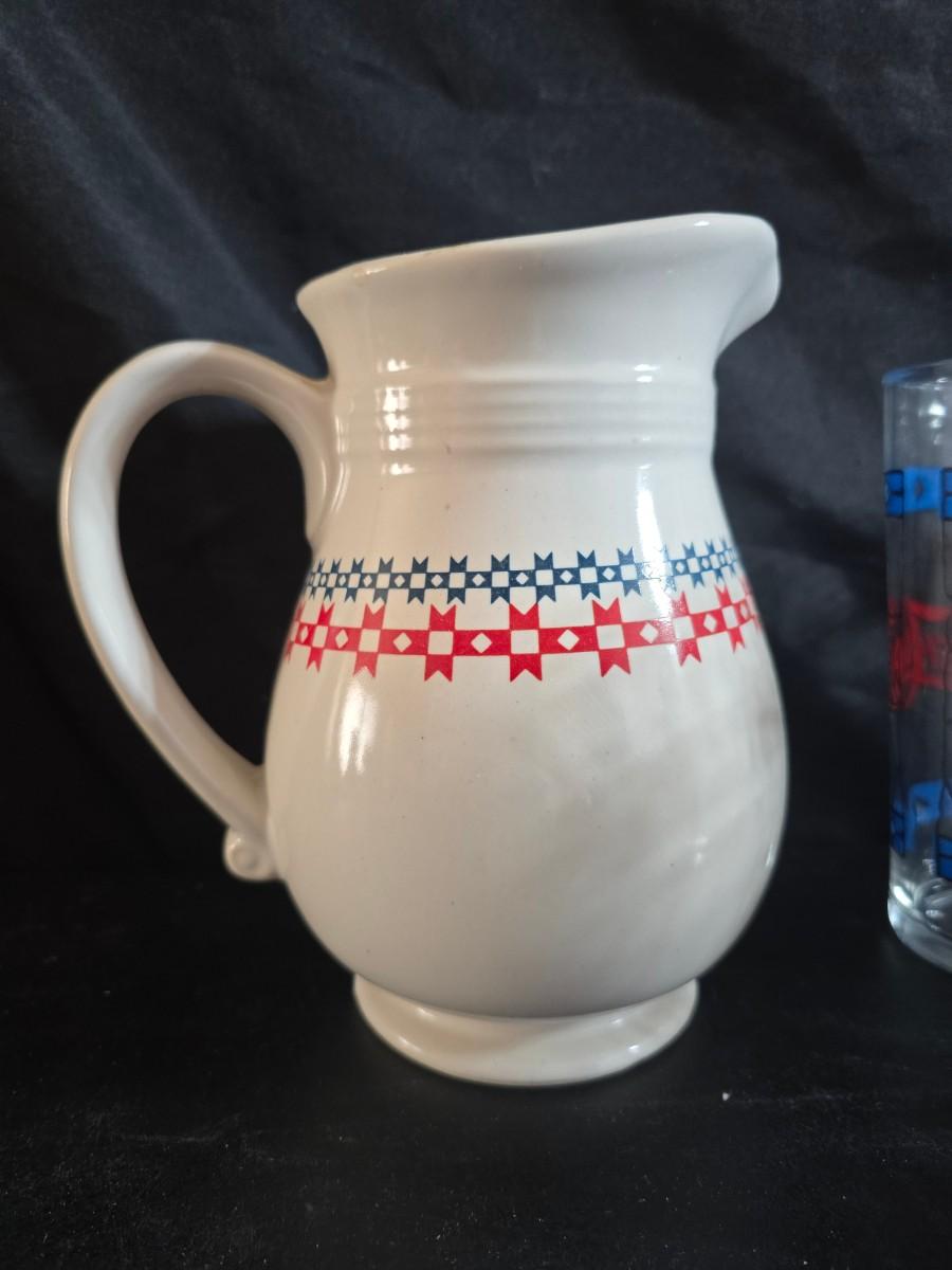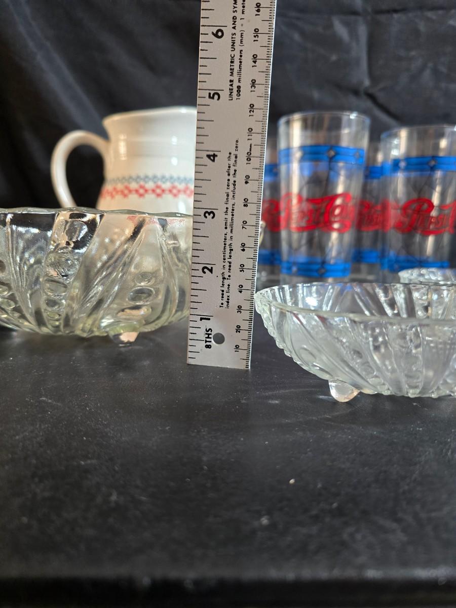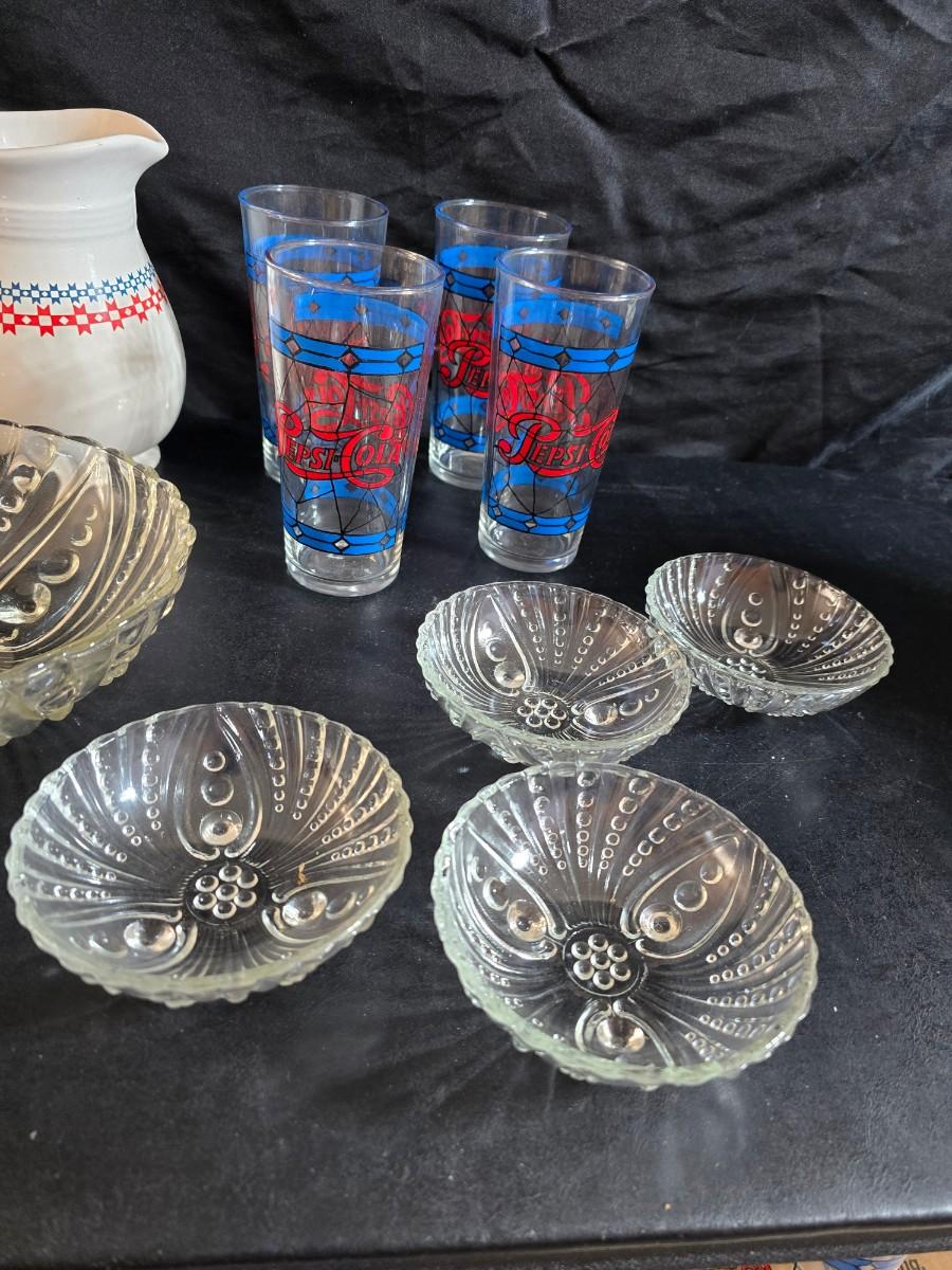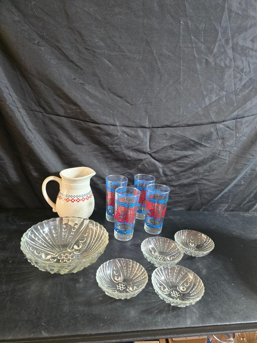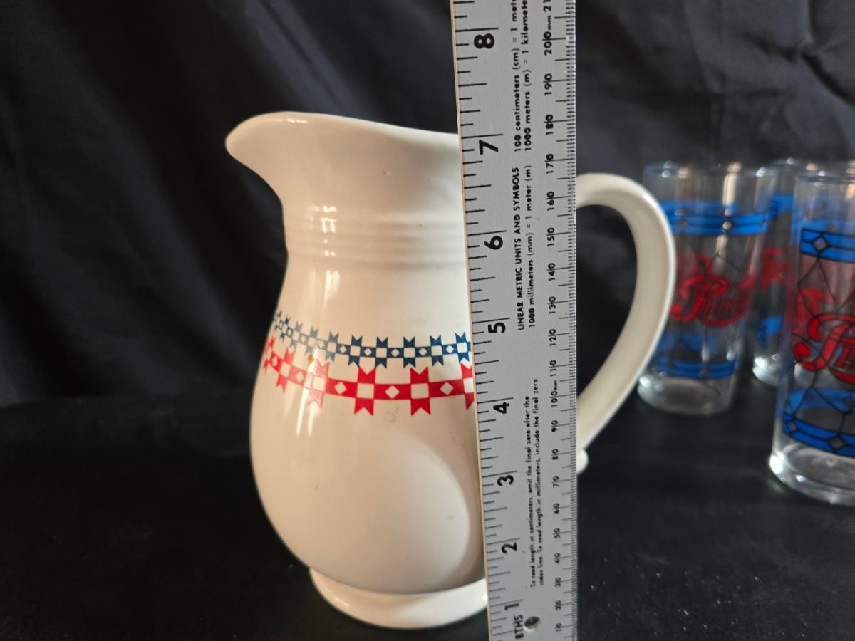USA Marked commemorative dairy pitcher - with Pepsi-stained glass like glasses and vintage glass bowls