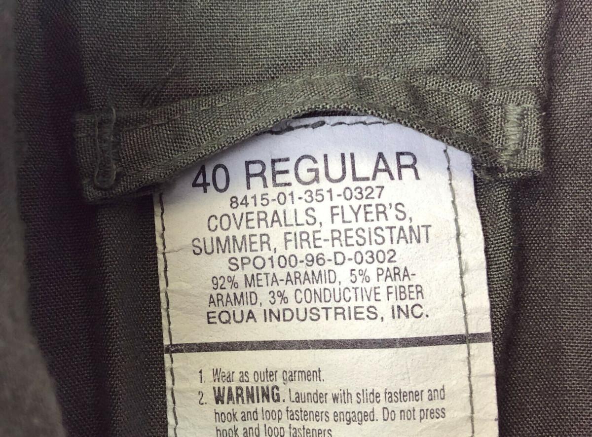 Very light use on this original military issue Fire-Resistant Summer Flyer's Coveralls...Belonged to a U.S. Air Force Major...Cloth insignias on both shoulders...Made of fire resistant aramid material this flight suit is Size 40 Regular...Full length from collar 59"...Chest 20"..Sleeves 29"...Made by Equa Industries, Inc...As shown.