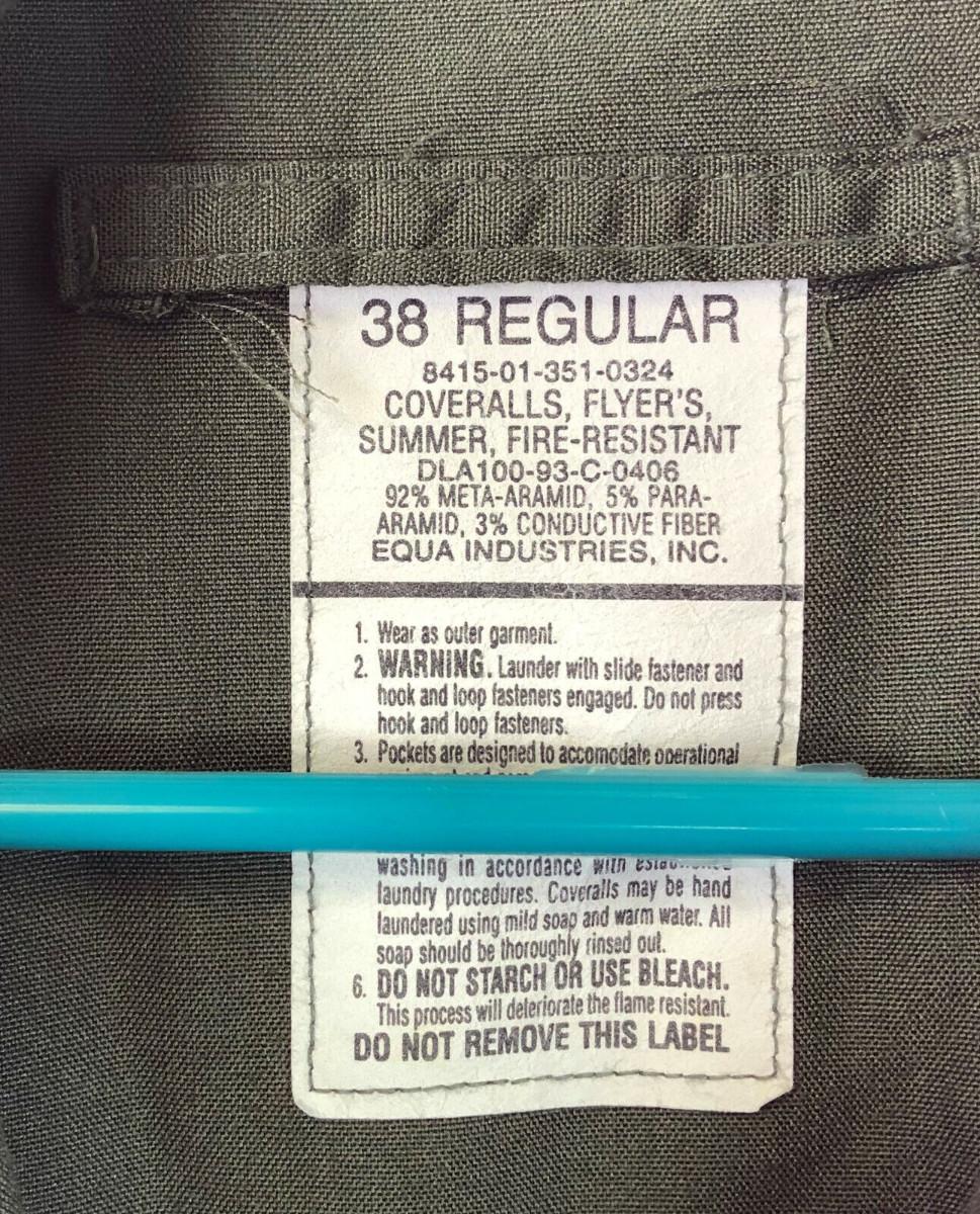 Very light use on this original military issue Fire-Resistant Summer Flyer's Coveralls...Belonged to a U.S. Airforce Major...Cloth insignias on both shoulders...Made of fire resistant aramid material this flight suit is Size 38 Regular...Full length from collar 60"...Chest 19"..Sleeves 29"..Waist 34-36"...Made by Equa Industries, Inc...As shown.