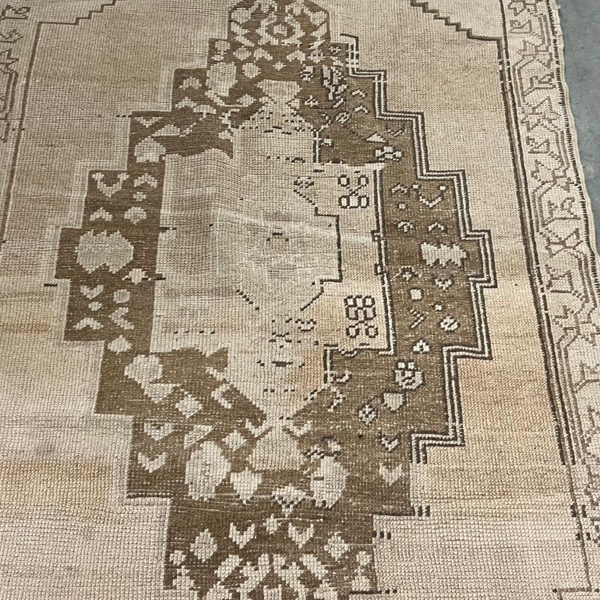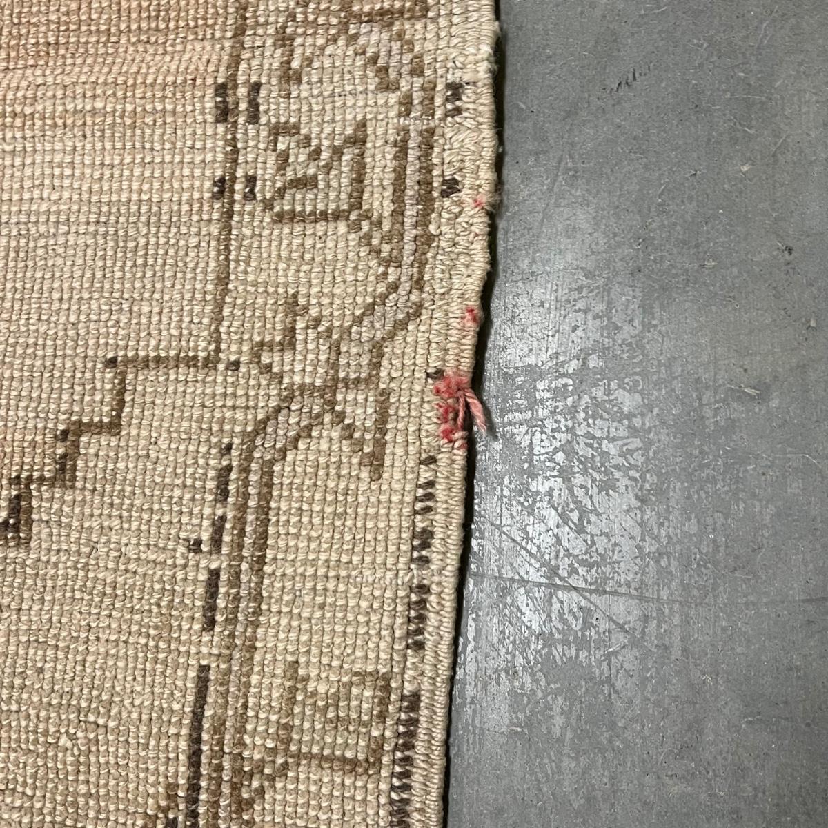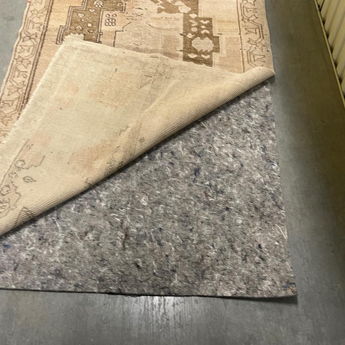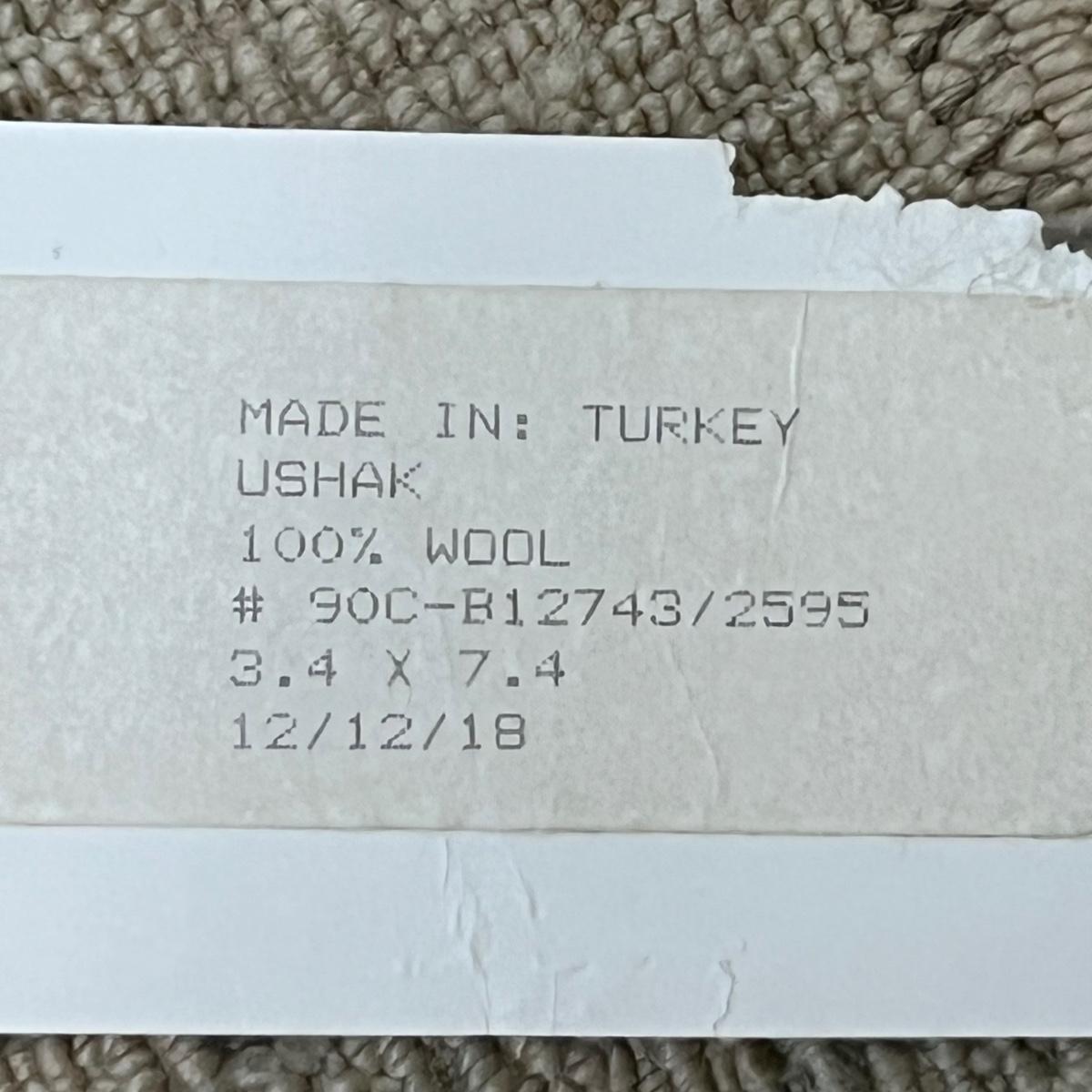 The label attached to this rug states that it is 100% wool. It appears that some of the design has faded, see images of where areas no longer have a dark brown color and there is a small blemish and tear on a side edge shown in pics as well. Pad for rug is included.