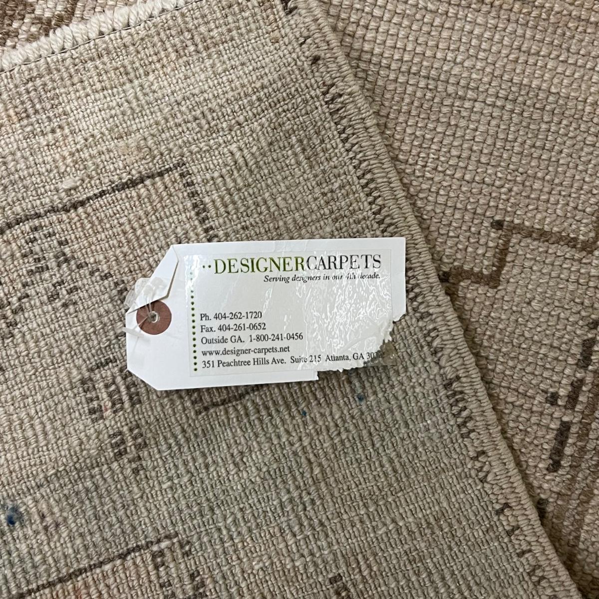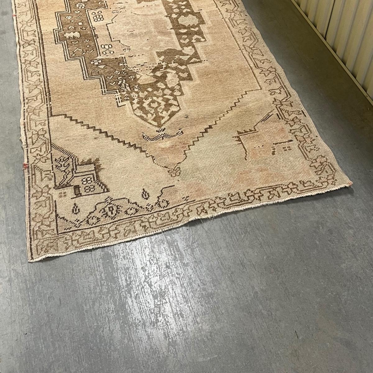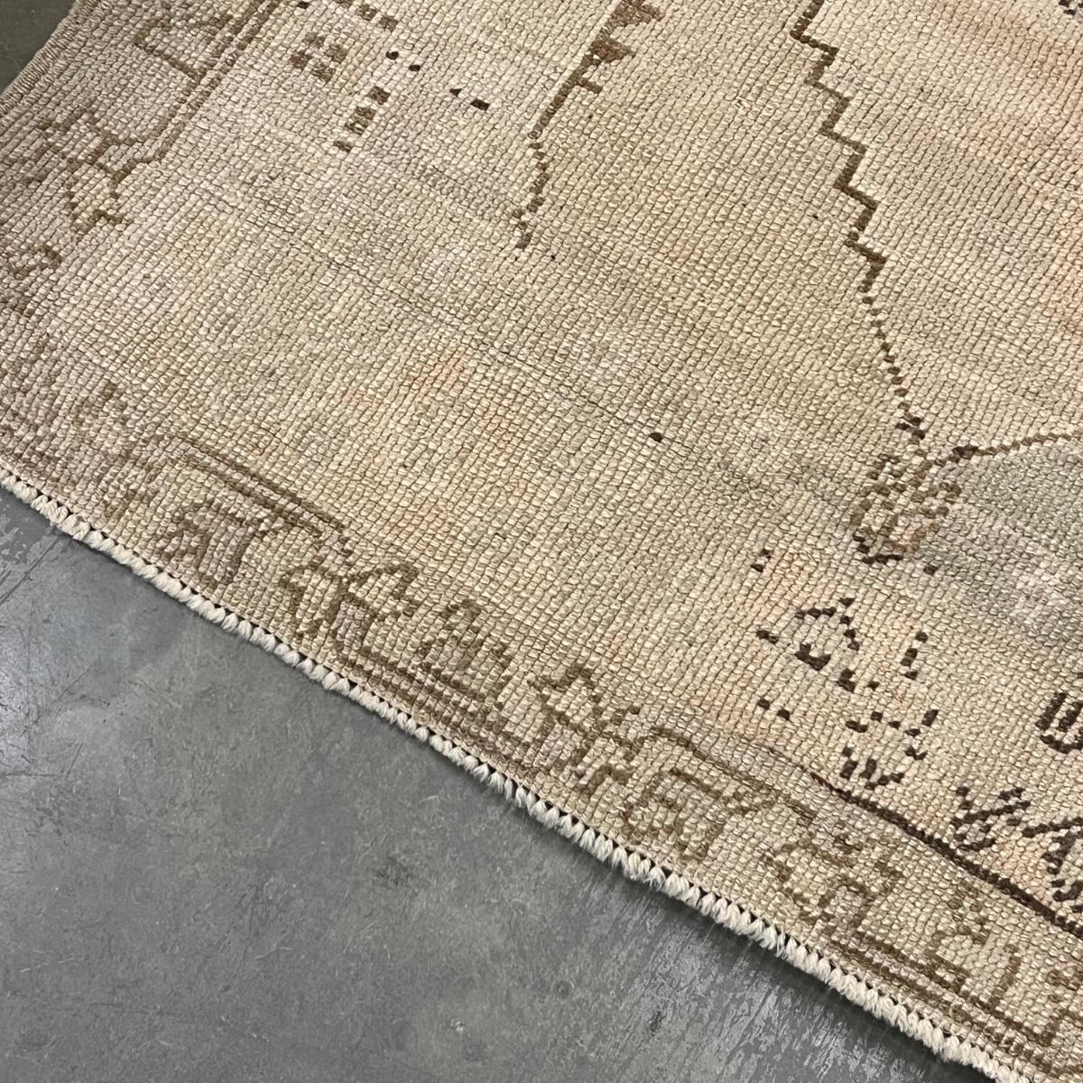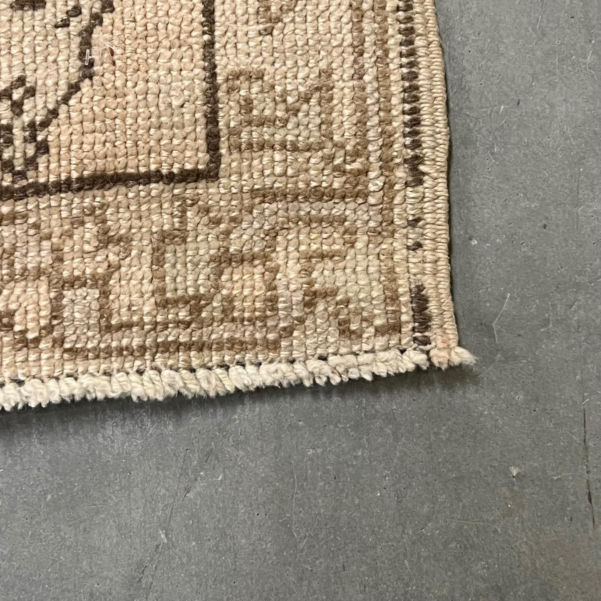 The label attached to this rug states that it is 100% wool. It appears that some of the design has faded, see images of where areas no longer have a dark brown color and there is a small blemish and tear on a side edge shown in pics as well. Pad for rug is included.