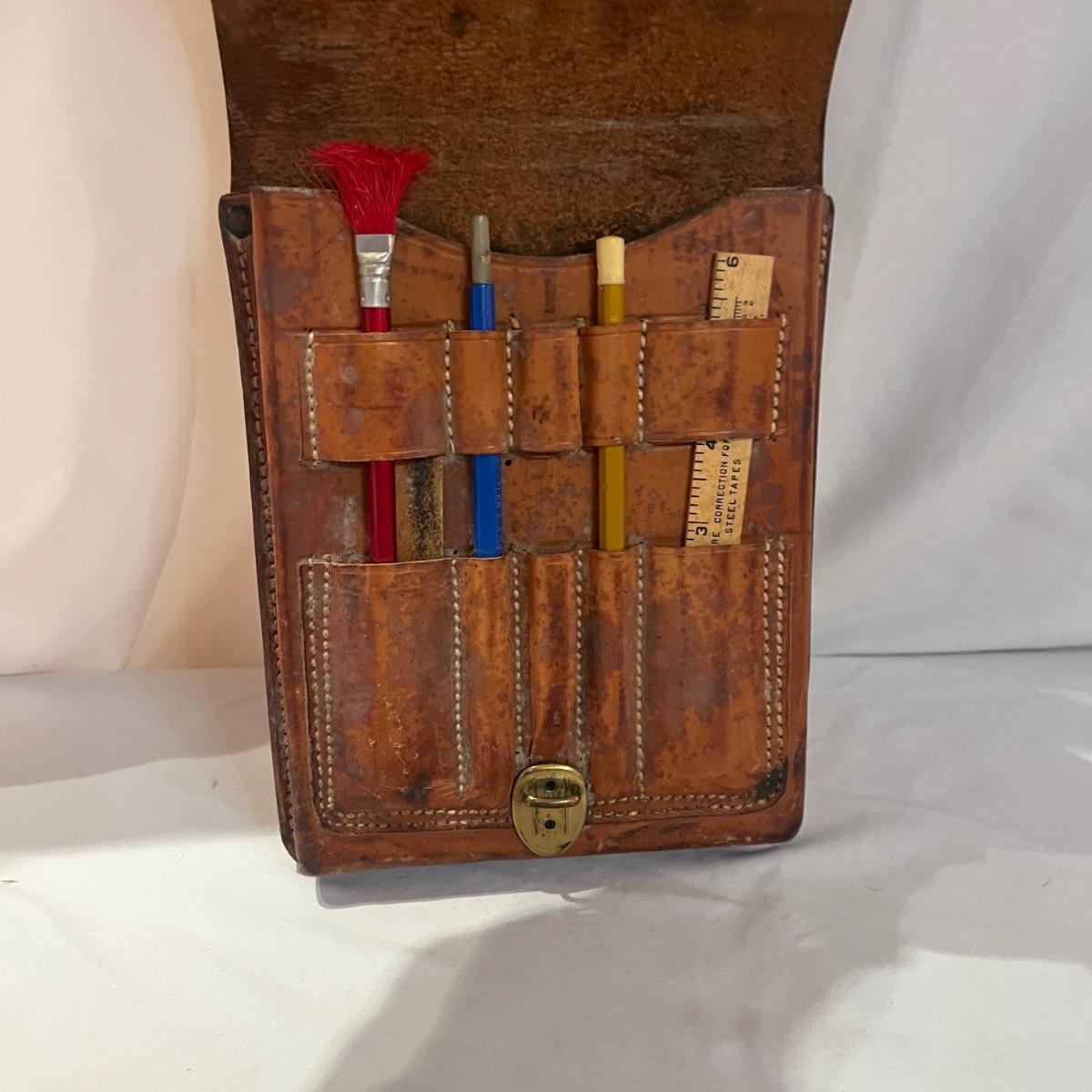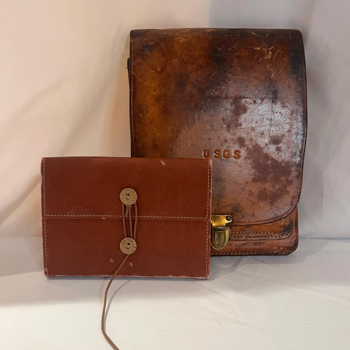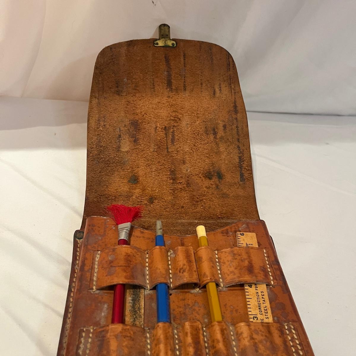 Lot includes a USGS leather field case with scribe, pen, pencil and six inch ruler. Also includes a Windsor & Newton leather covered journal. A page or two has been drawn on, but the majority are blank. Field case measures 7” x 1.5” x 9”H.