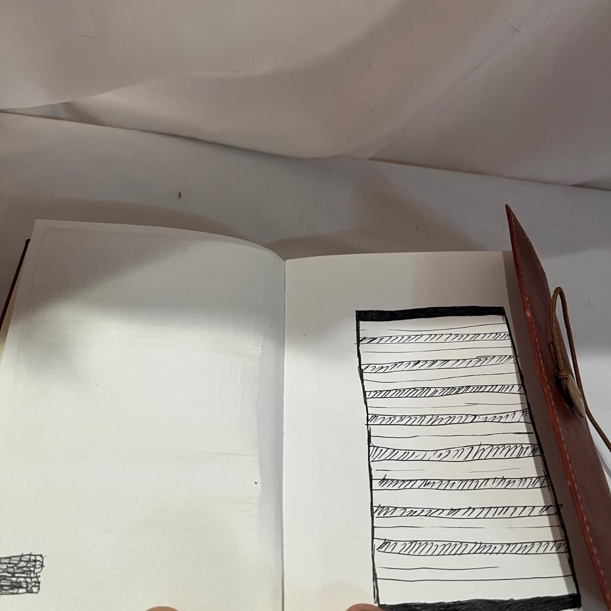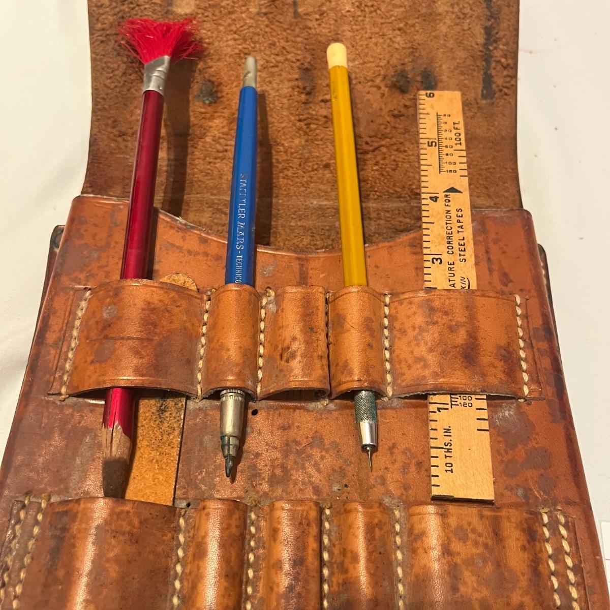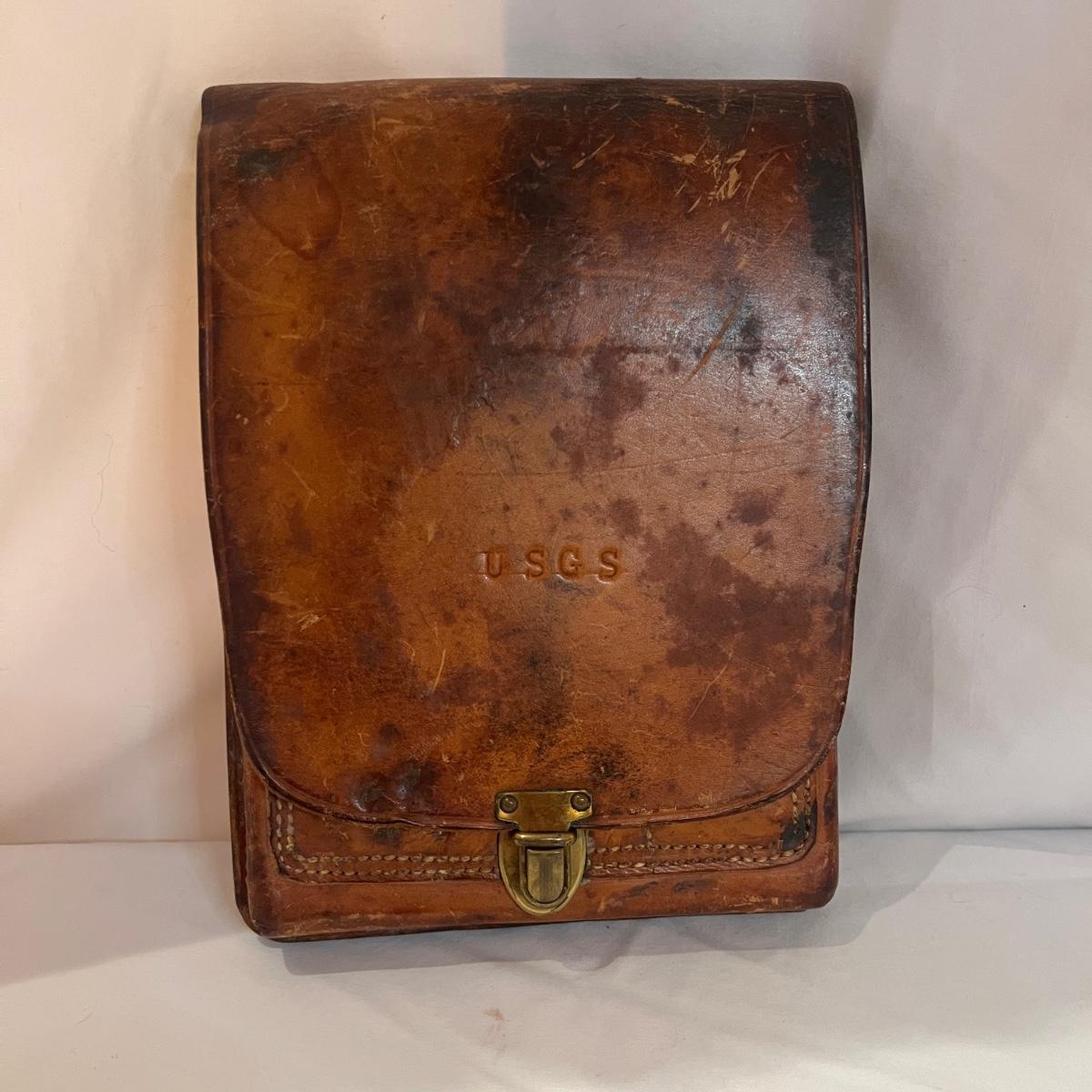 Lot includes a USGS leather field case with scribe, pen, pencil and six inch ruler. Also includes a Windsor & Newton leather covered journal. A page or two has been drawn on, but the majority are blank. Field case measures 7” x 1.5” x 9”H.