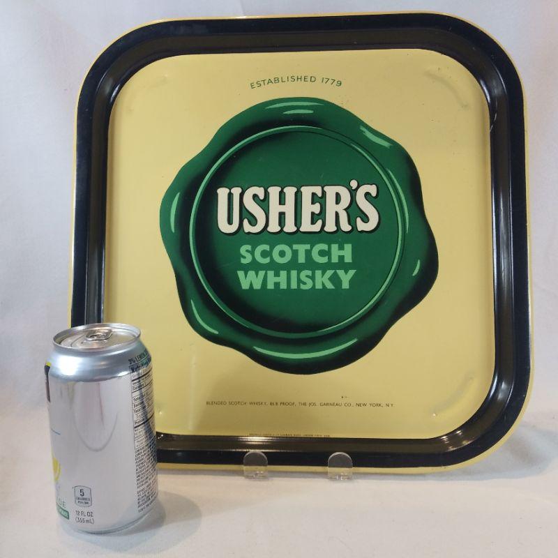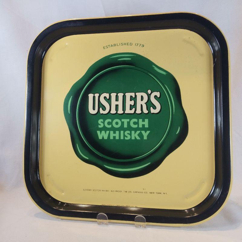 Vintage Usher's Scotch Whisky Tin Serving Tray made in London. "Blended Scotch Whisky" sits proudly in the classic green disk, marked 86.8 Proof - The Jos. Garneaus Co., New York, NY. Established in 1779. It measures 13 3/4-inches square. Tray is in remarkably good condition for its age - no serious scratches or big dents.