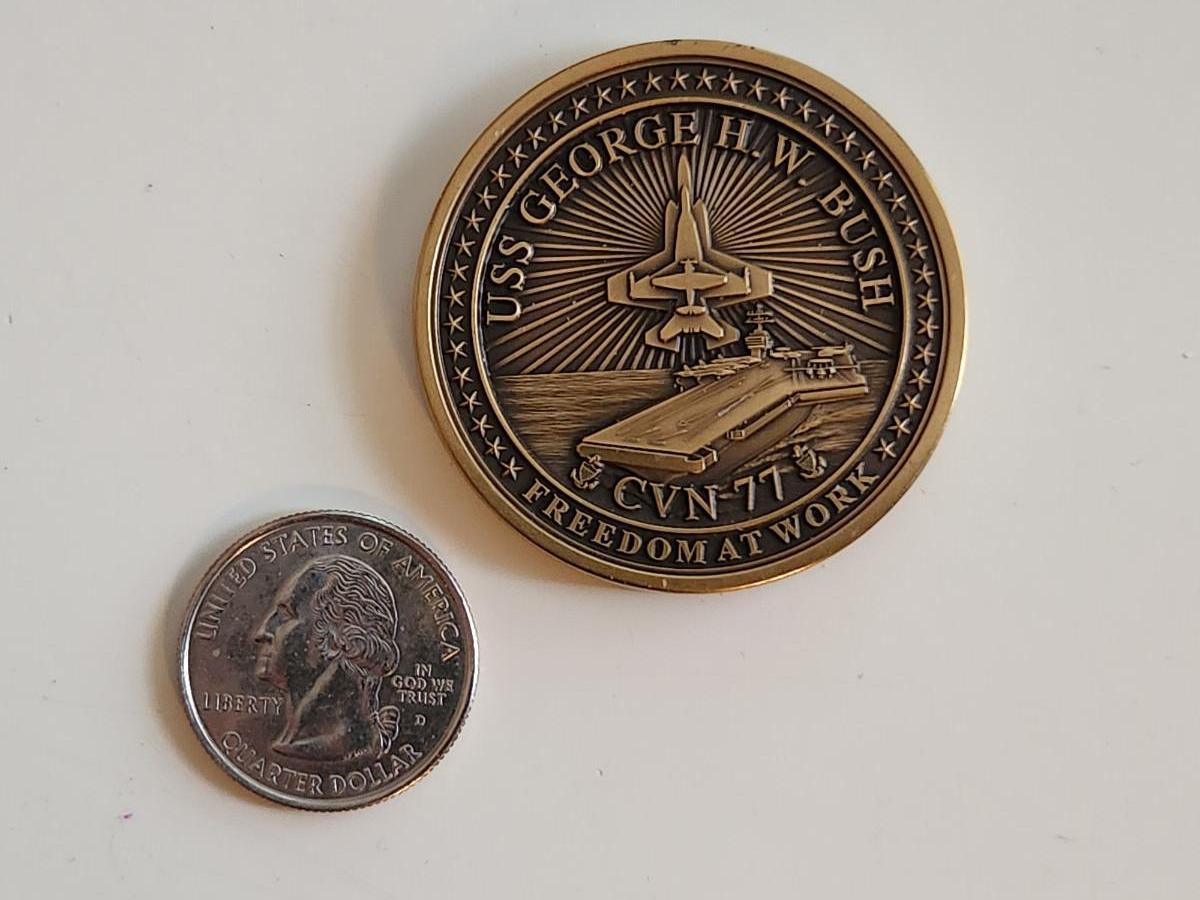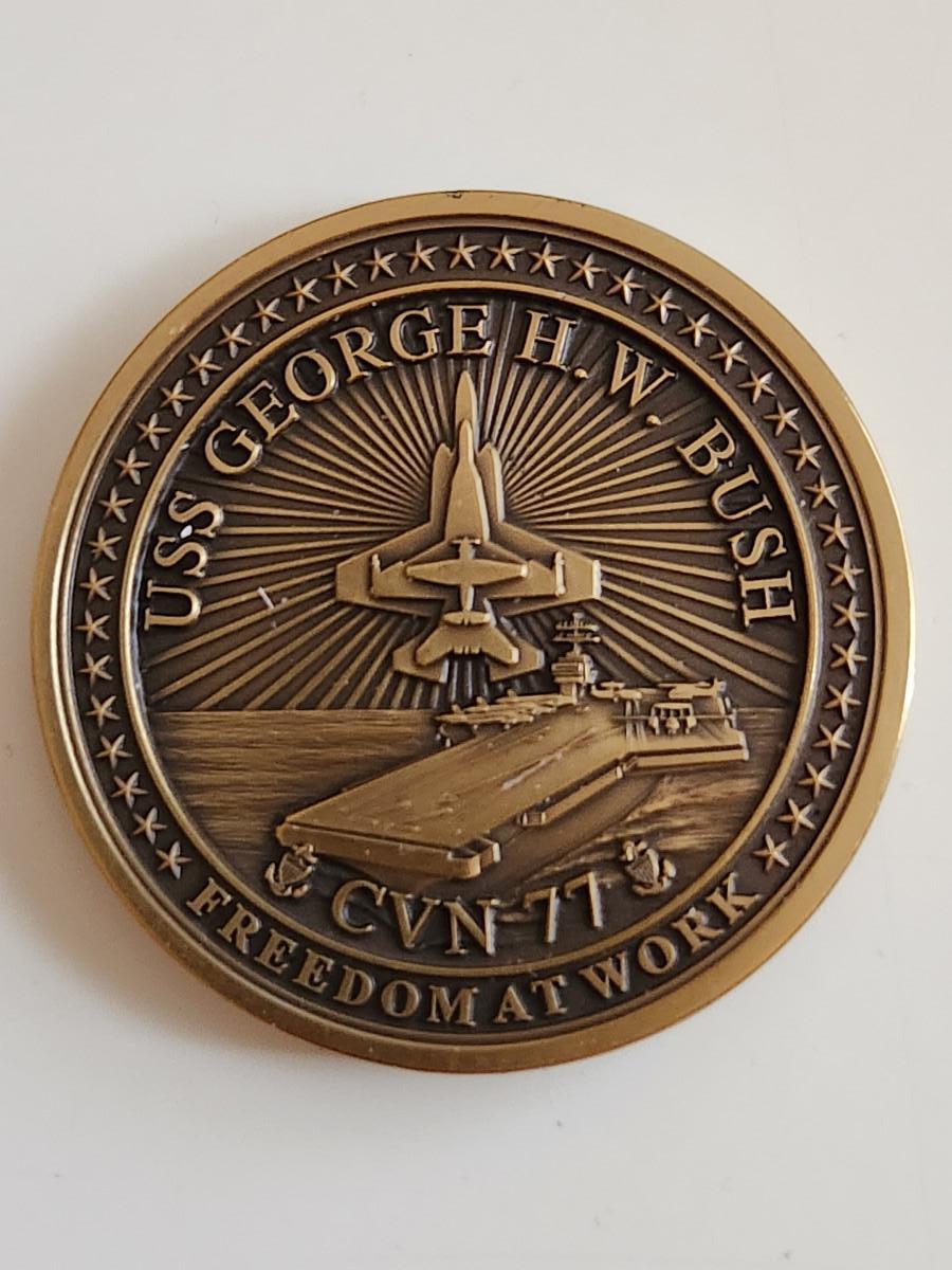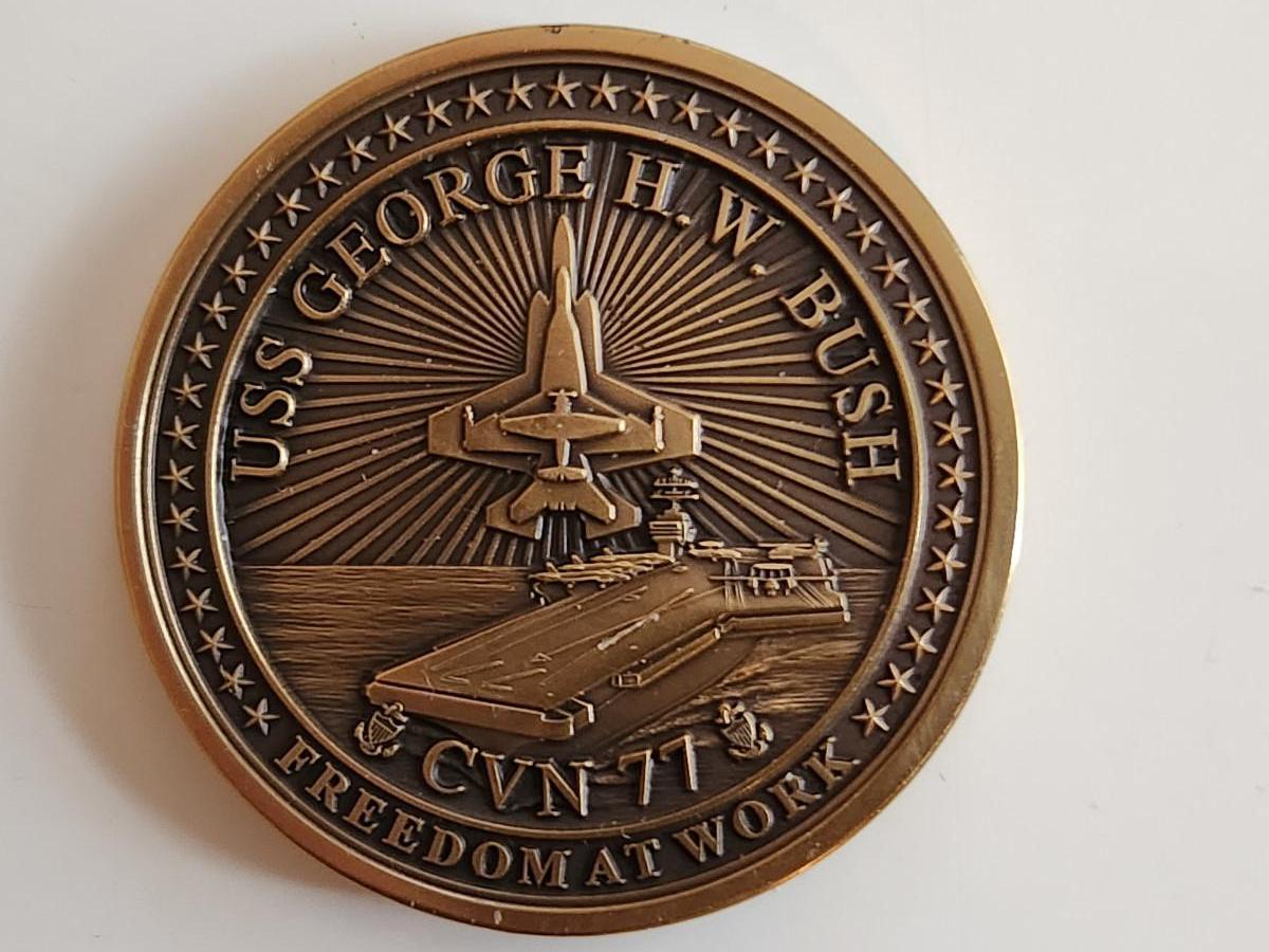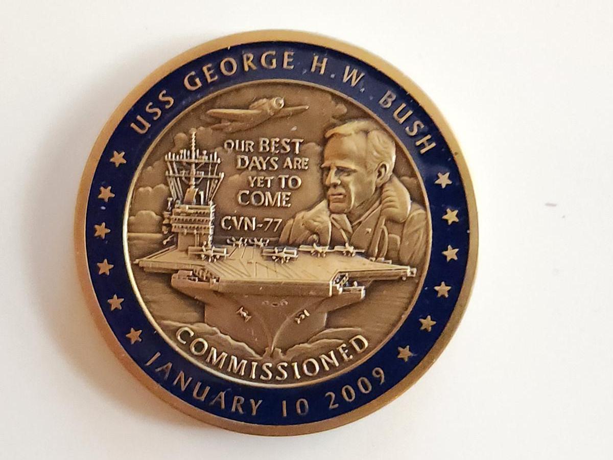 This auction lot is for a USS Bush Commissioned Commemorative Medallion. This medallion was struck to commemorate the commissioning of the USS George H.W. Bush Aircraft Carrier CVN-77. Dated January 10, 2009. Nice military and/or presidential collectors item.