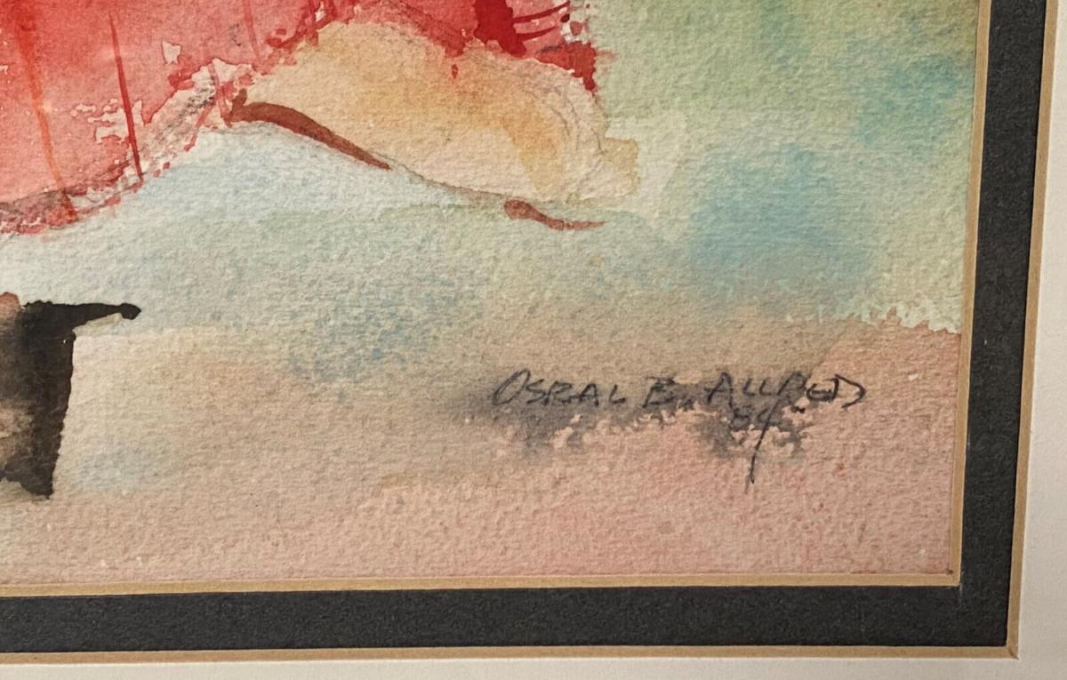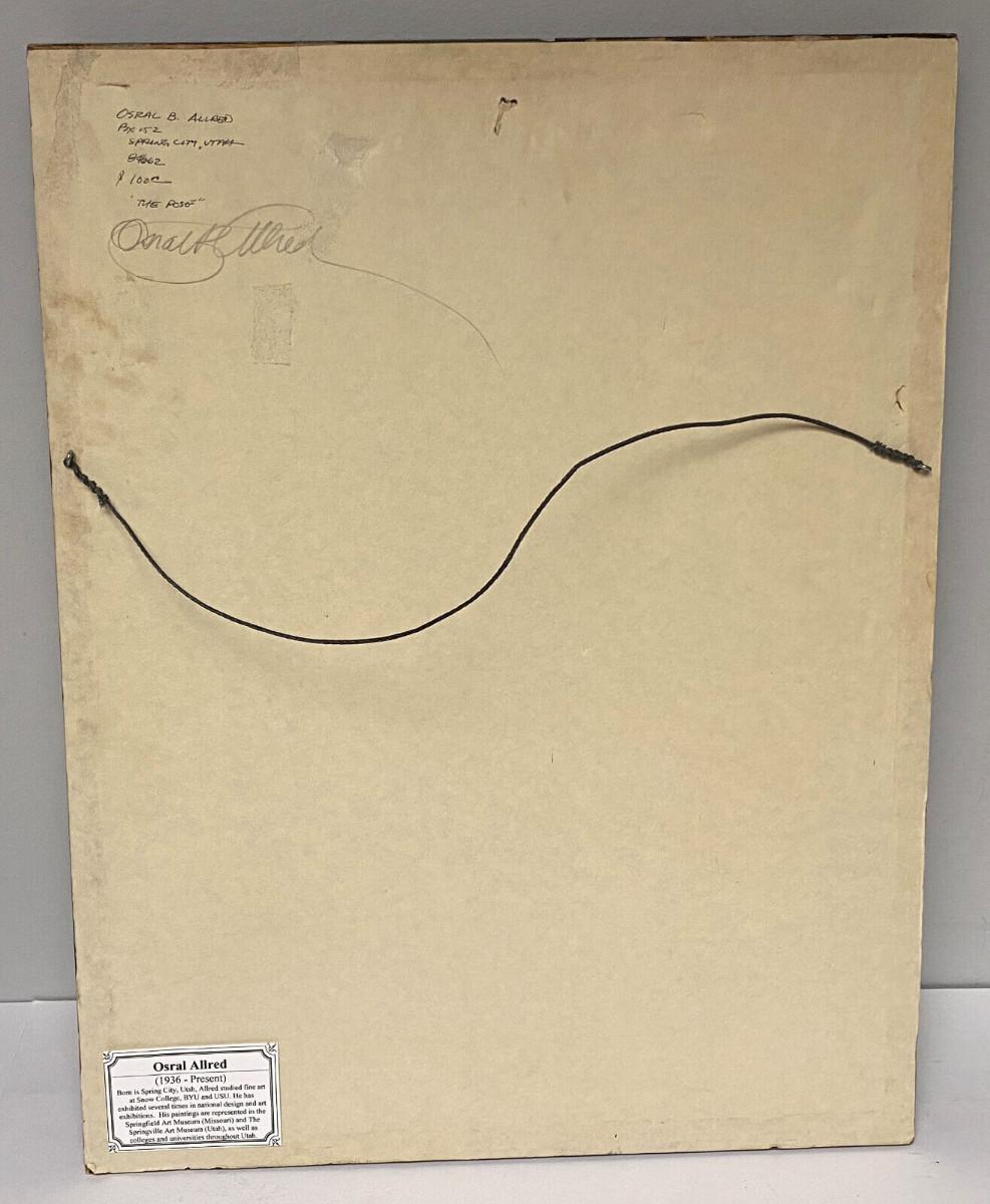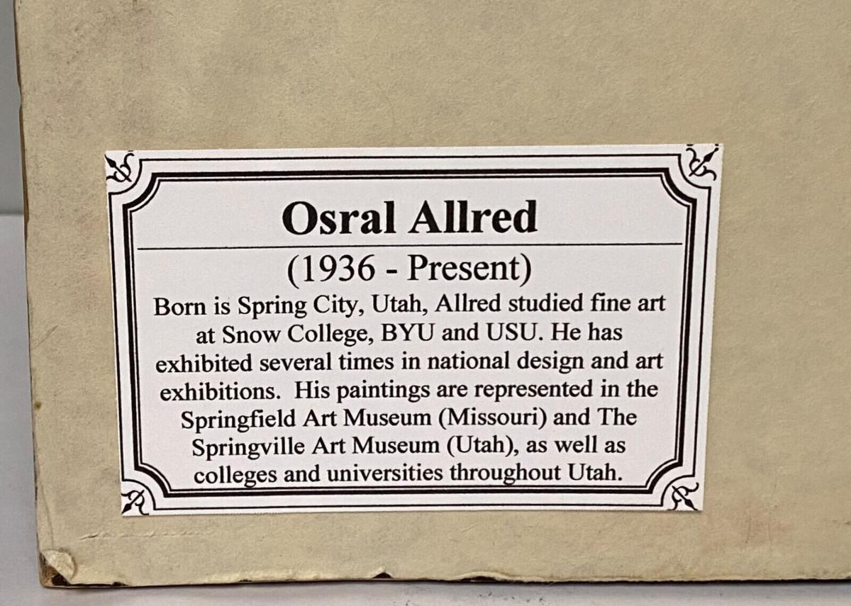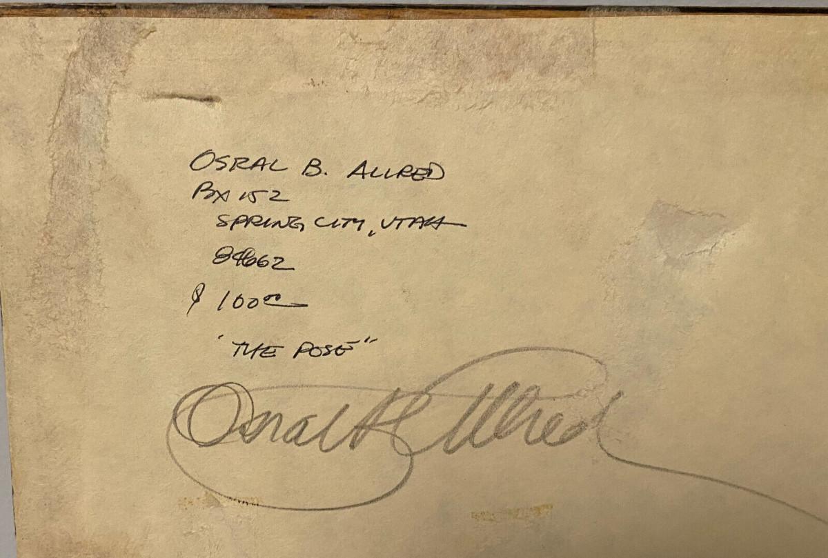 His favorite subjects included people, buildings and machinery as well as landscapes..here is "The Pose" by Osral B. Allred (1936-2014) a watercolorist from Spring City, Utah...Signed and dated in 1984..framed, under glass...22x17 inches...Image 14.5x10"...Osral B. Allred was born in Spring City in 1936. He attended Snow College, Brigham Young University and graduated from Utah State University in 1963 with a Bachelor's of Fine Arts. Later, in 1968, he graduated with a Master's of Fine Arts from Utah State University..He retired in 2000 as an Art Professor from Snow College where he taught...Excellent condition on this estate find.