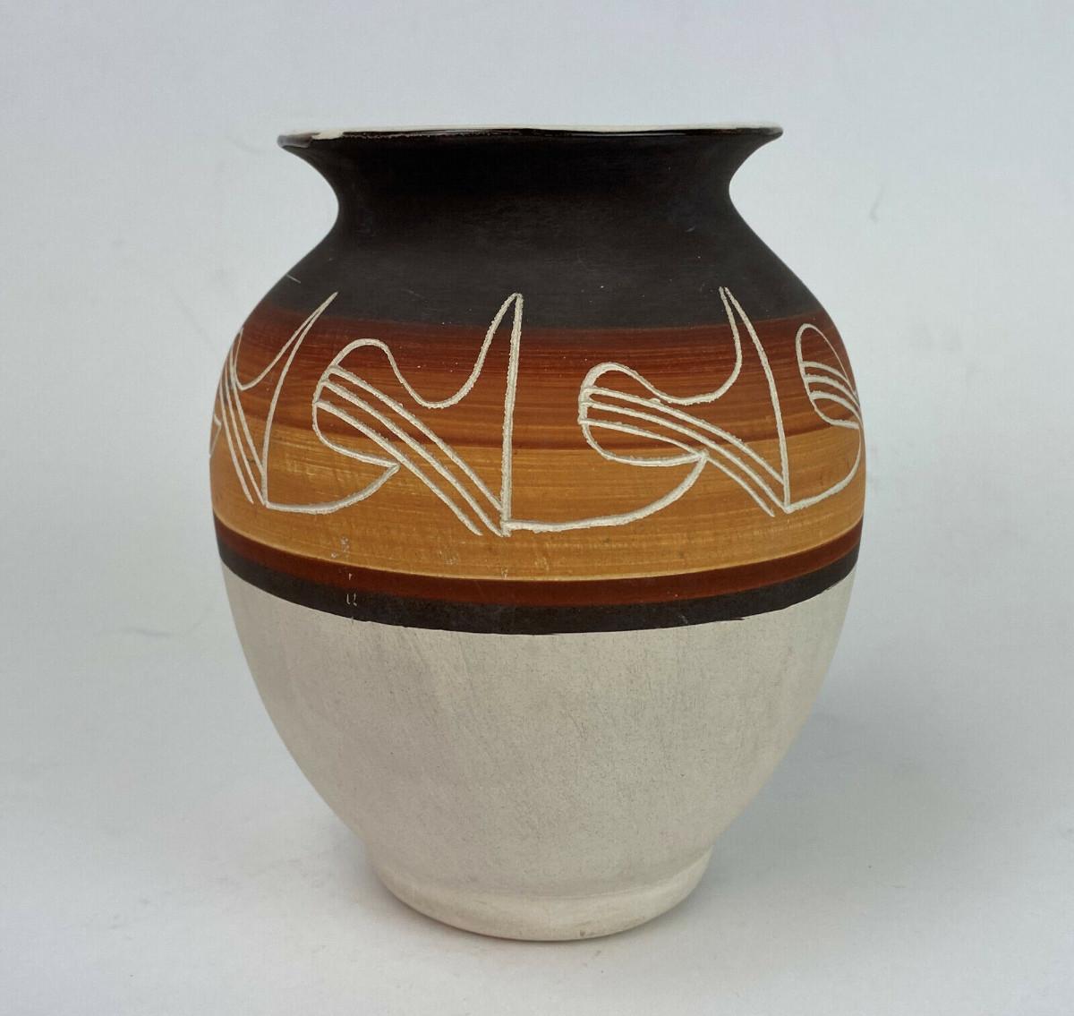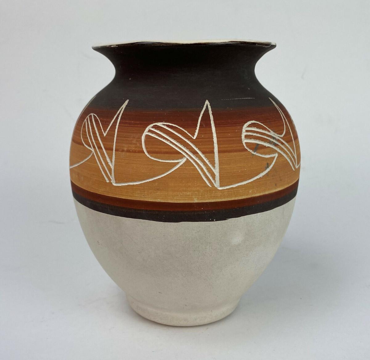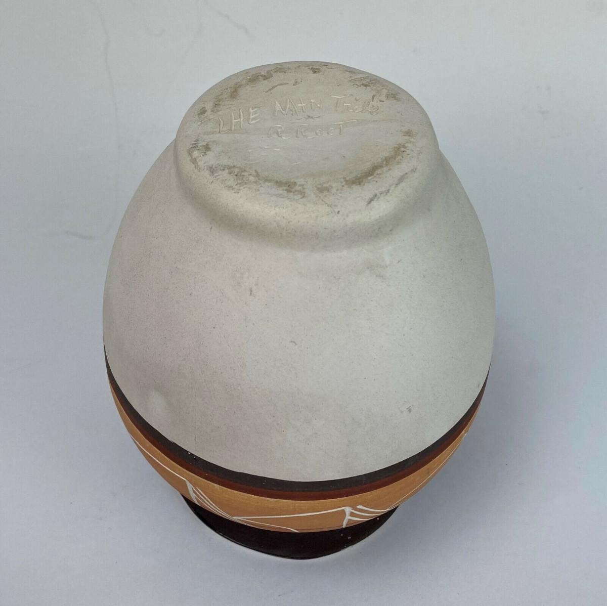 A nice blend of traditional and modern on this 6.25" high pottery jar by the Ute Mountain Indian Tribe at Towaoc in Colorado...Hand decorated and signed R. Root for Ruth I believe...Offered with no reserve...