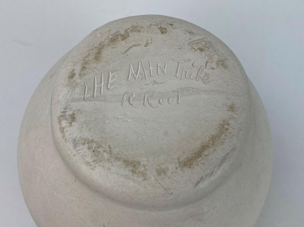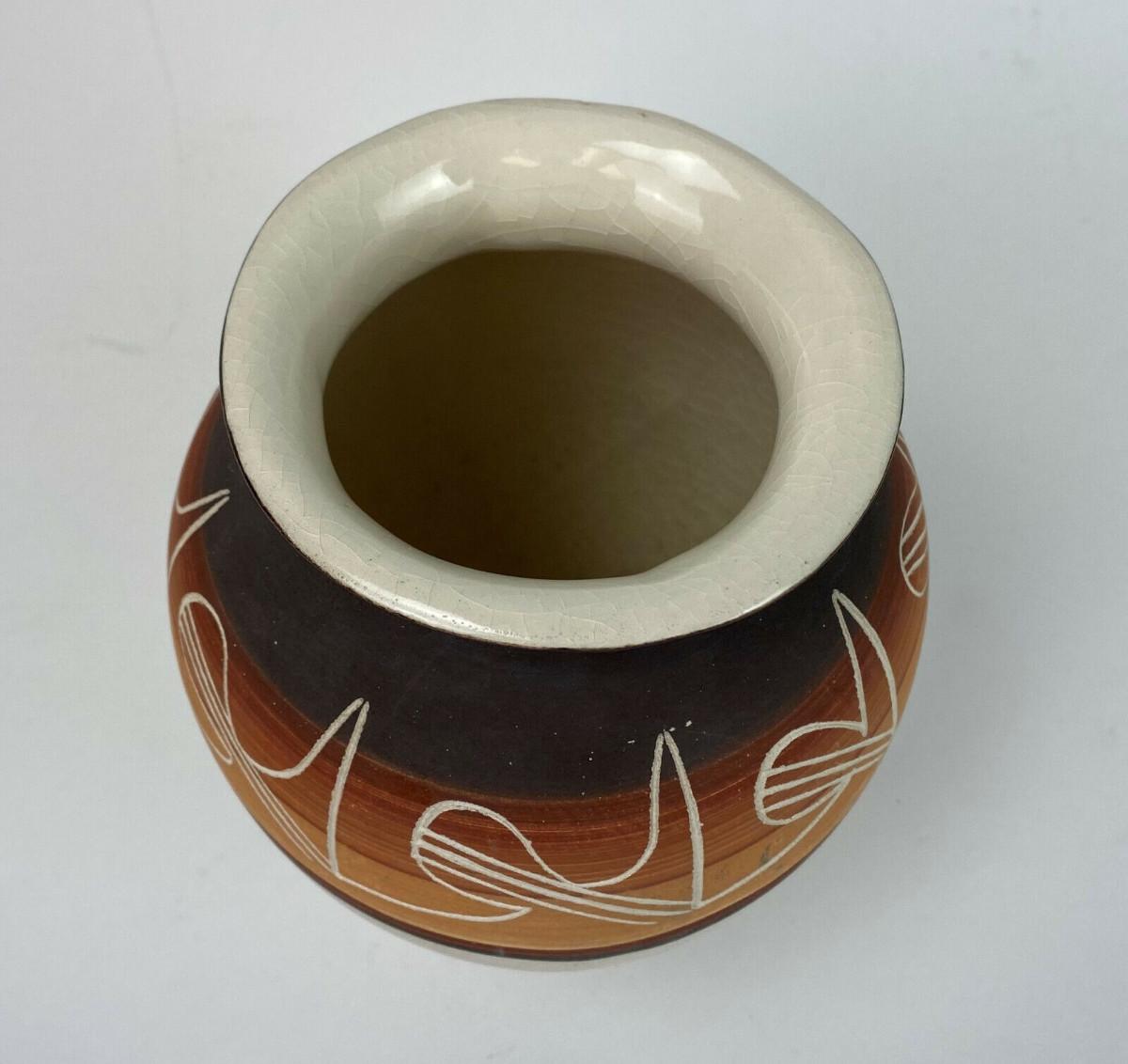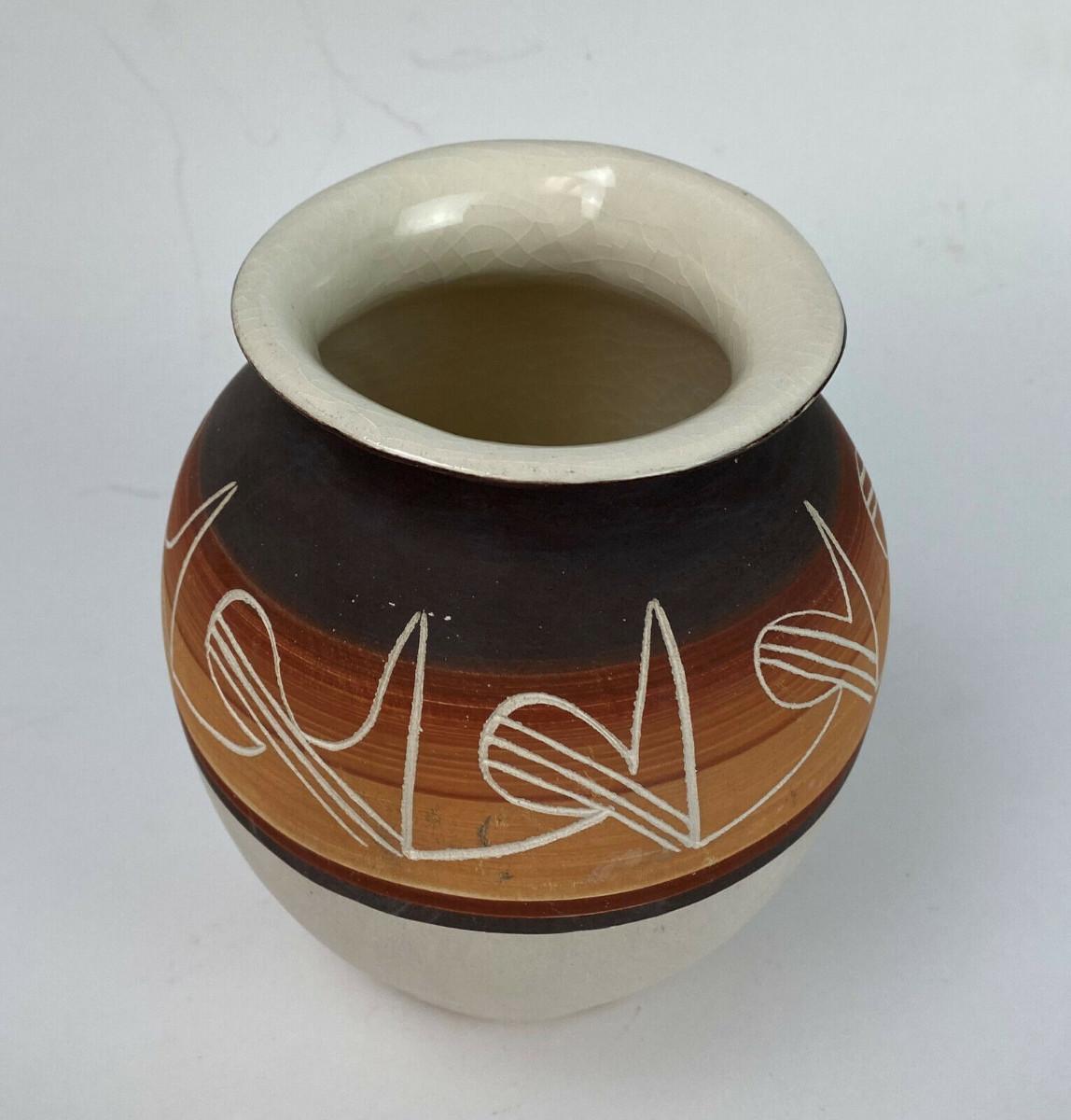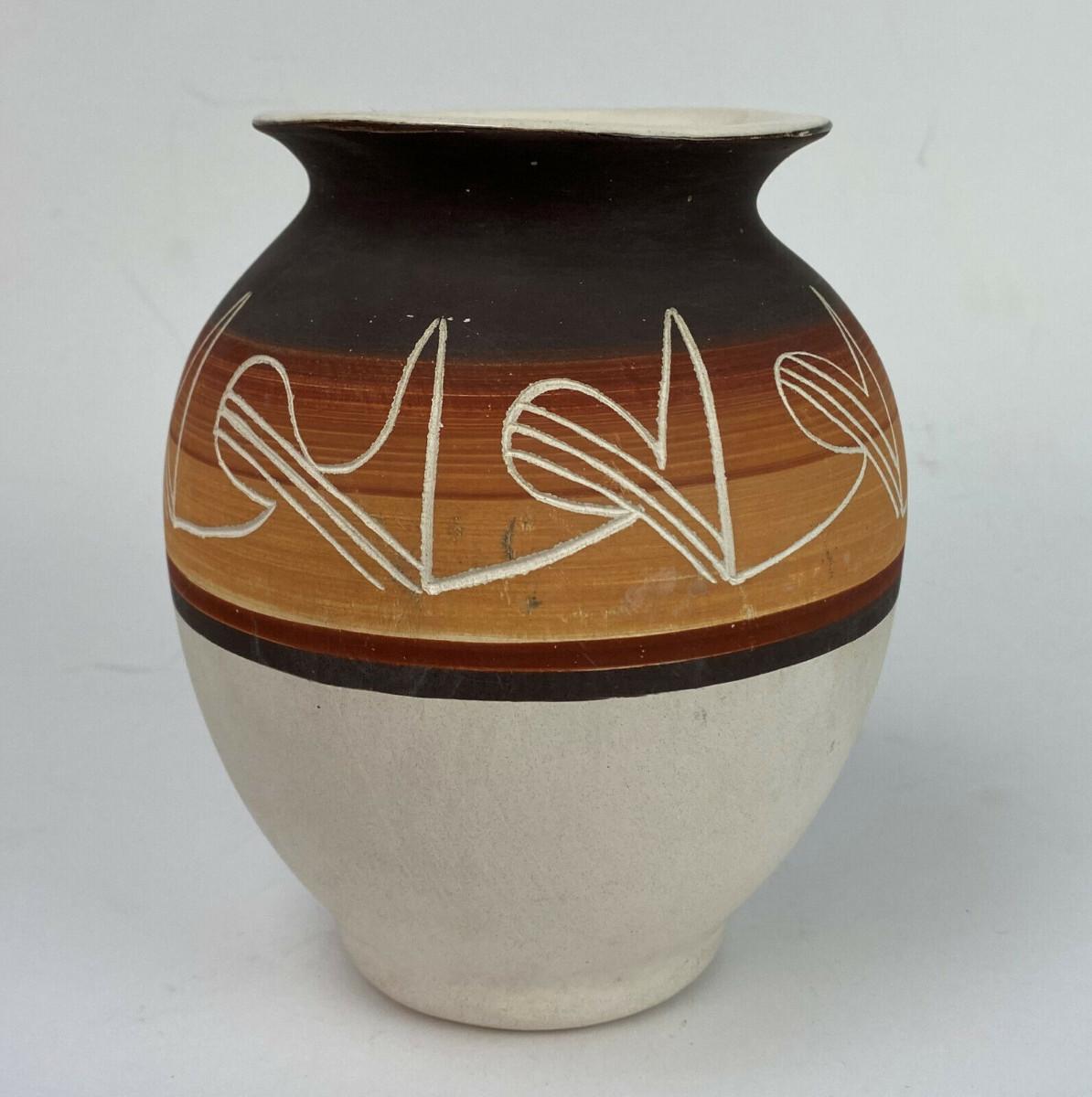 A nice blend of traditional and modern on this 6.25" high pottery jar by the Ute Mountain Indian Tribe at Towaoc in Colorado...Hand decorated and signed R. Root for Ruth I believe...Offered with no reserve...