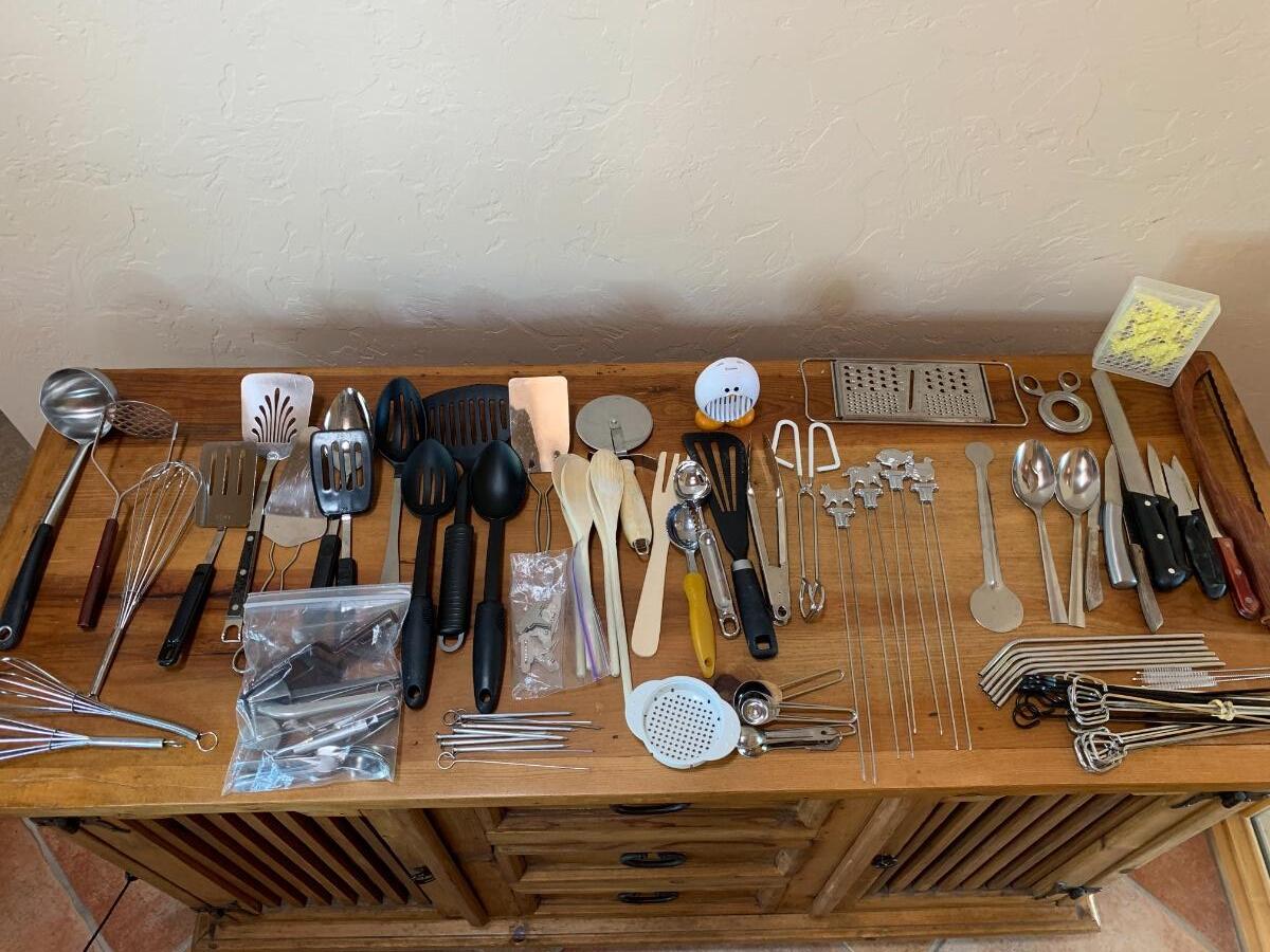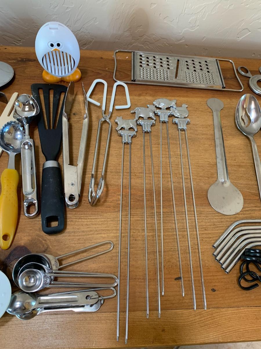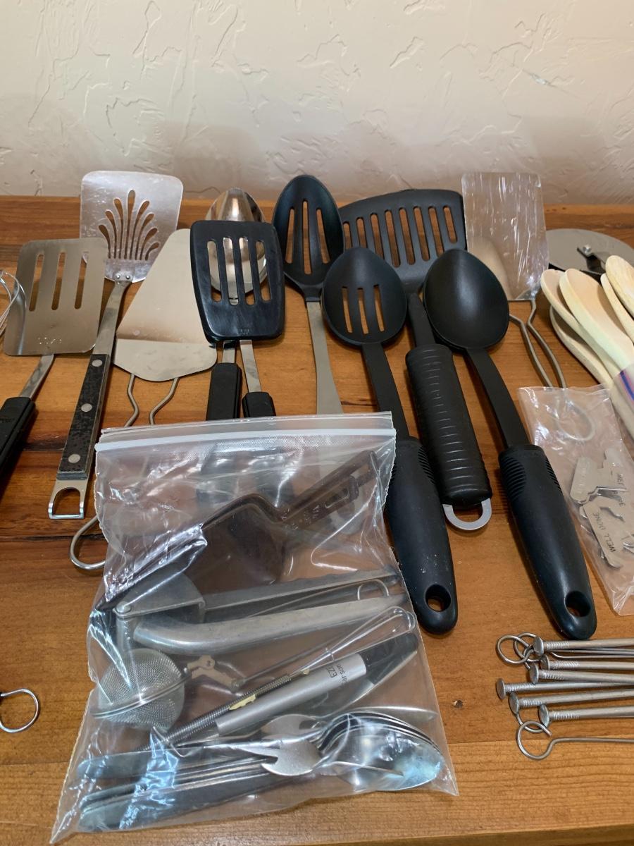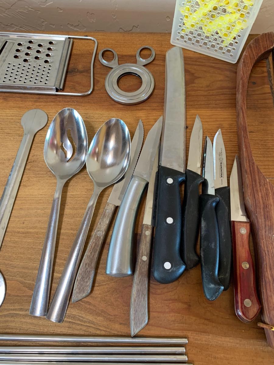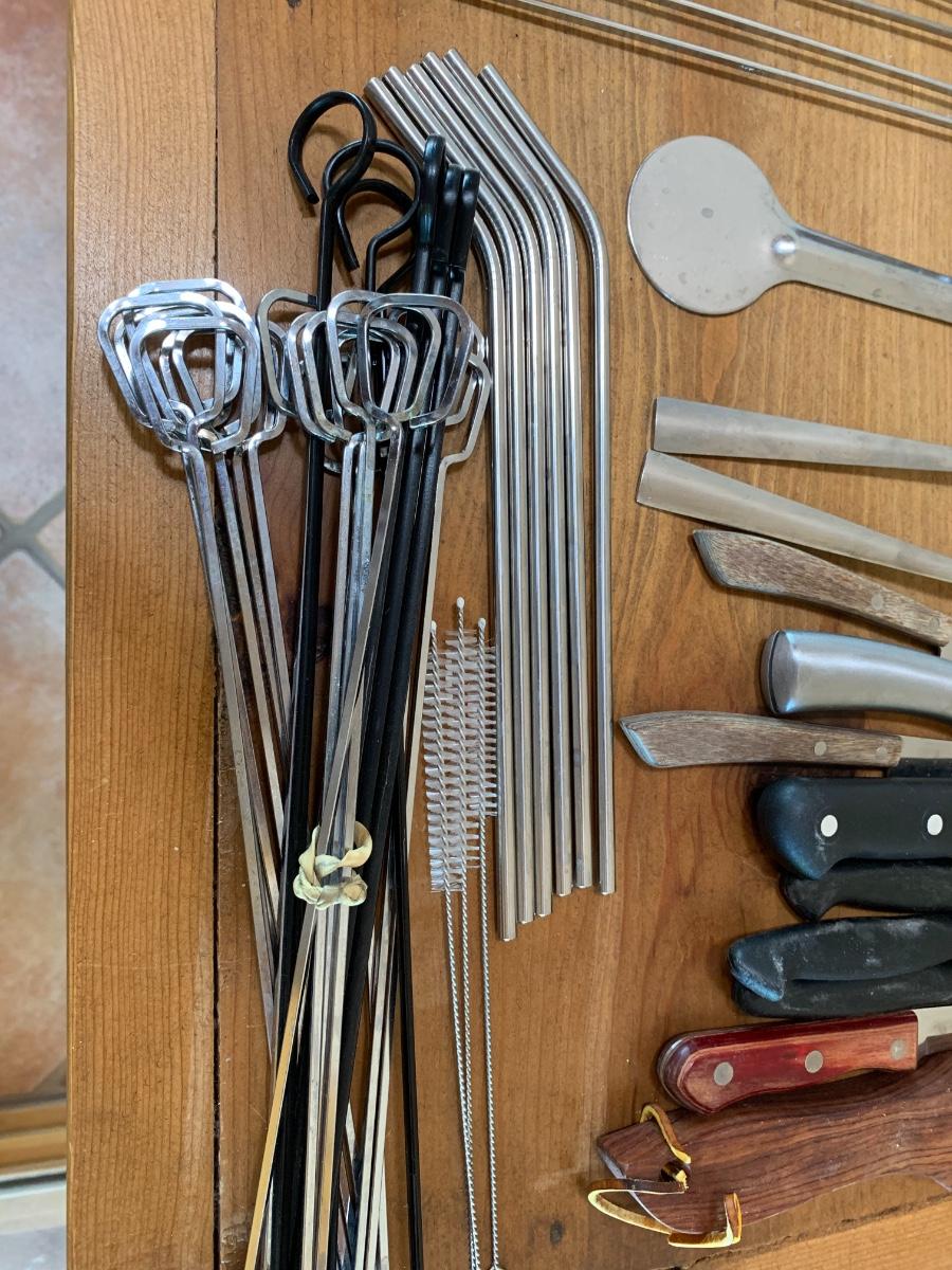 Contains knives, corn holders, metal straws and cleaners, measuring spoons, cooking utensils, baking utensils, ice cream scooper, egg slicer and metal skewers