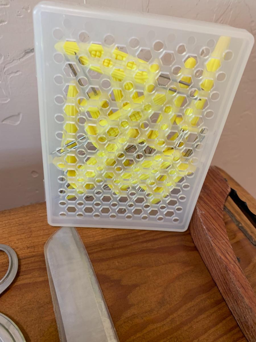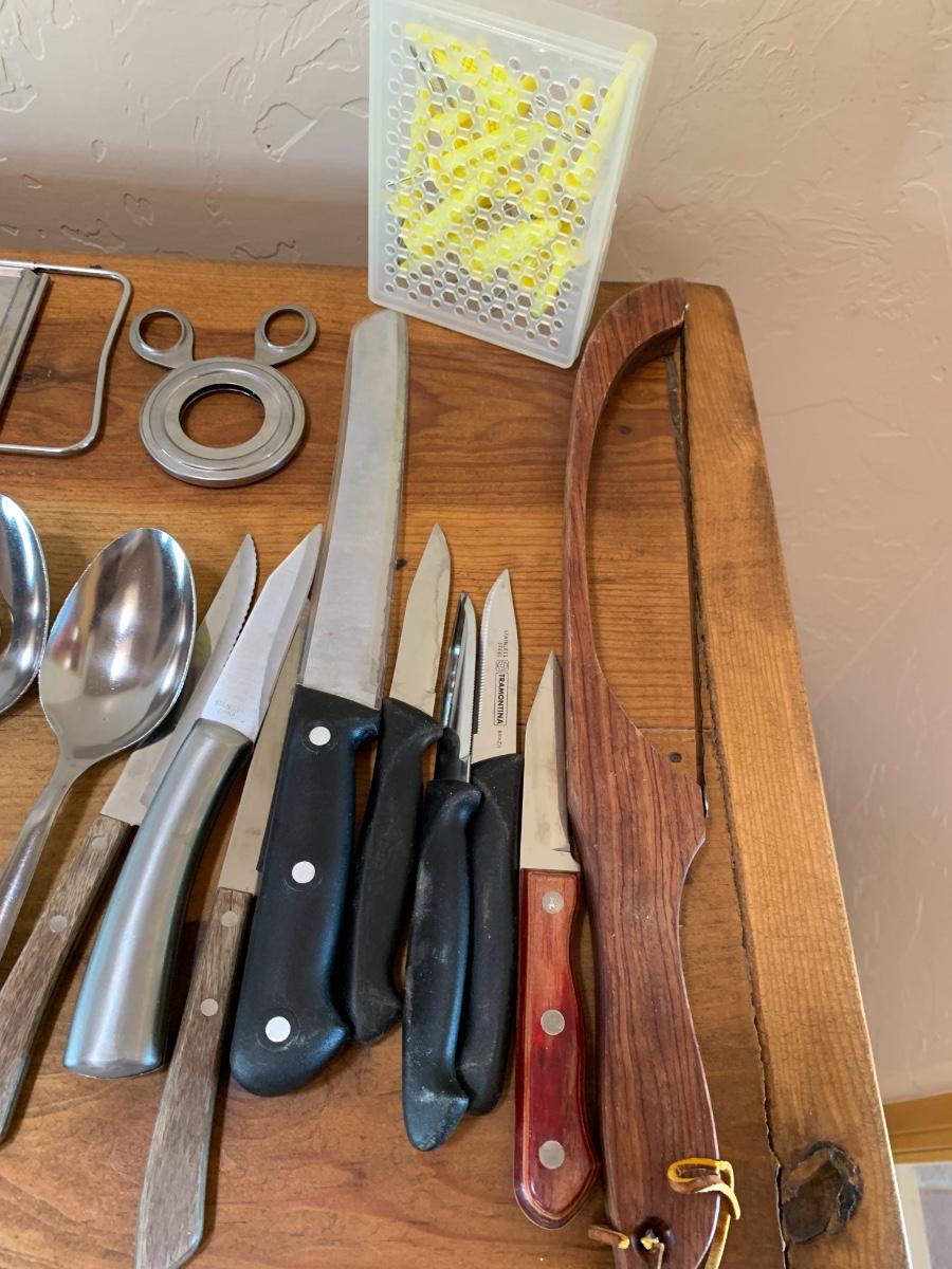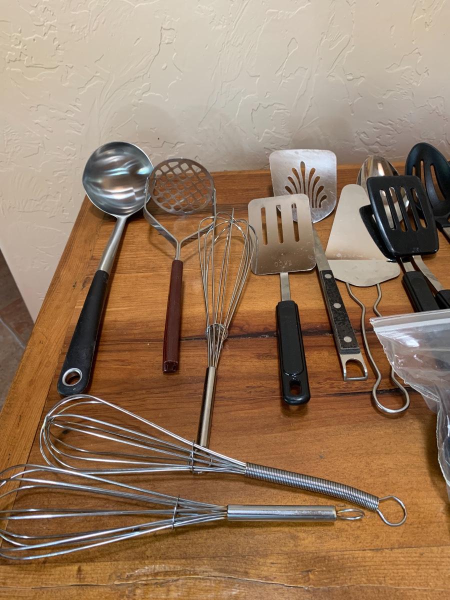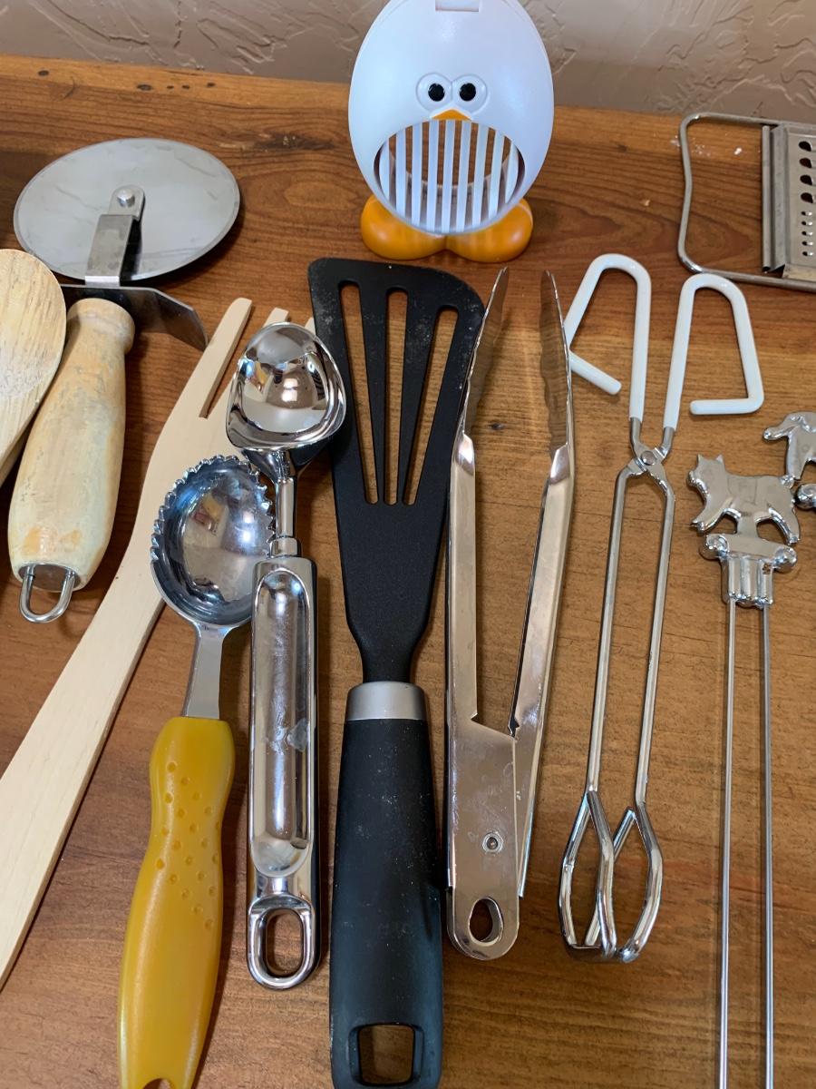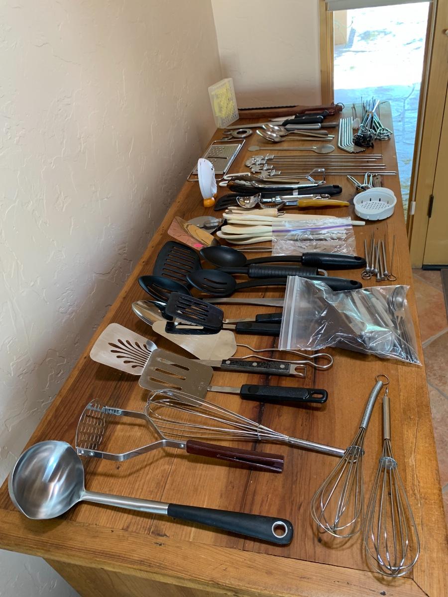 Contains knives, corn holders, metal straws and cleaners, measuring spoons, cooking utensils, baking utensils, ice cream scooper, egg slicer and metal skewers