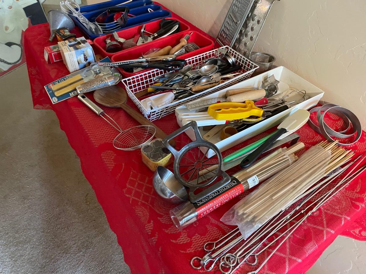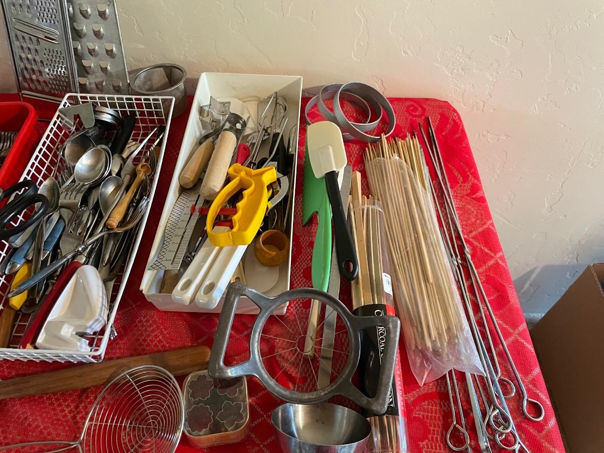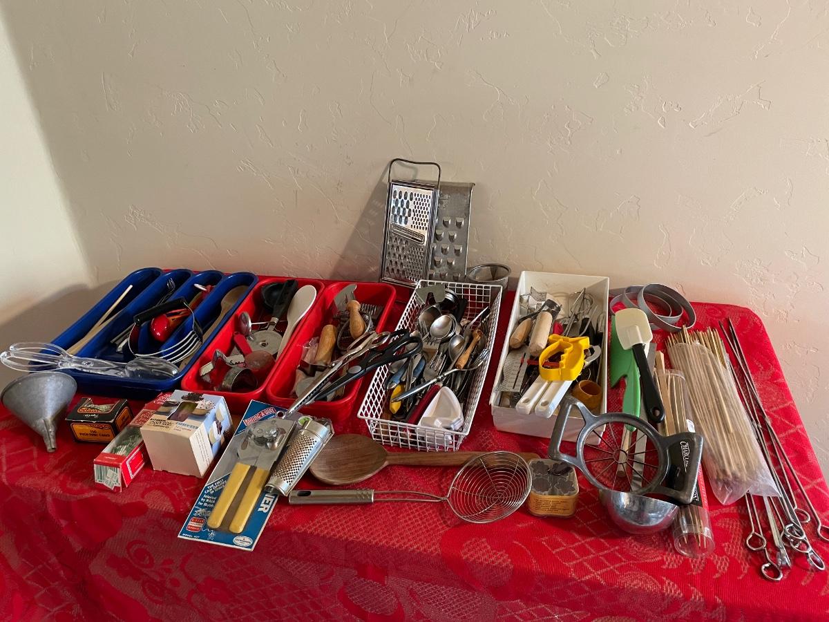 Multiple vintage and modern kitchen utensils including graters, can opener, skewers, and much much more