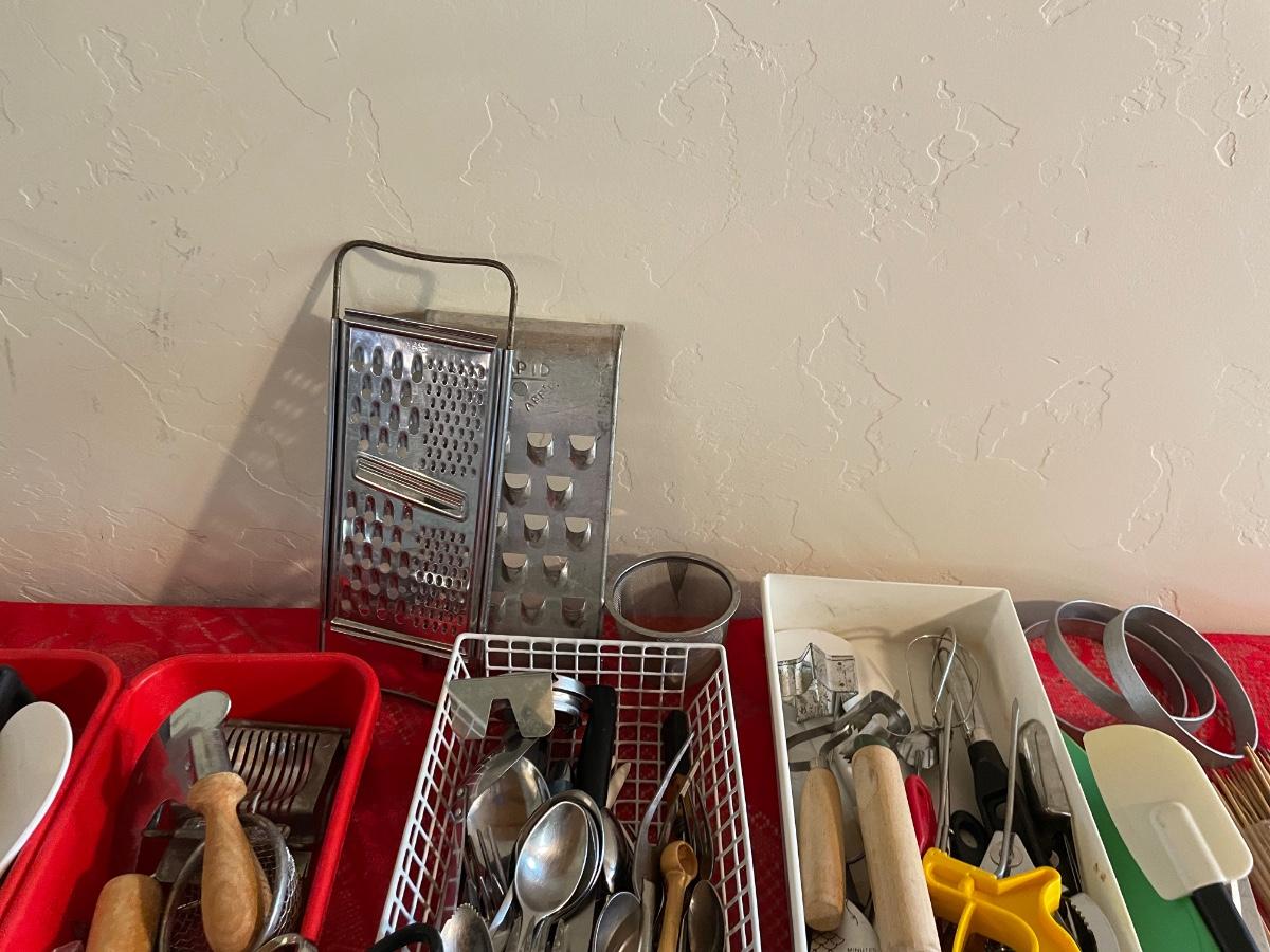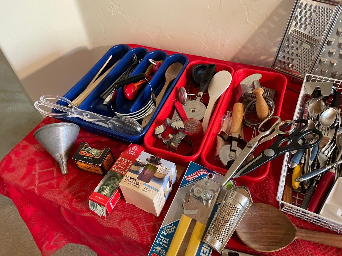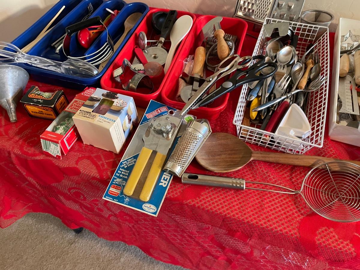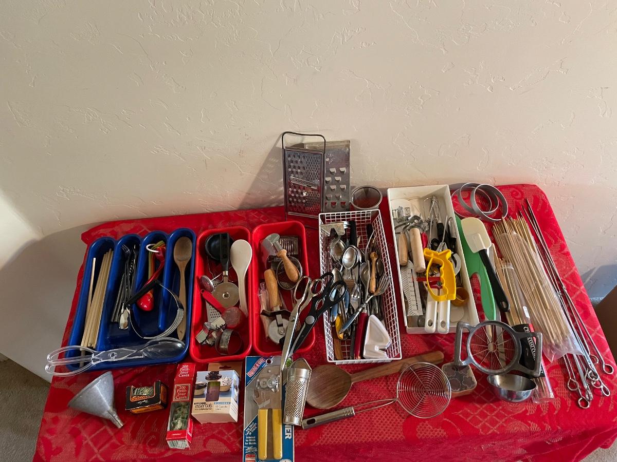 Multiple vintage and modern kitchen utensils including graters, can opener, skewers, and much much more