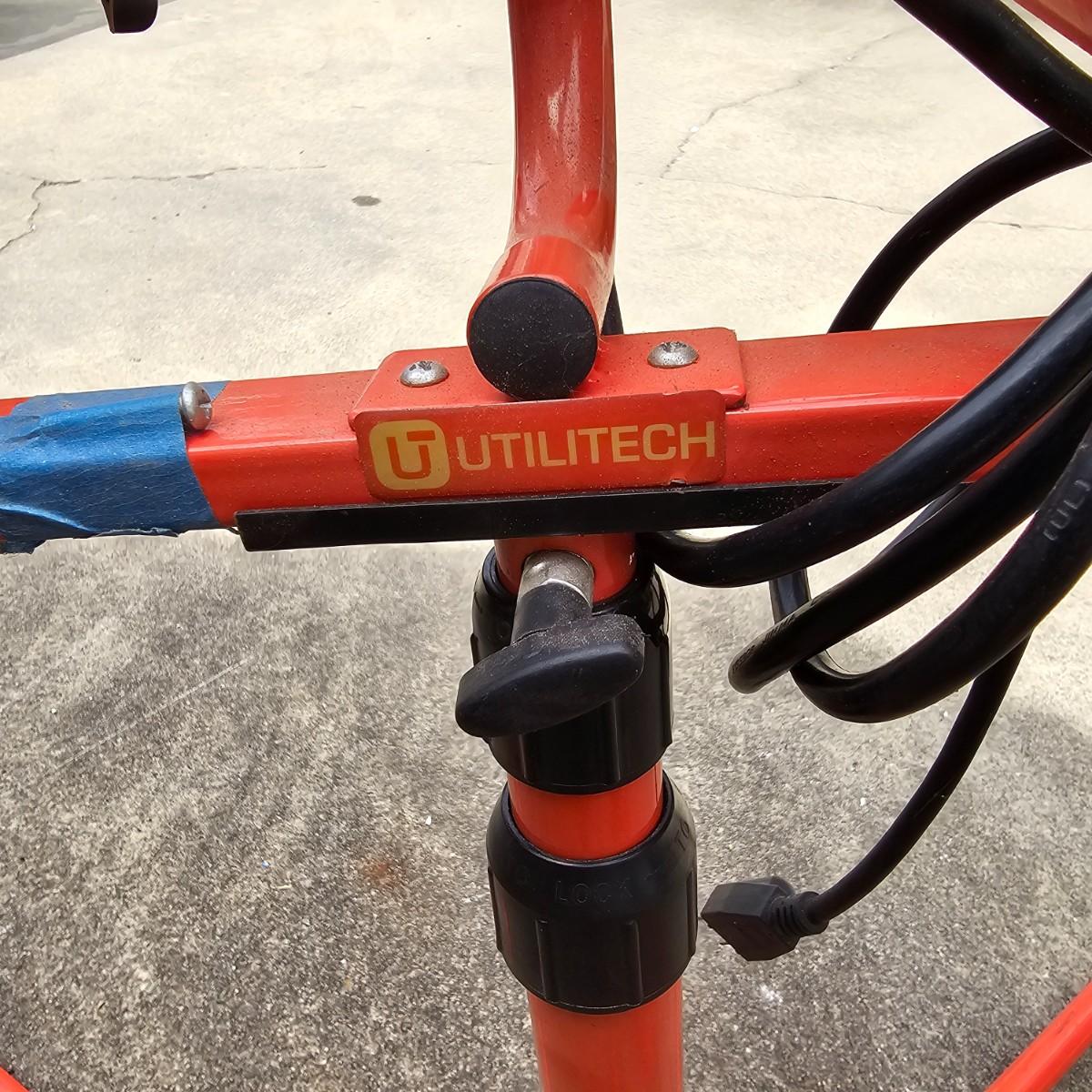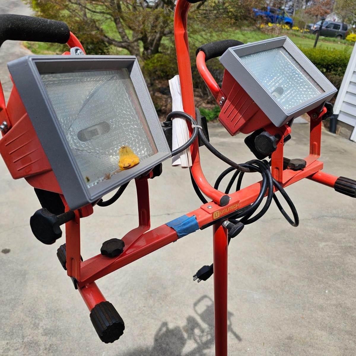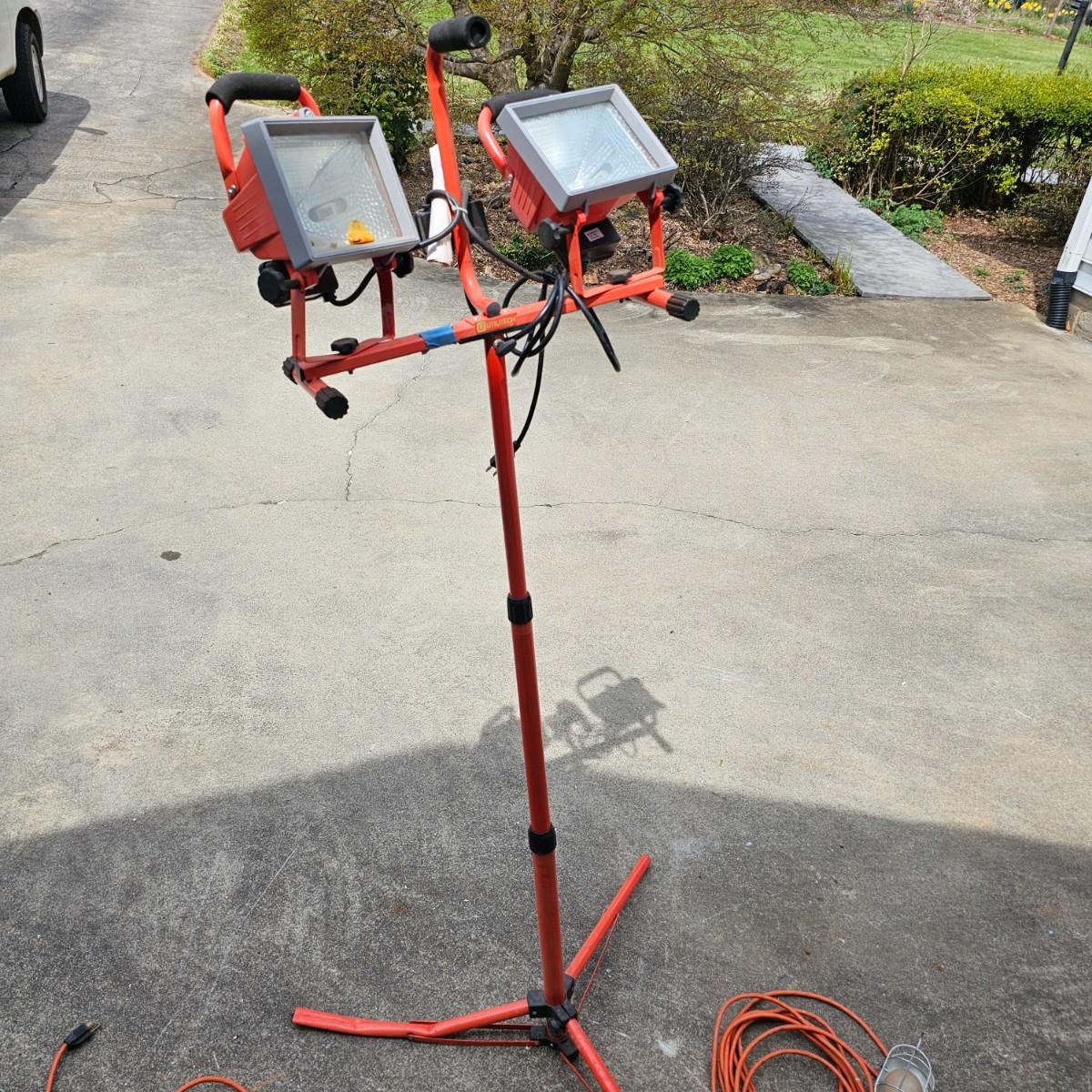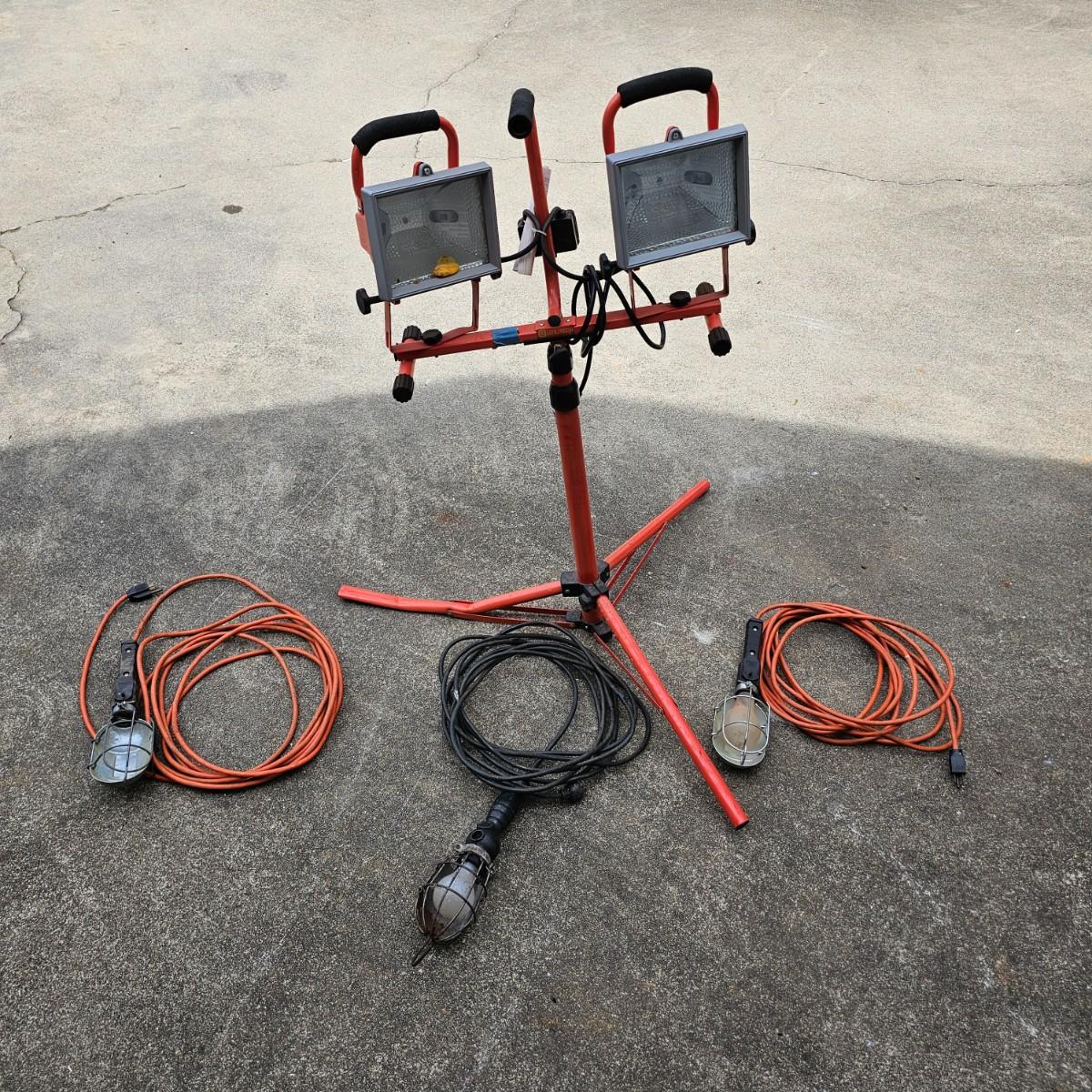 Double halogen work lights on adjustable stand. By Utilitech, lights can swivel and pivot as well as elevate by center pole. Unit is 34"D x 37"to 70"H. One leg on stand damaged and only one bulb in lights. Lamps powered on when plugged in. Also includes three standard trouble lights with cords. Two orange lights are newer with three-way plug, black light is older two prong plug, has several patches in cord. All items powered on when plugged in. See photos for details. Local pickup only.