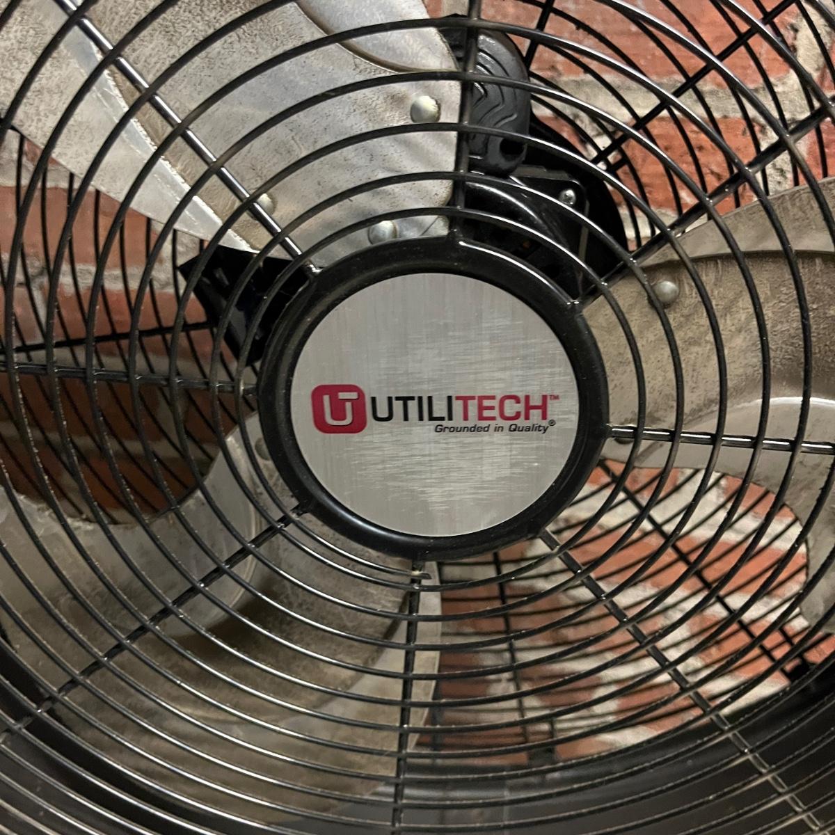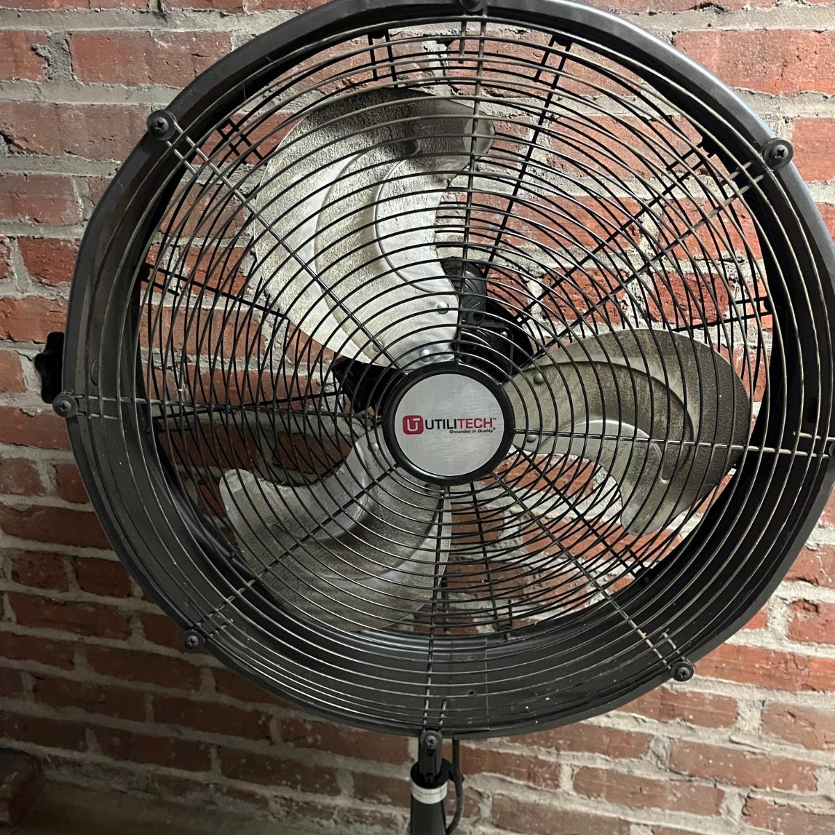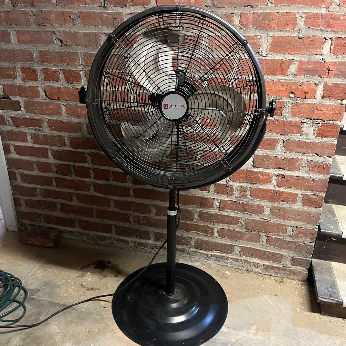 Lot includes a Utilitech metal pedestal fan with adjustable speed and height. Fan powered on when plugged in. Fan as it sits measured 23.5”D x 50”H.