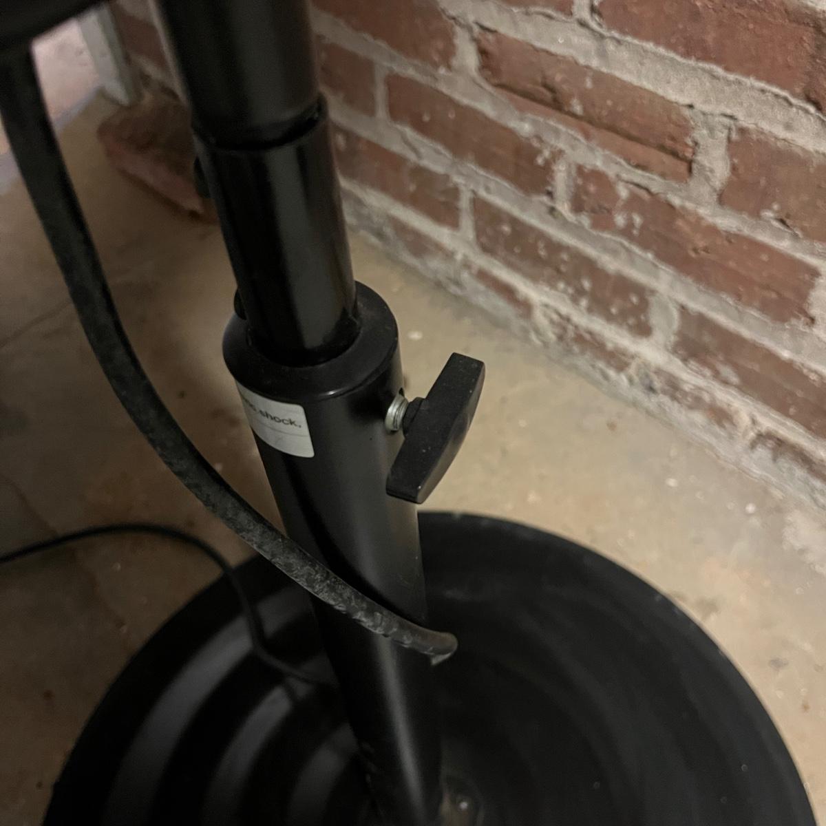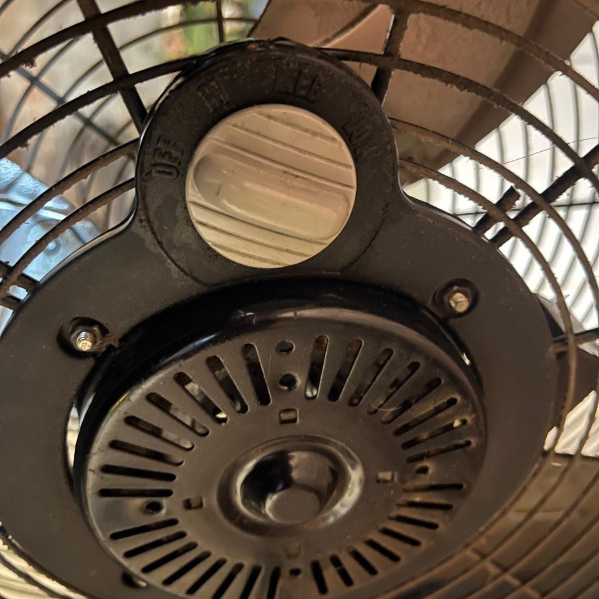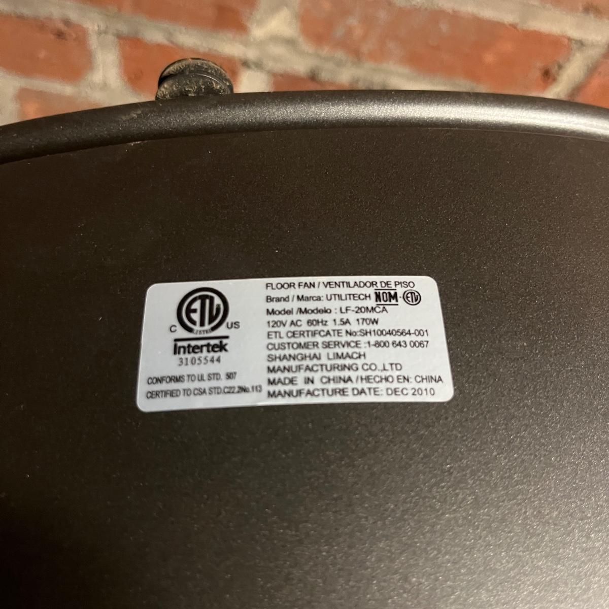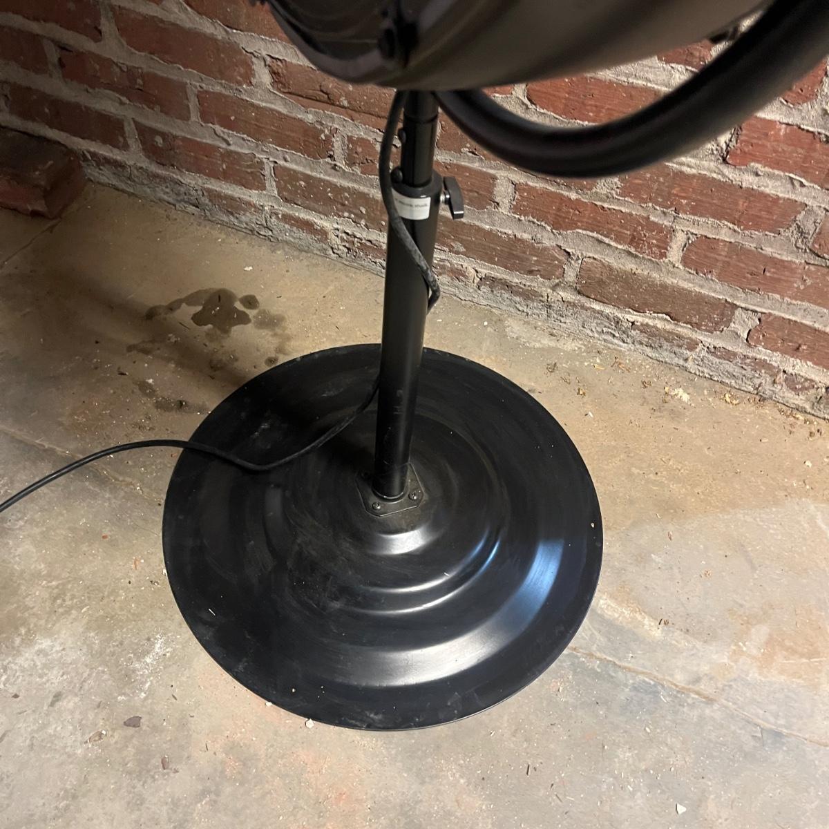 Lot includes a Utilitech metal pedestal fan with adjustable speed and height. Fan powered on when plugged in. Fan as it sits measured 23.5”D x 50”H.