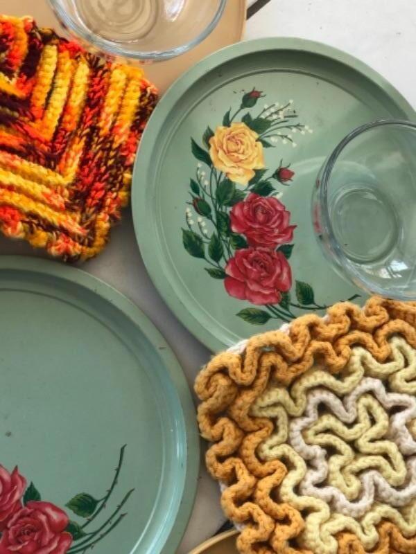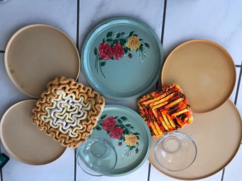 Funky Vintage Kitchen Lot - trays, potholders, bowls, lazy susan spinning storage YD# 022-0175