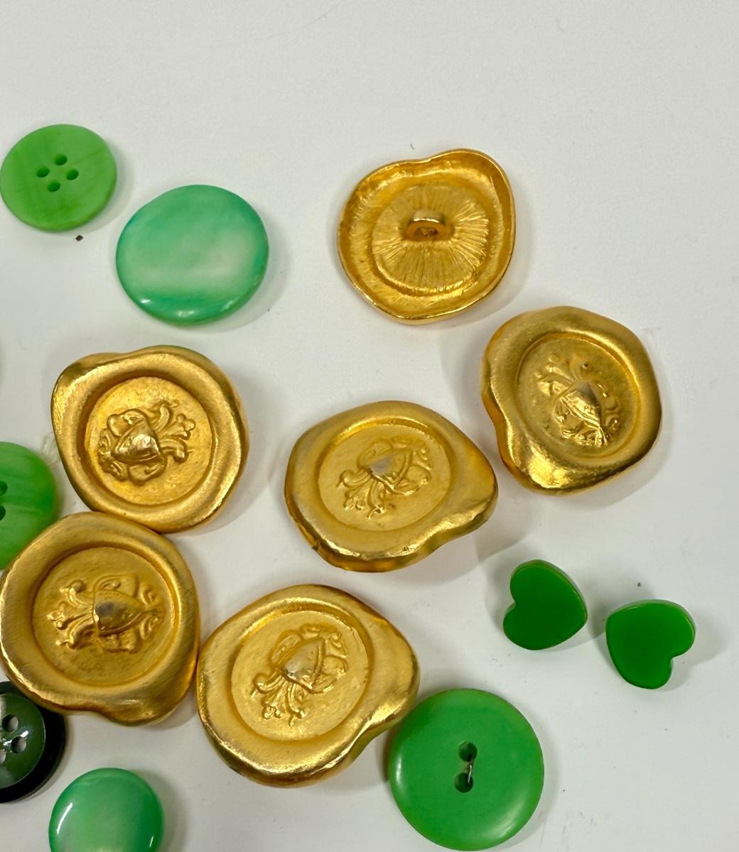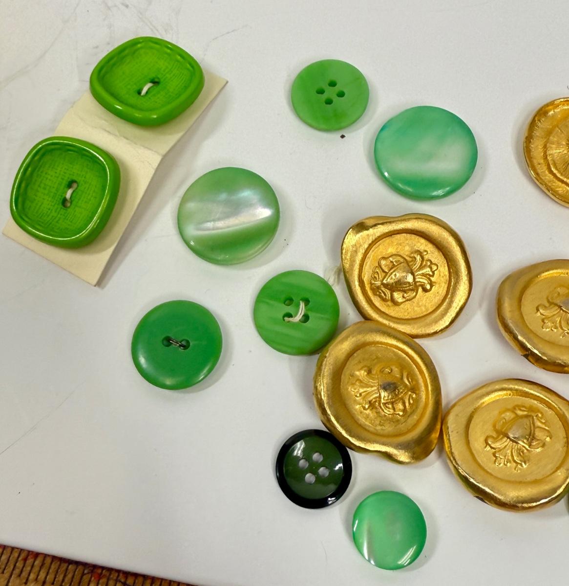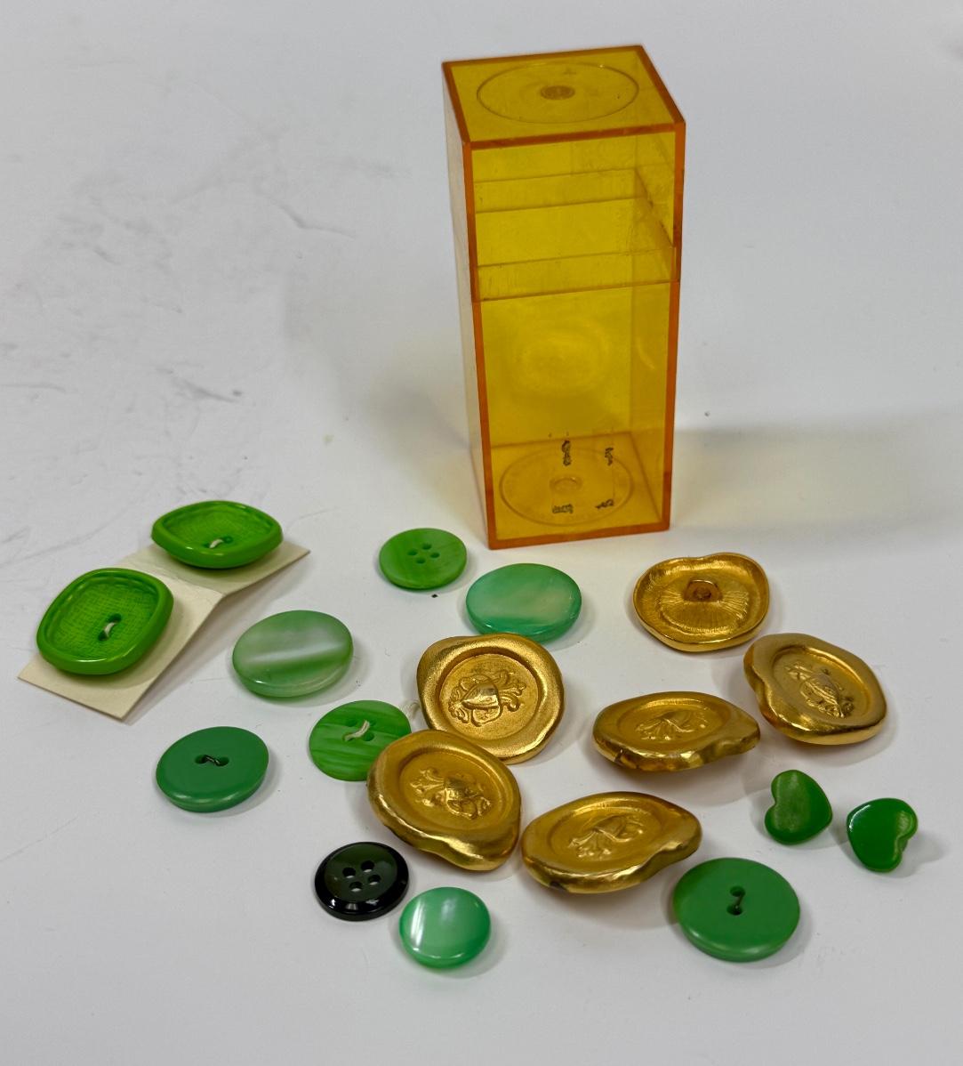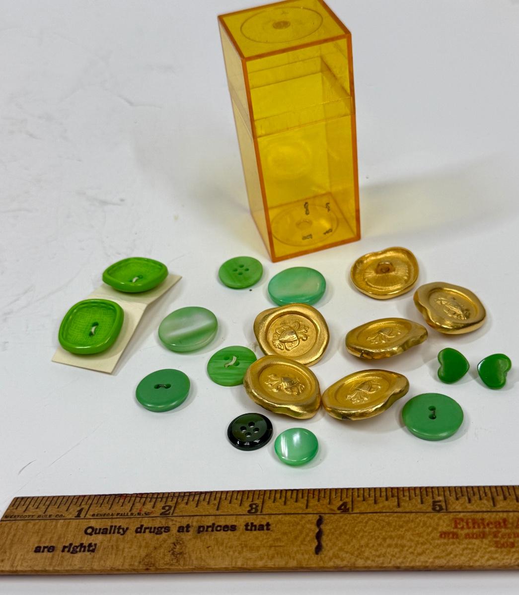 Vintage Button Lot #1 - Green & Gold Buttons in Retro Yellow Plastic Box Container