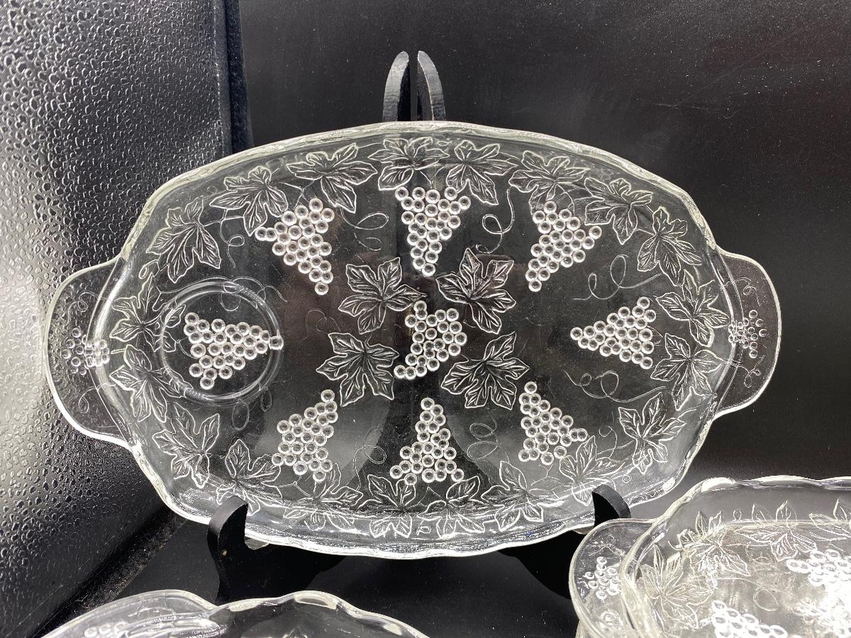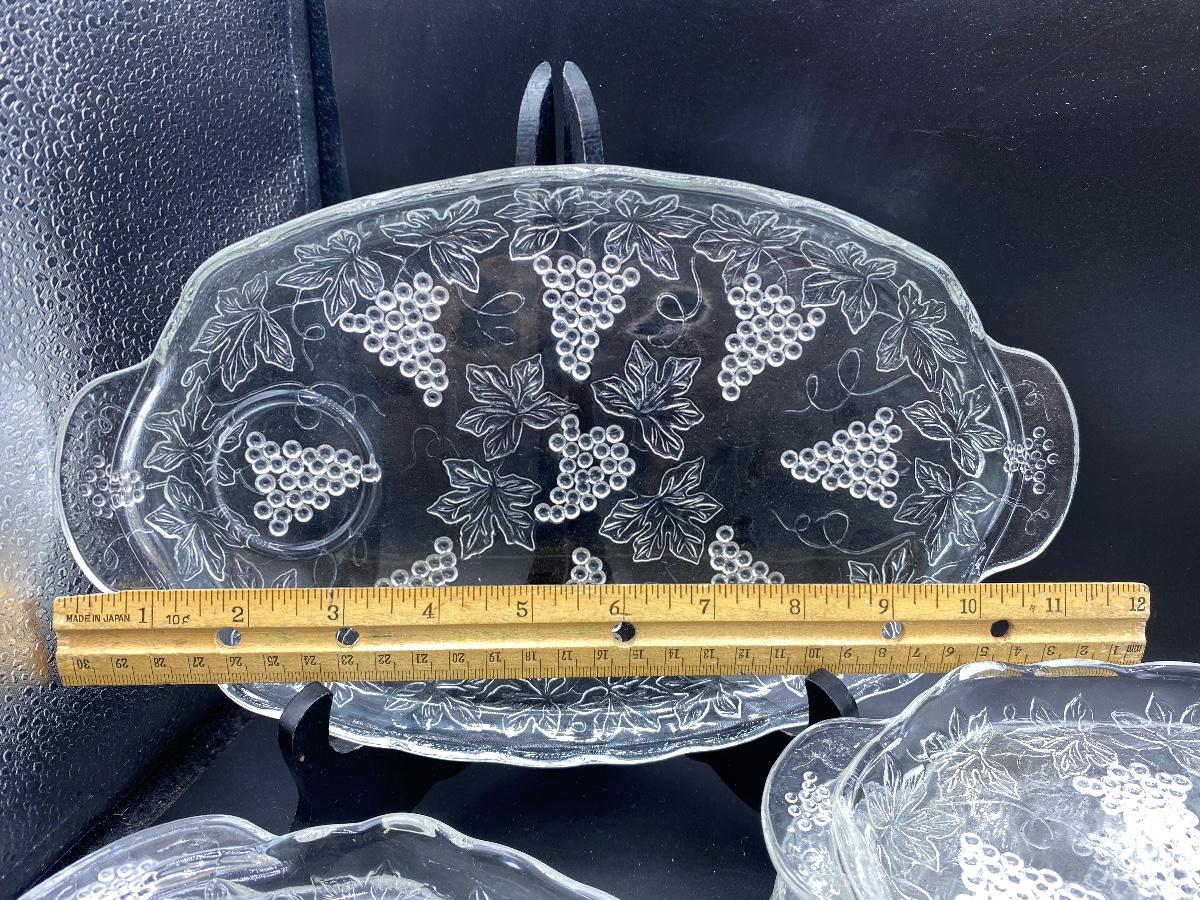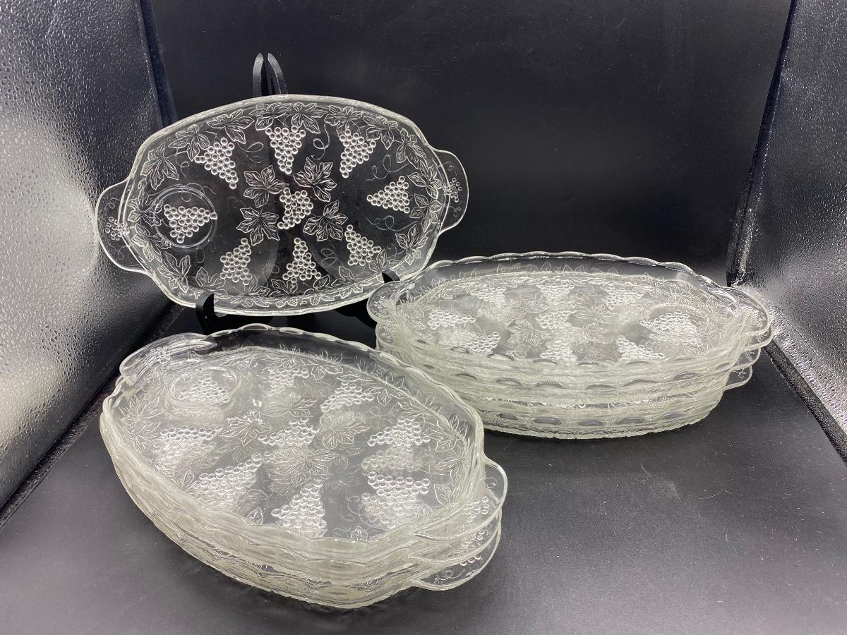 Set of 8 clear glass vintage luncheon plates. Plates only, no cups. Grapevine embossed pattern. Good condition.