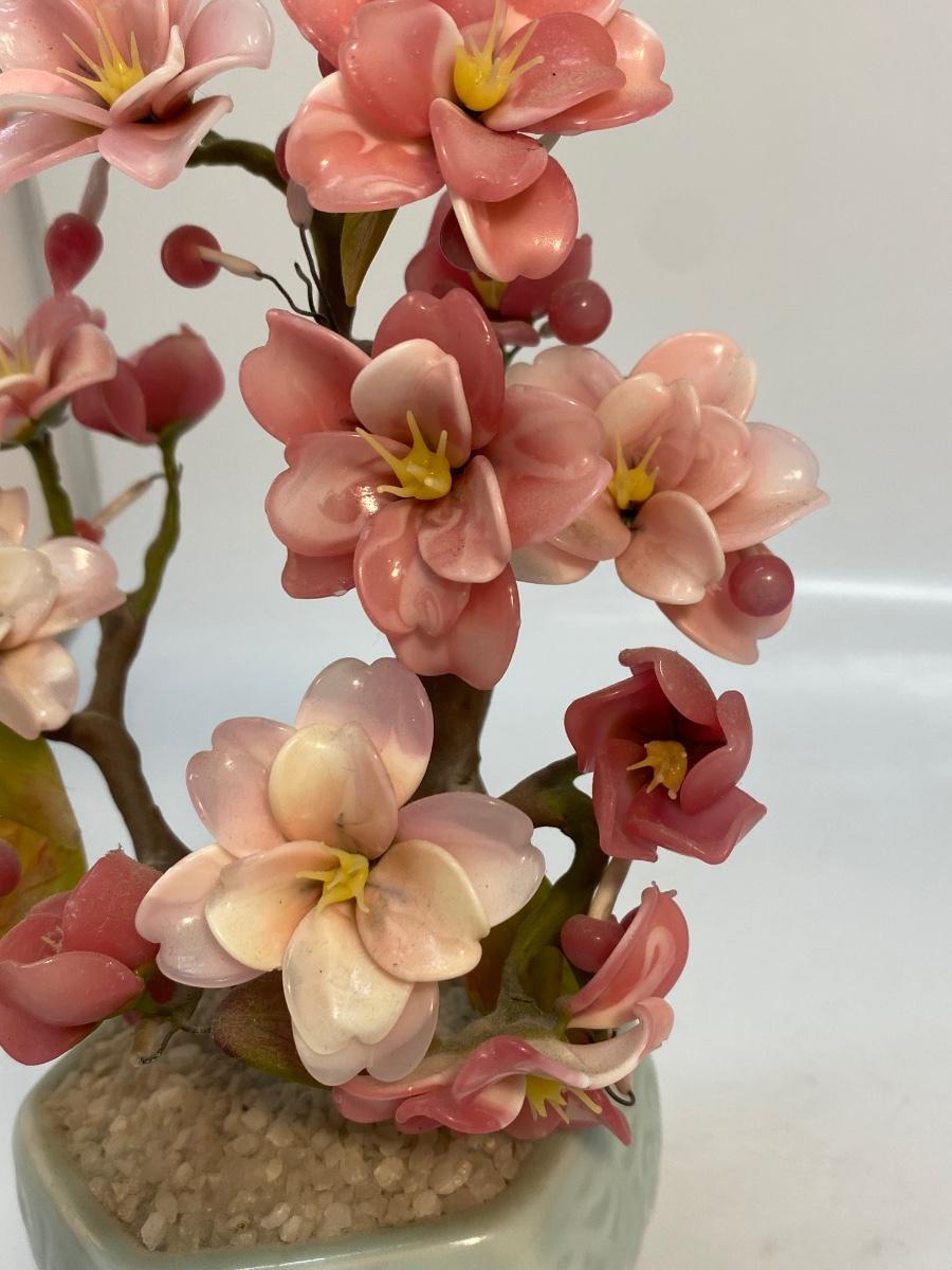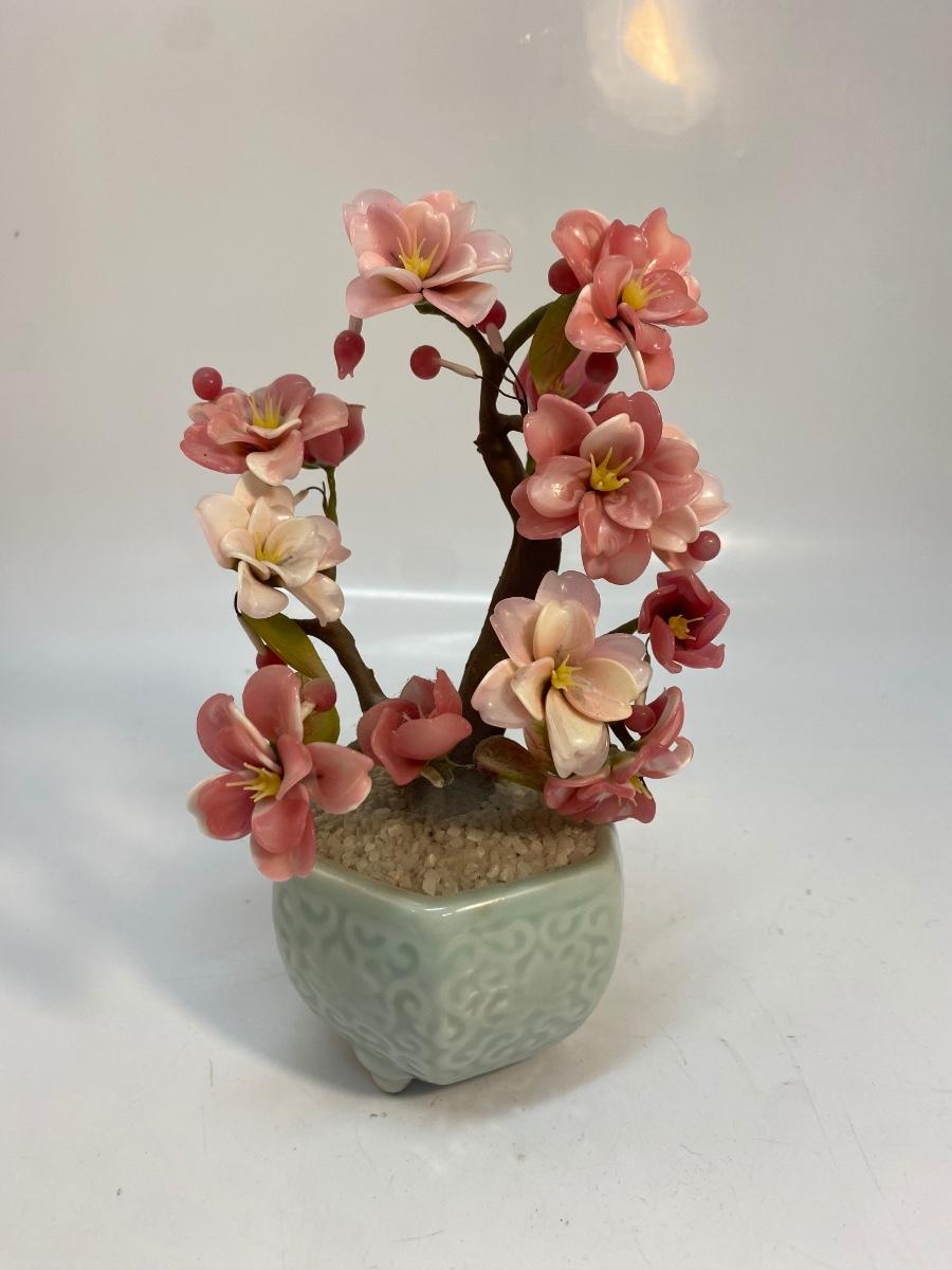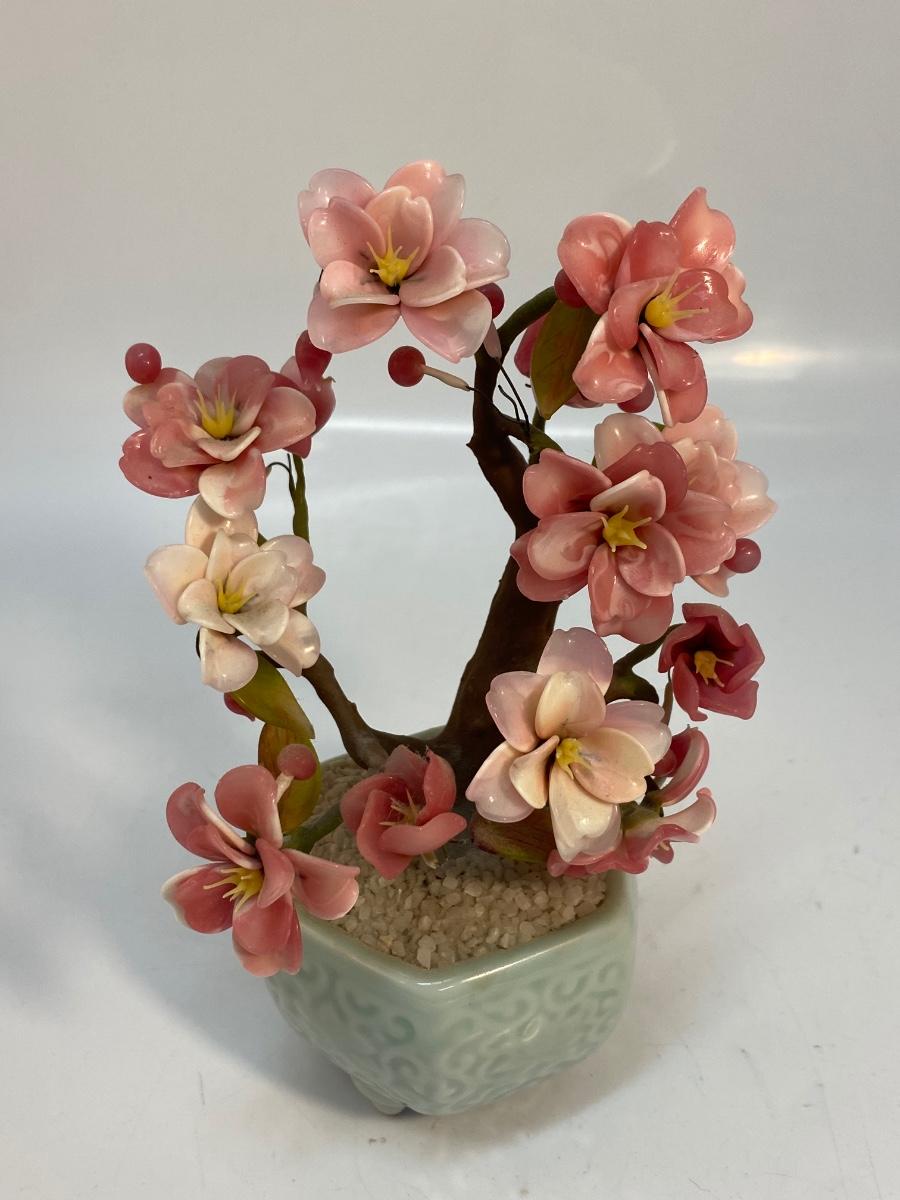 Vintage Mid Century Japanese Pink Glass Jade Quartz Bonsai Tree. Beautiful pink flower tree. Some petals have a slag glass appearance. In good vintage condition, still has sticker on bottom. About 7.5" tall.