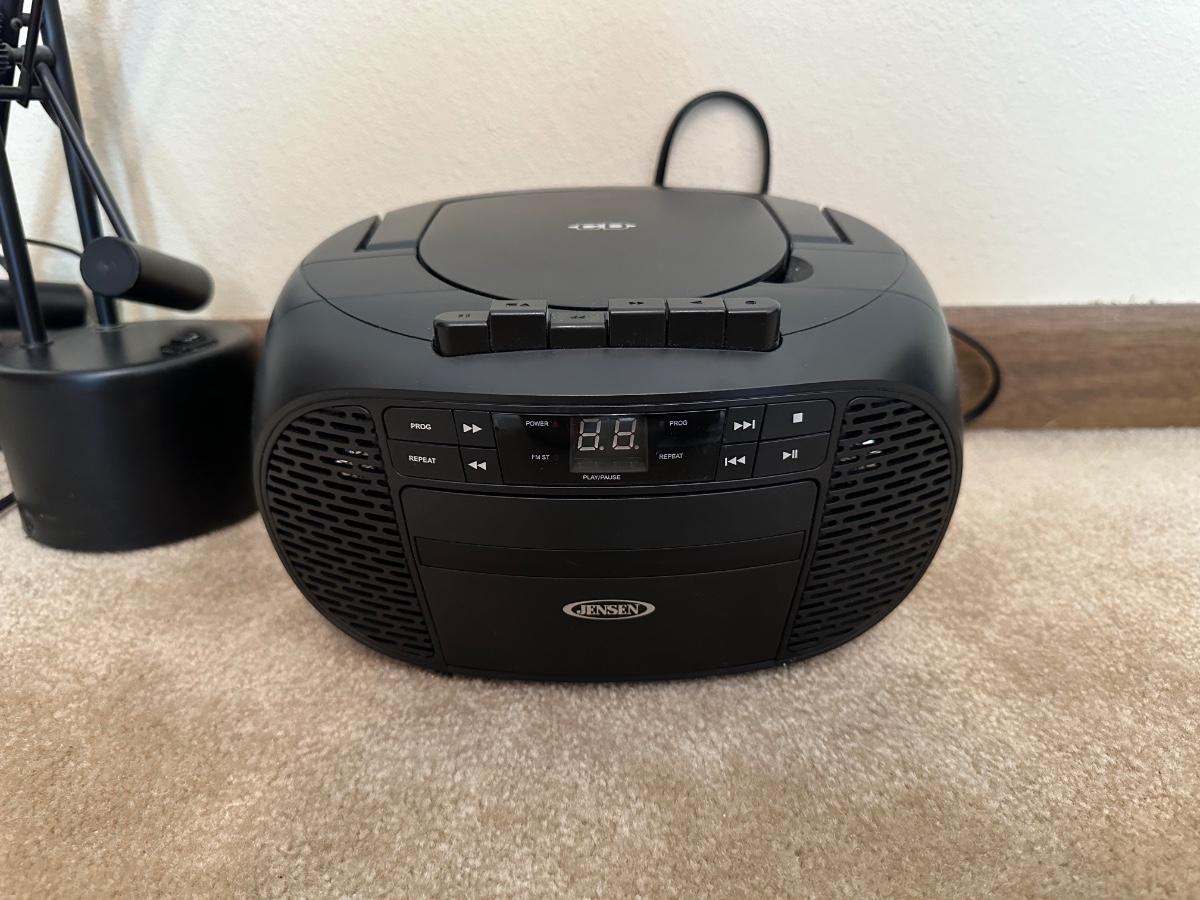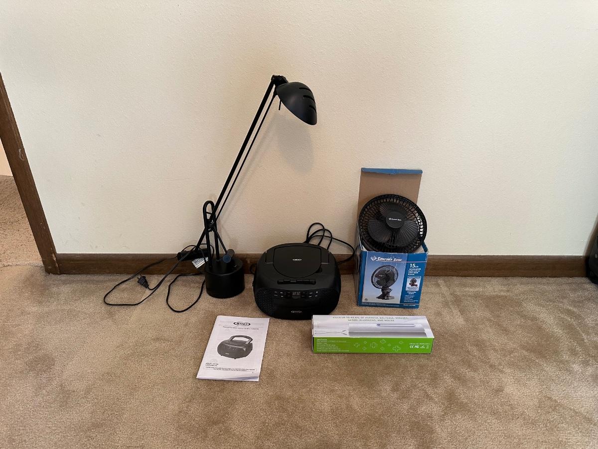 UV-C SANITIZING WAND, JENSEN STEREO CD CASSETTE PLAYER, SMALL FAN AND LAMP