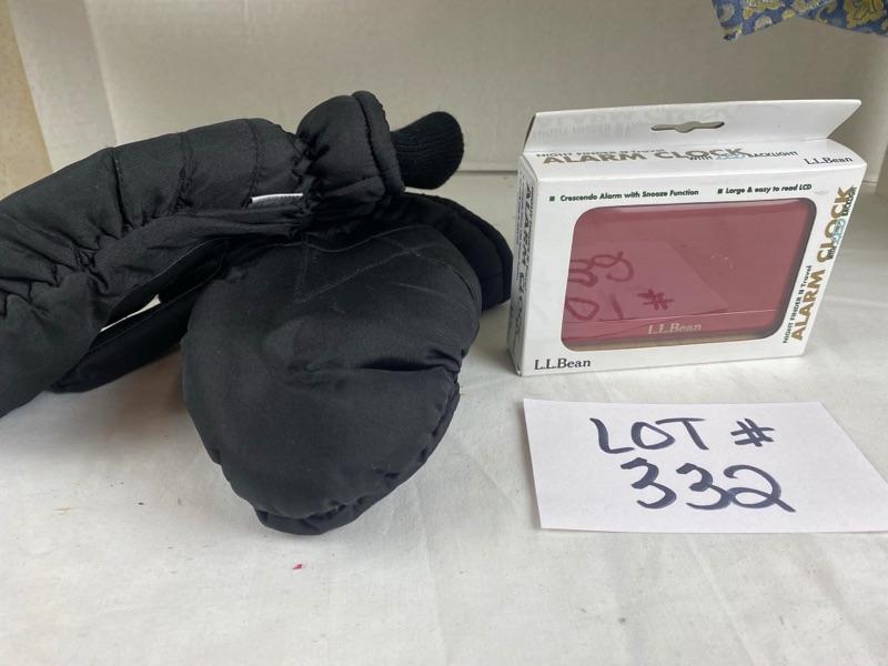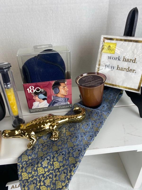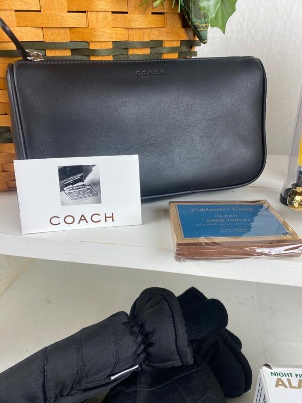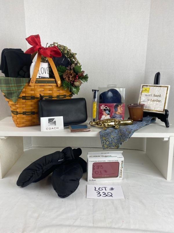 Here we have a 2 handled large Longaberger Basket with Fabric Liner, Scarf, Gloves, Greek Ink Pen, Napkins, Candles, NEW Coach Bag, LLBean Travel Clock, Gold Decorative Alligator, Ear Warmers, Tie, Tea Towel