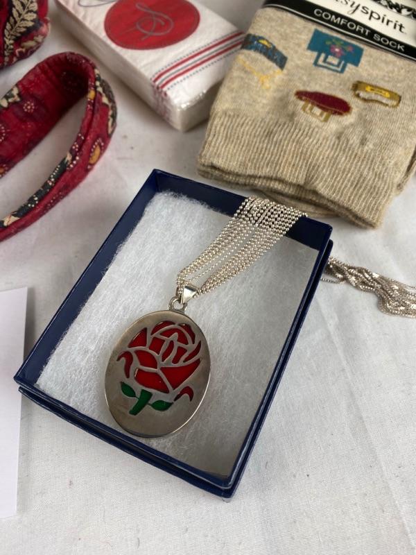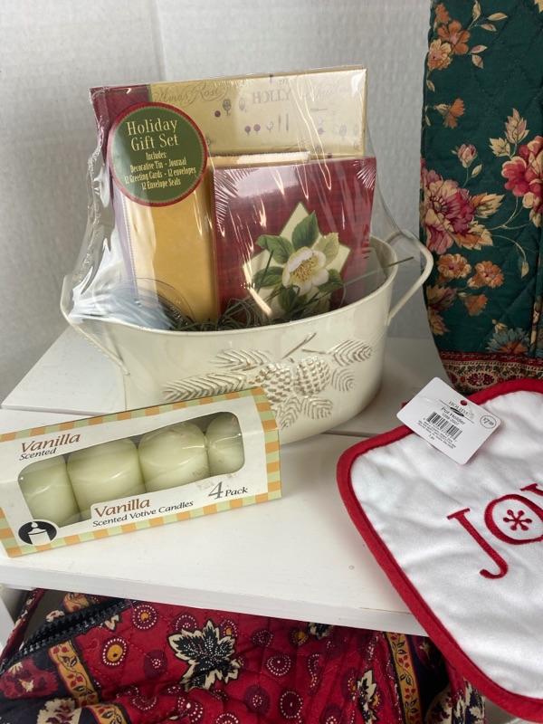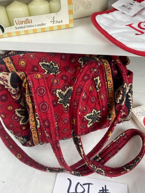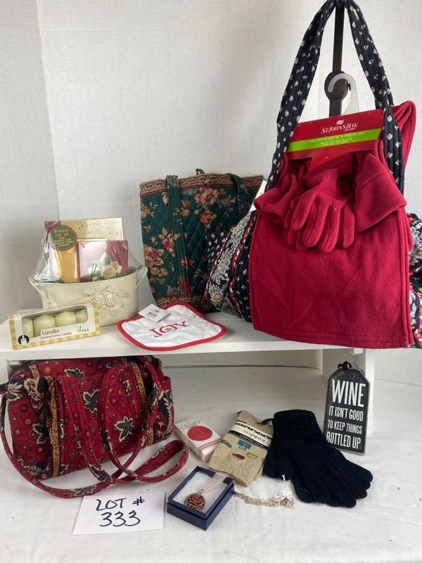 Holiday Vera Bradley Gift Lot includes - 3 Vera Bradley Bags, Gloves, Socks, Sterling Silver Necklace with Rose Enamel Pendent, Candles, Stationary, Sign, Scarf & Glove Set and more
