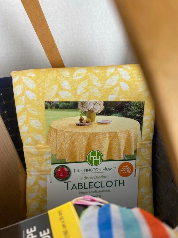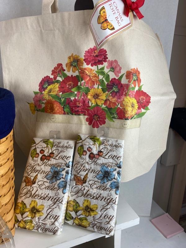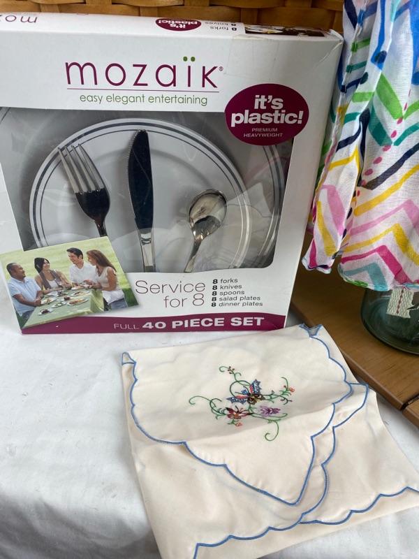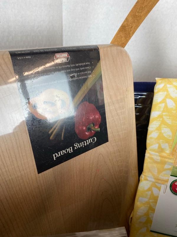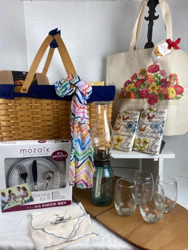 Large 2 Handled Longaberger Gift Basket offers Canvas Tote, 2 - Pier 1 Napkin Set, Cutting Board, Set of 4 Wine Glasses, Butterfly Oil Lamp, Table Cloth, Fashion Scarf, Mozaik Plastic Dinner 40 pc. Set