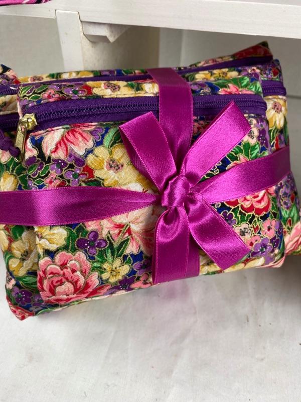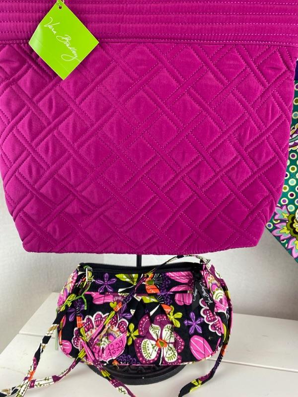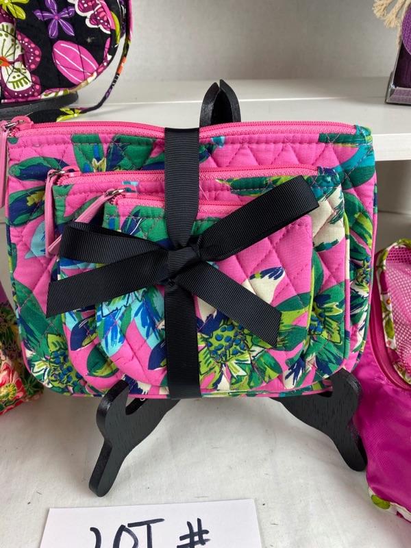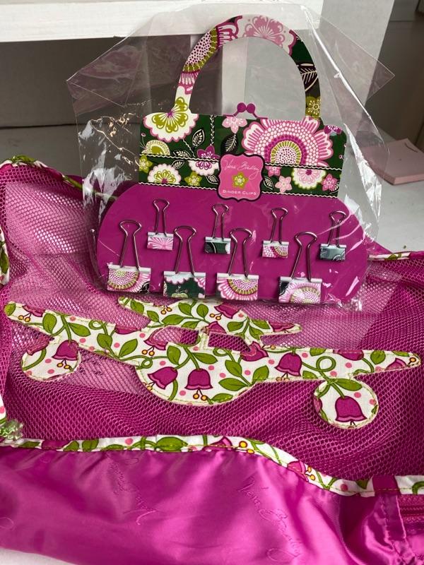 Many Vera Bradley Items in this lot such as 1 Tote, 1 Handbag, 1 Small Handbag, 1 Travel Bag, 2 - Cosmetic Trios, Vera Bradley Binder Clips, & Toaster Hand Warmers