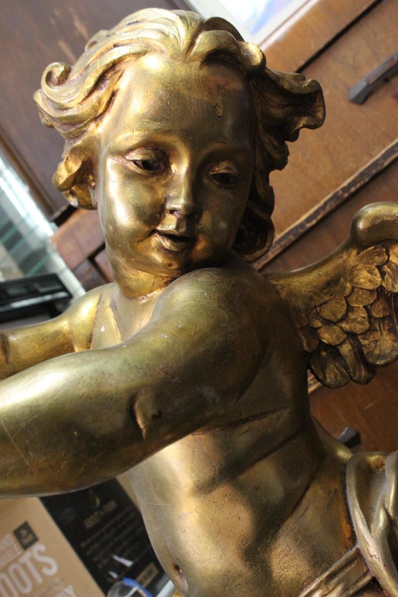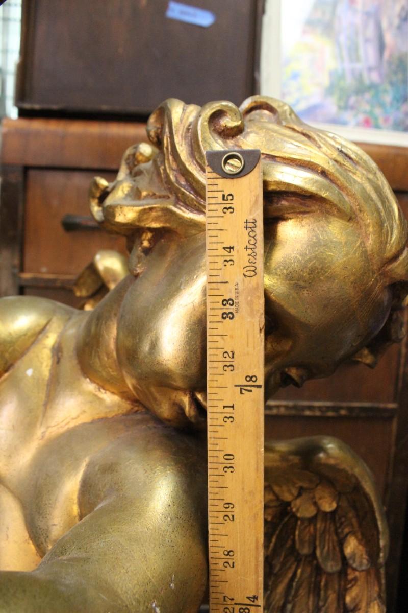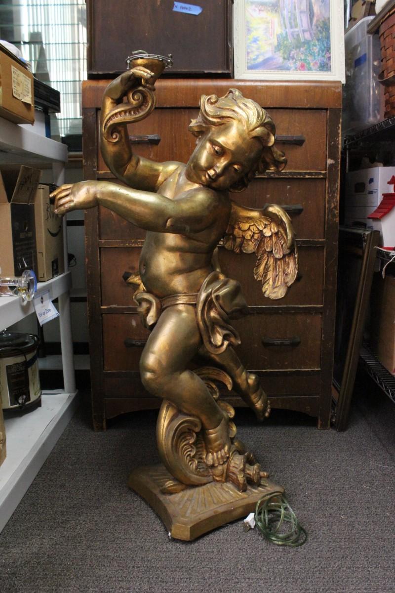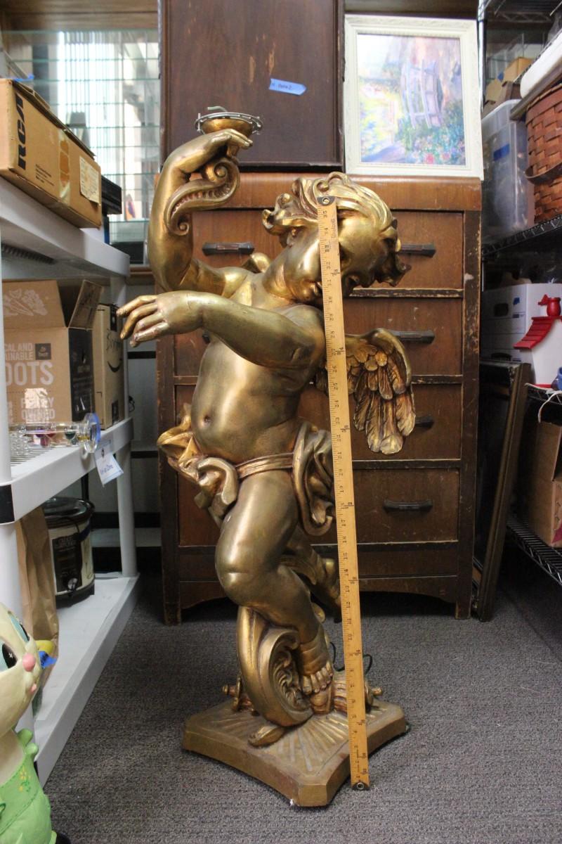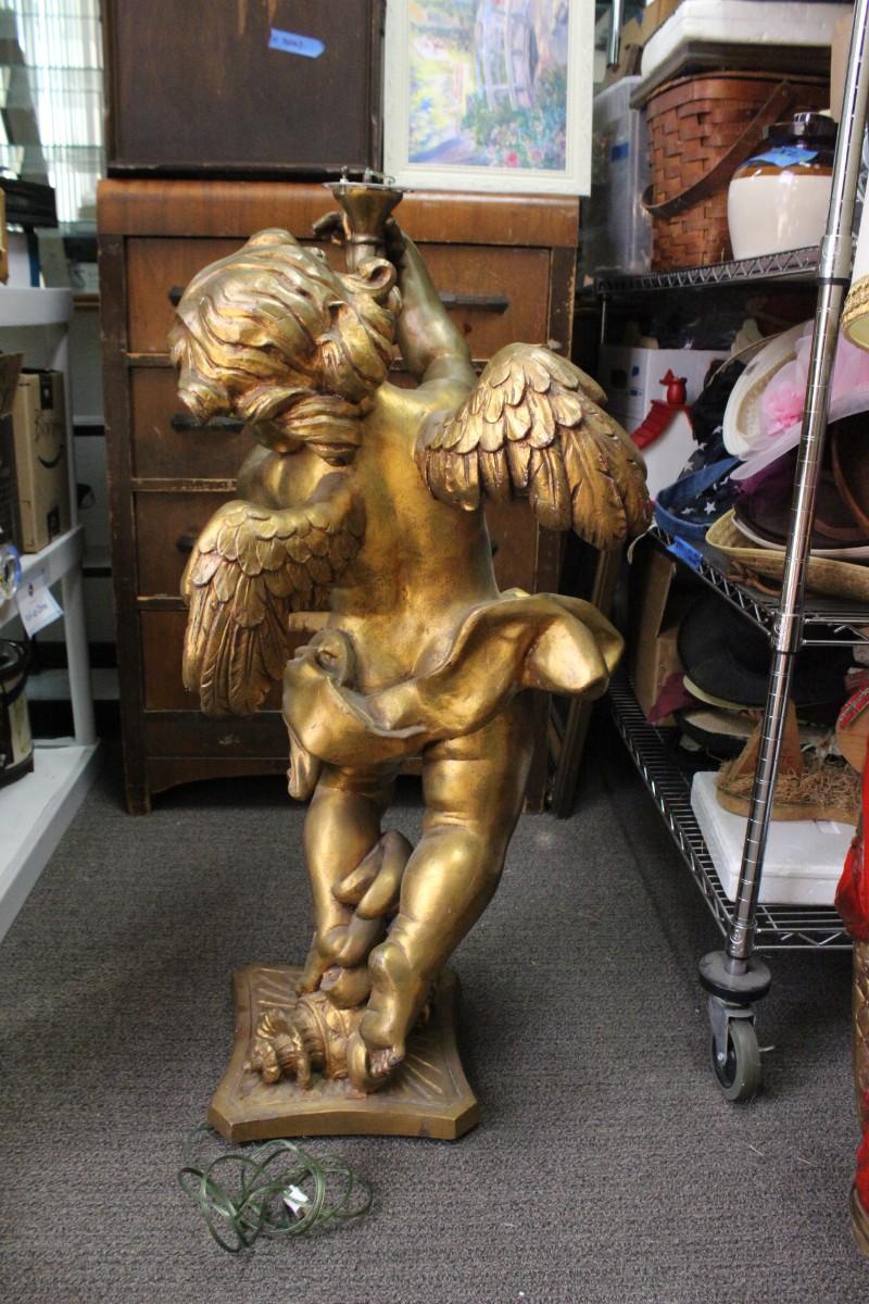 Vintage Gold Baby Angel Cherub Lamp, there's no significant chips on the piece itself. Has not been tested and it is missing the lamp fixture on the left hand, see pictures for more details. Stands a little bit over 35 inches tall.