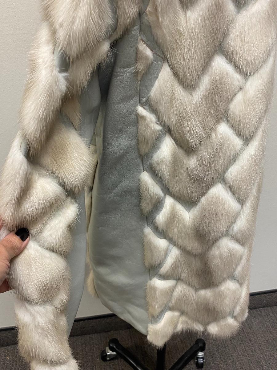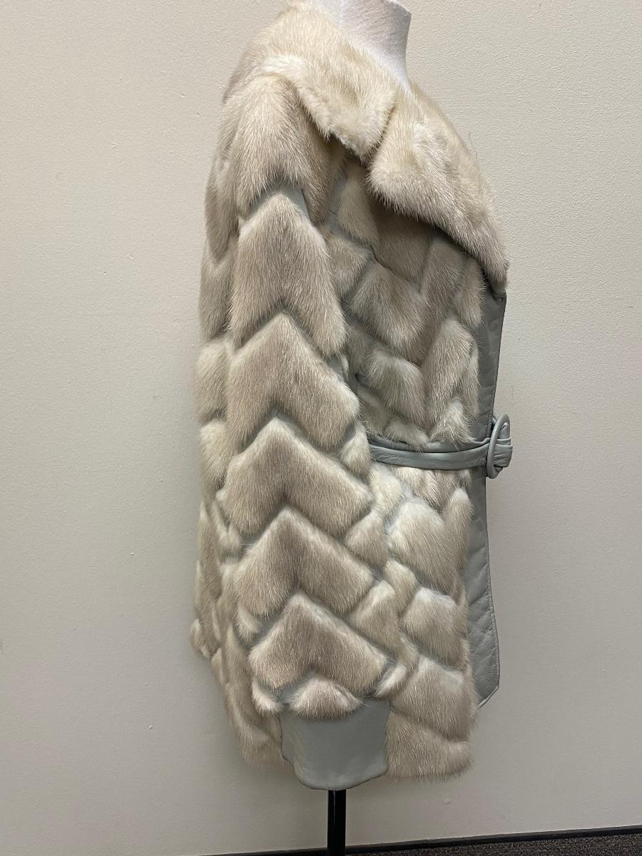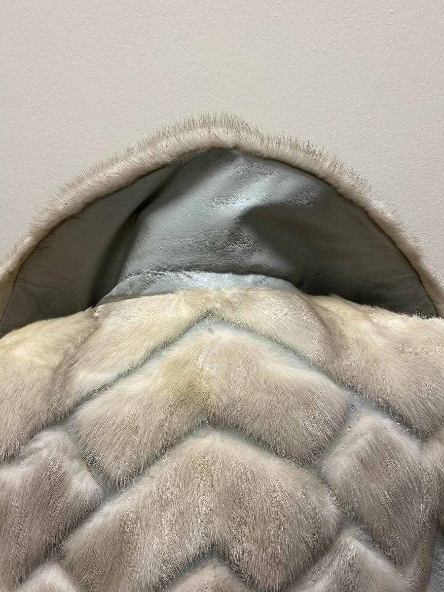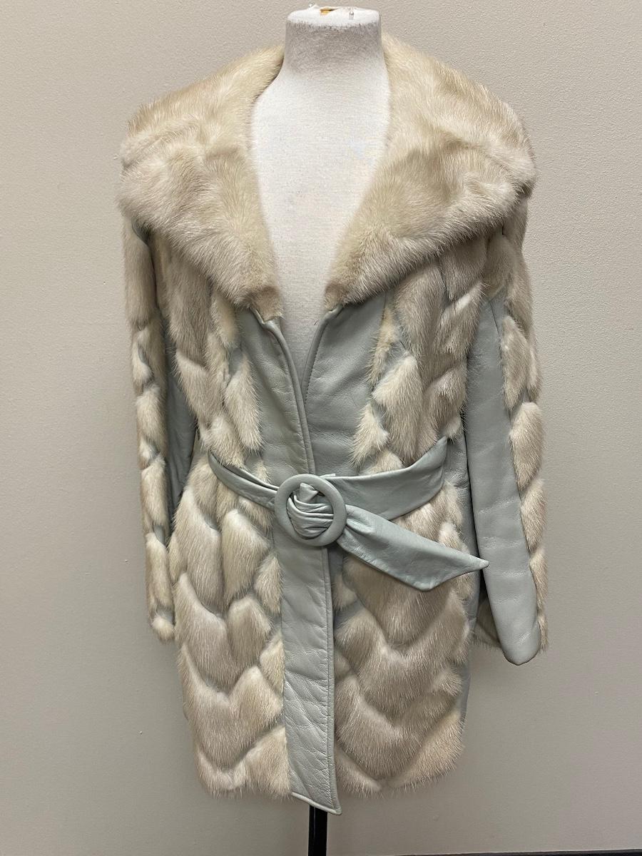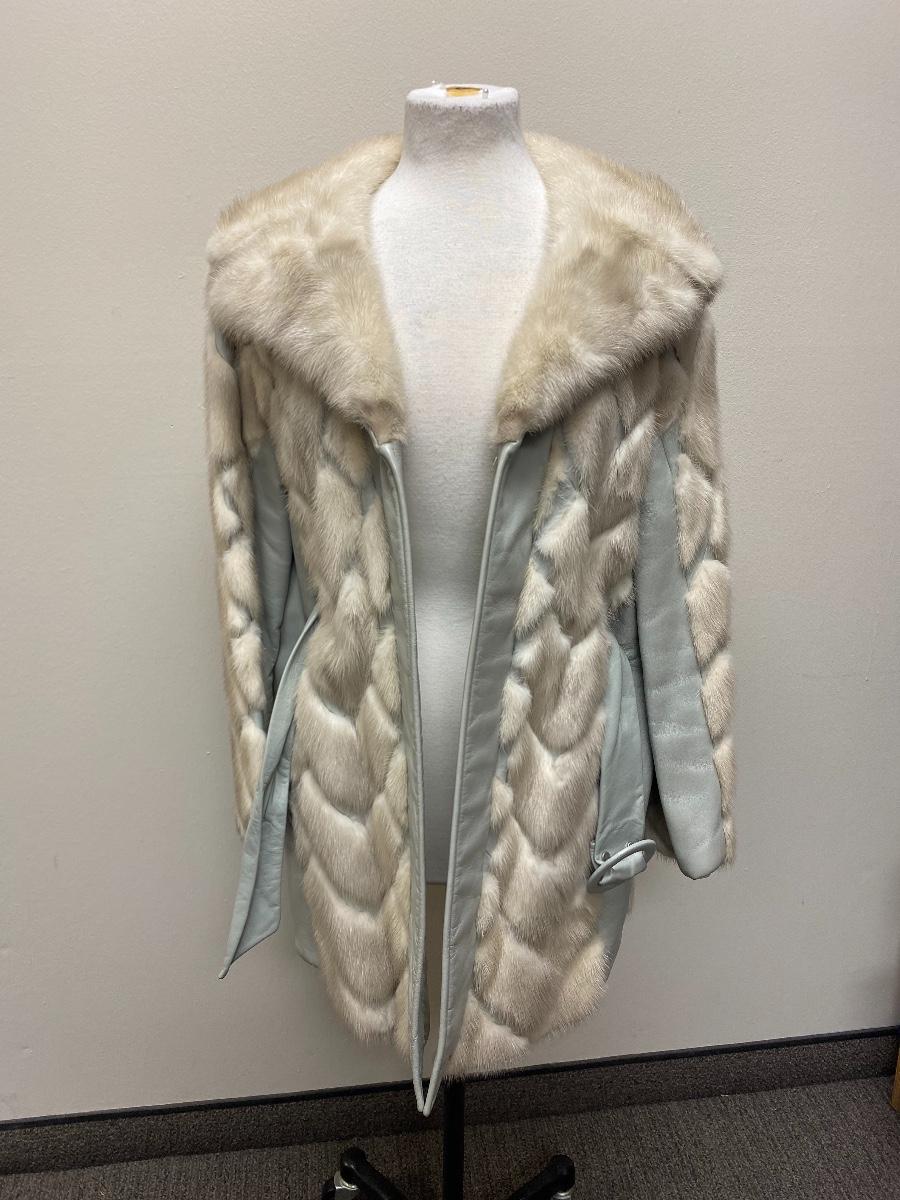 Retro fur jacket. Icy white fox fur with pale blue grey leather. Interesting geometric design. In good condition. Size small/medium. Name monogrammed inside, no maker tag.