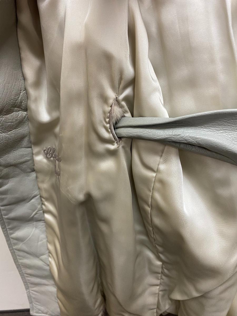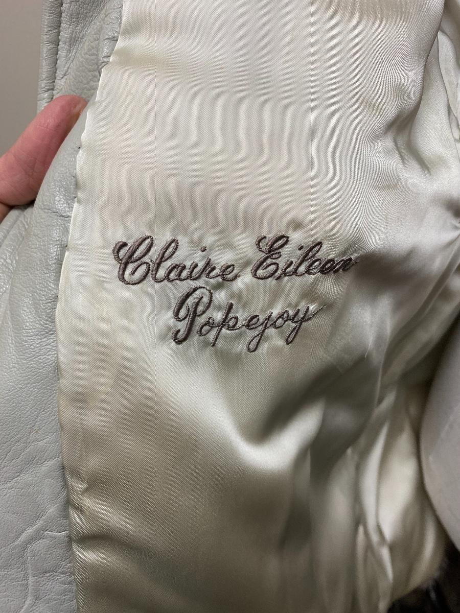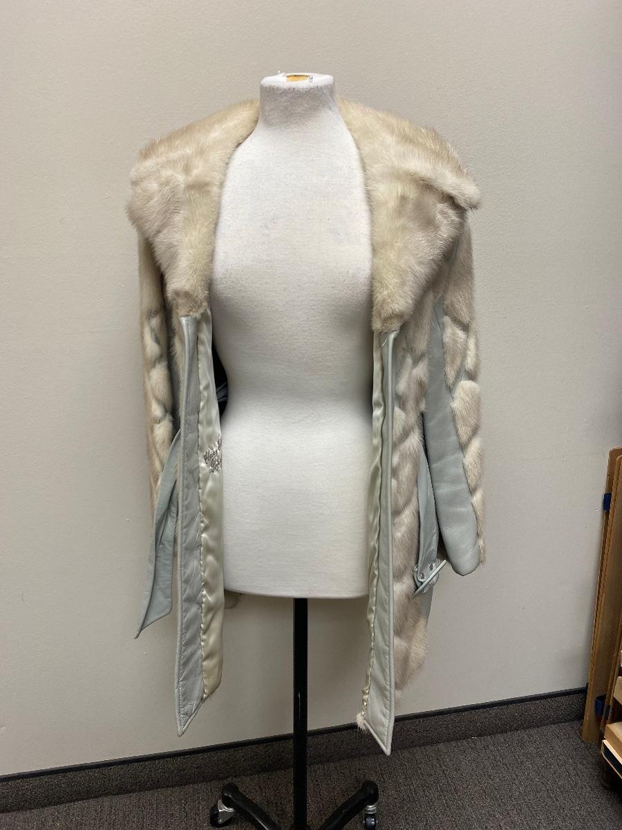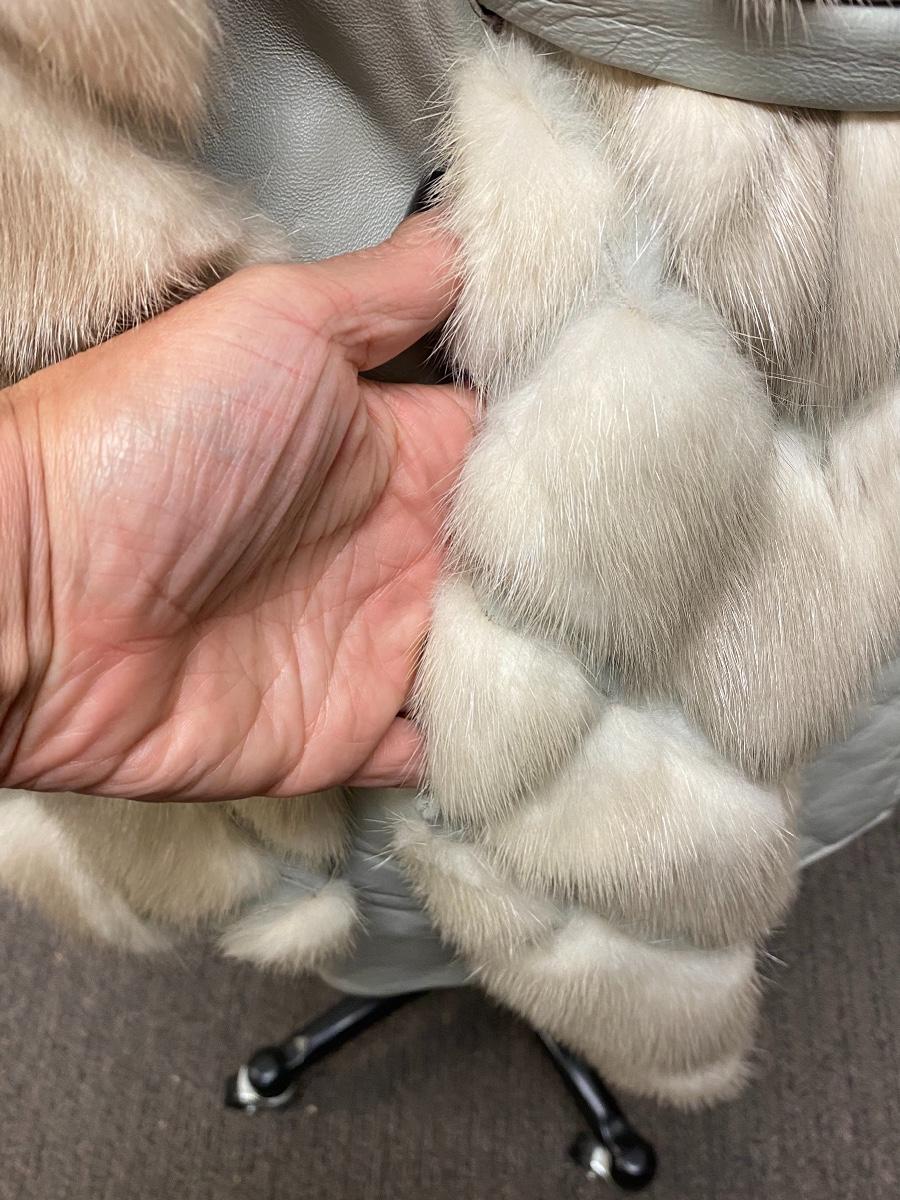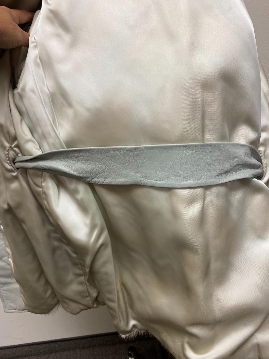 Retro fur jacket. Icy white fox fur with pale blue grey leather. Interesting geometric design. In good condition. Size small/medium. Name monogrammed inside, no maker tag.