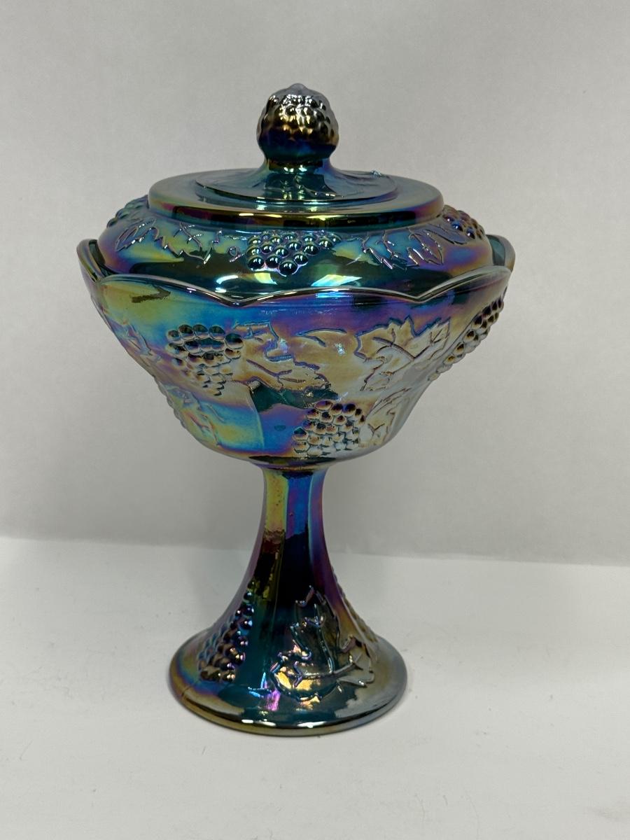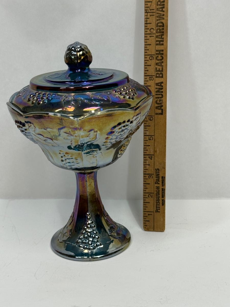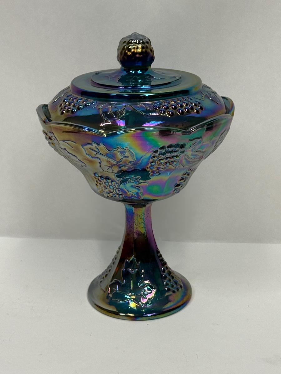 Fenton Carnival Glass Pedestal Lid Bowl Grapes Blue Purple Green Iridescent 10" high