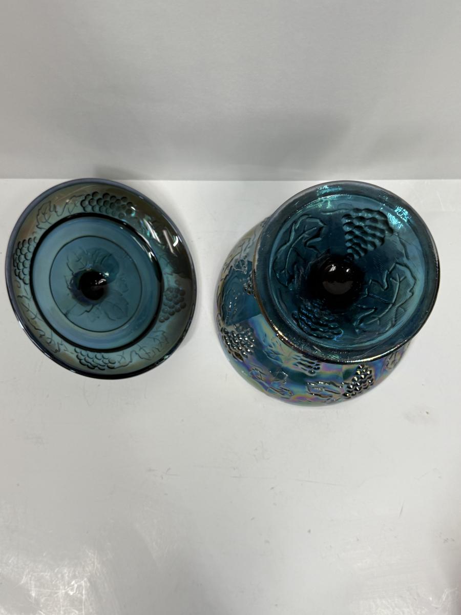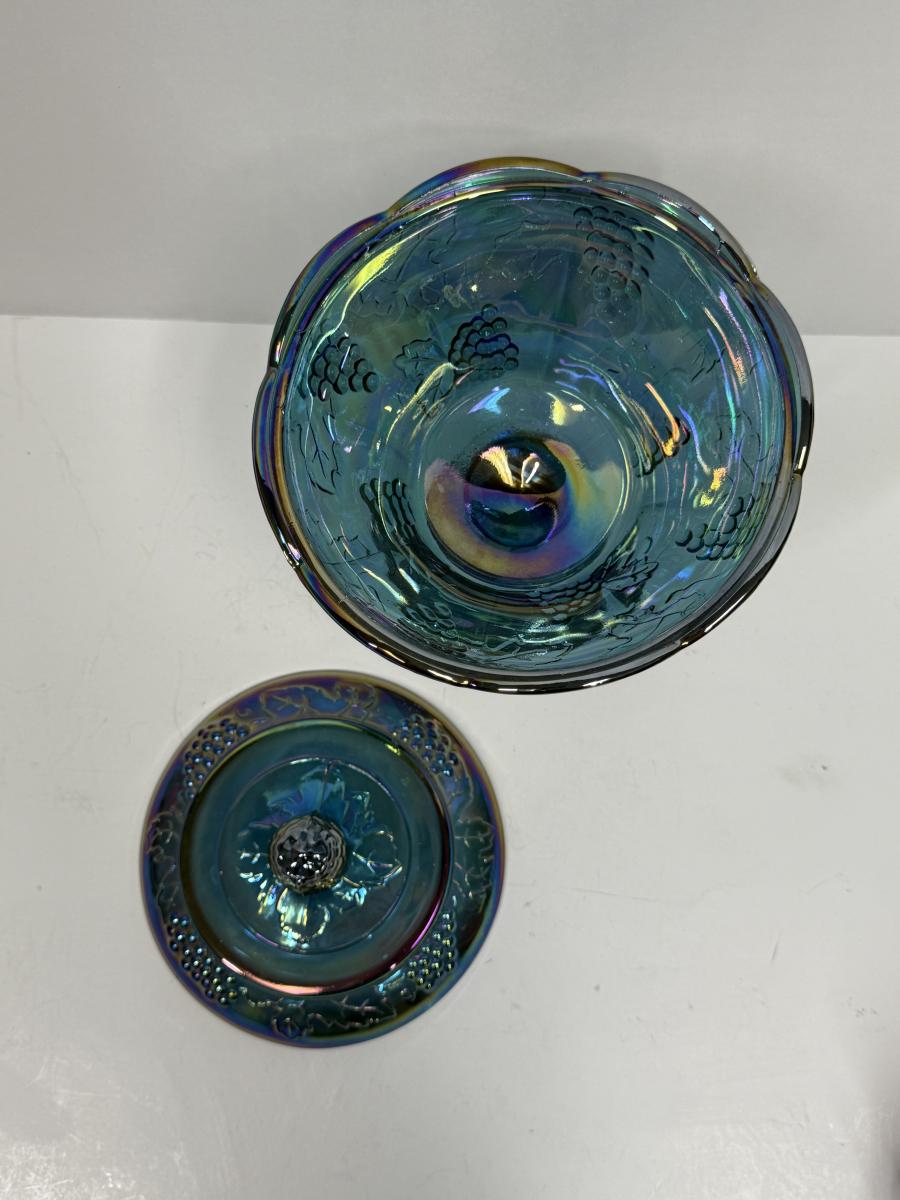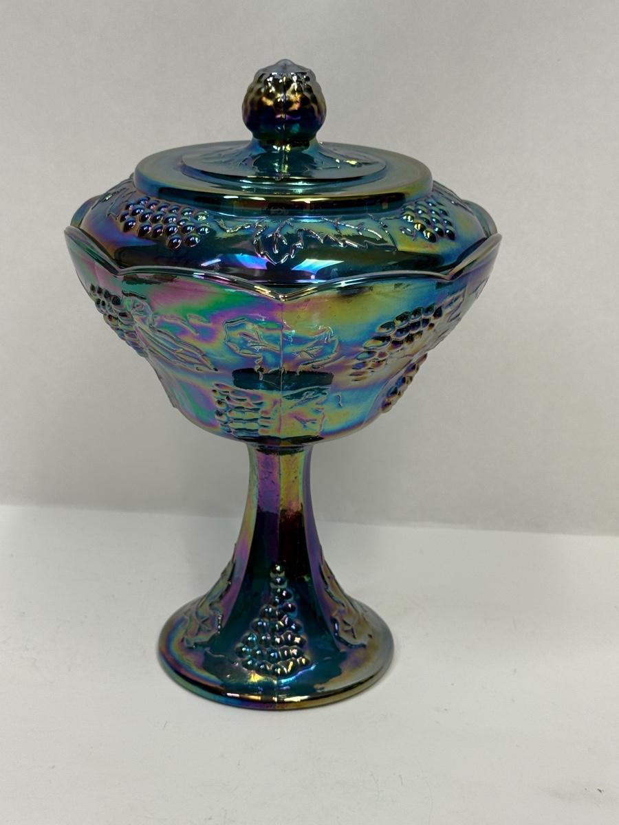 Fenton Carnival Glass Pedestal Lid Bowl Grapes Blue Purple Green Iridescent 10" high