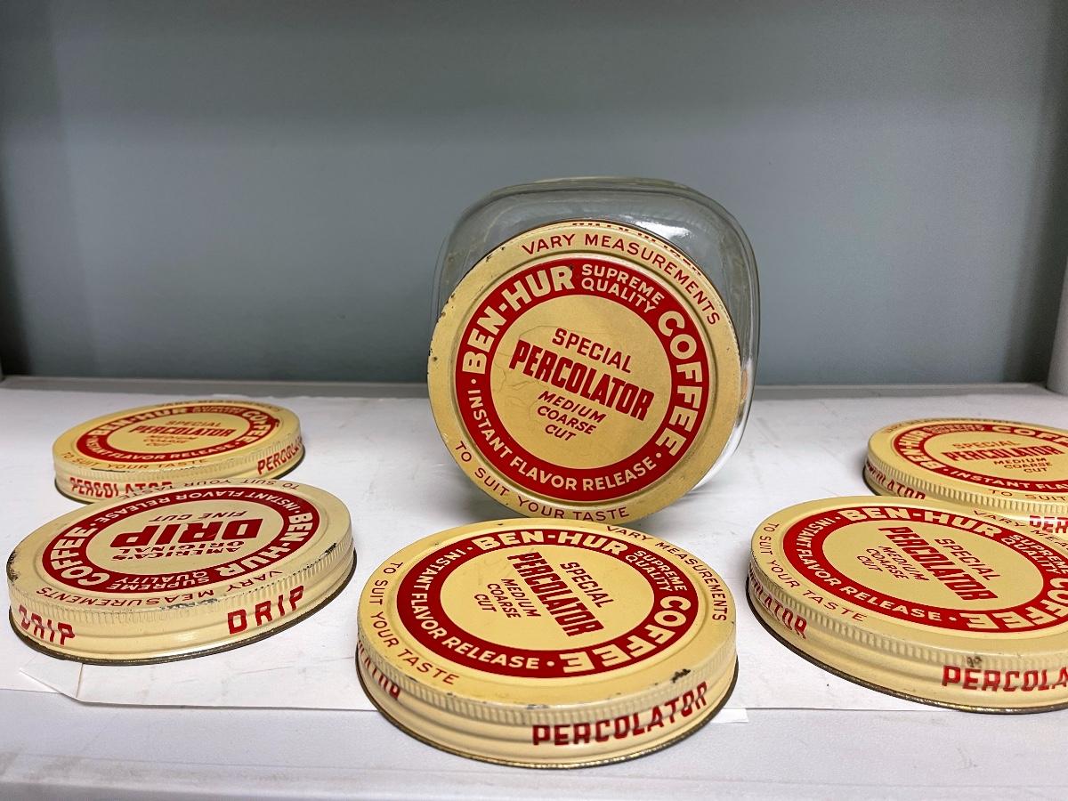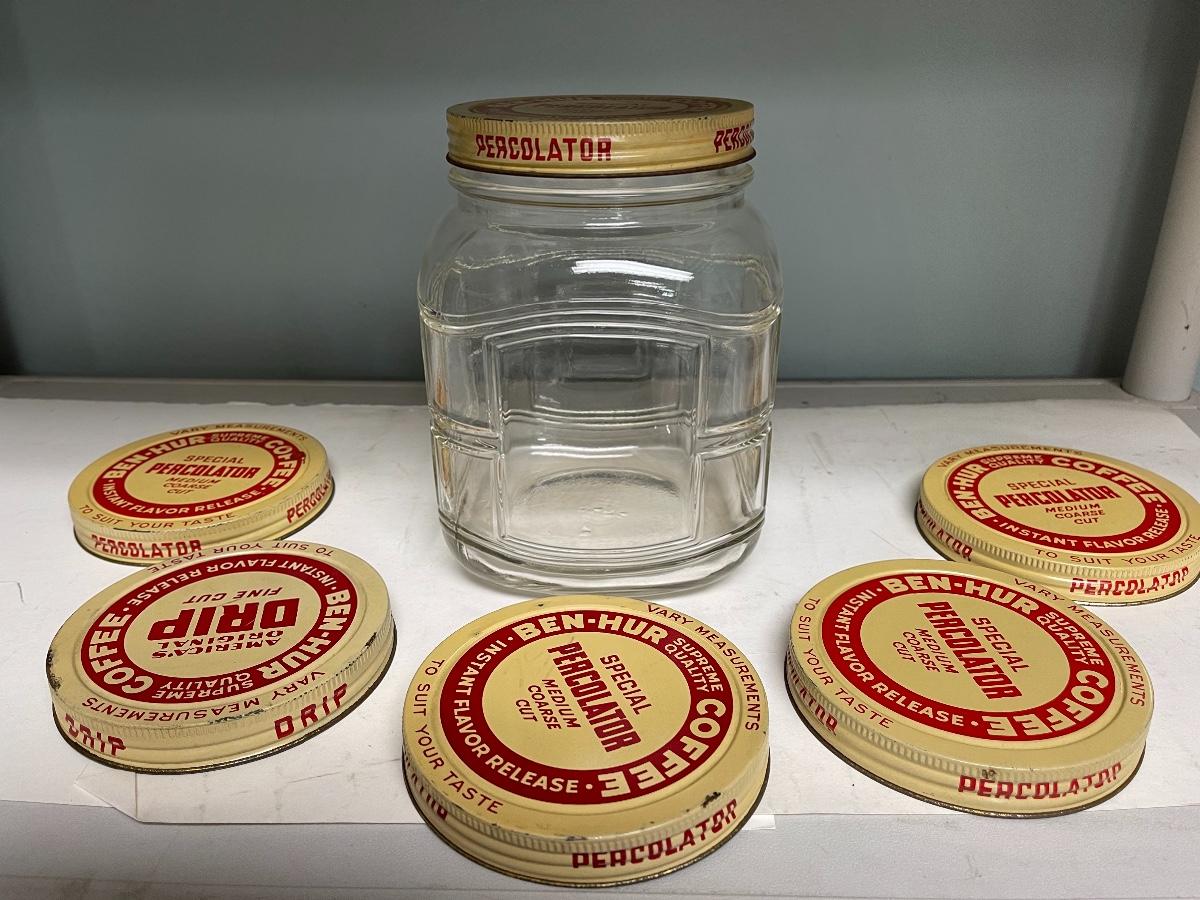VINTAGE ADVERTISING BEN-HUR COFFEE JAR WITH EXTRA LIDS