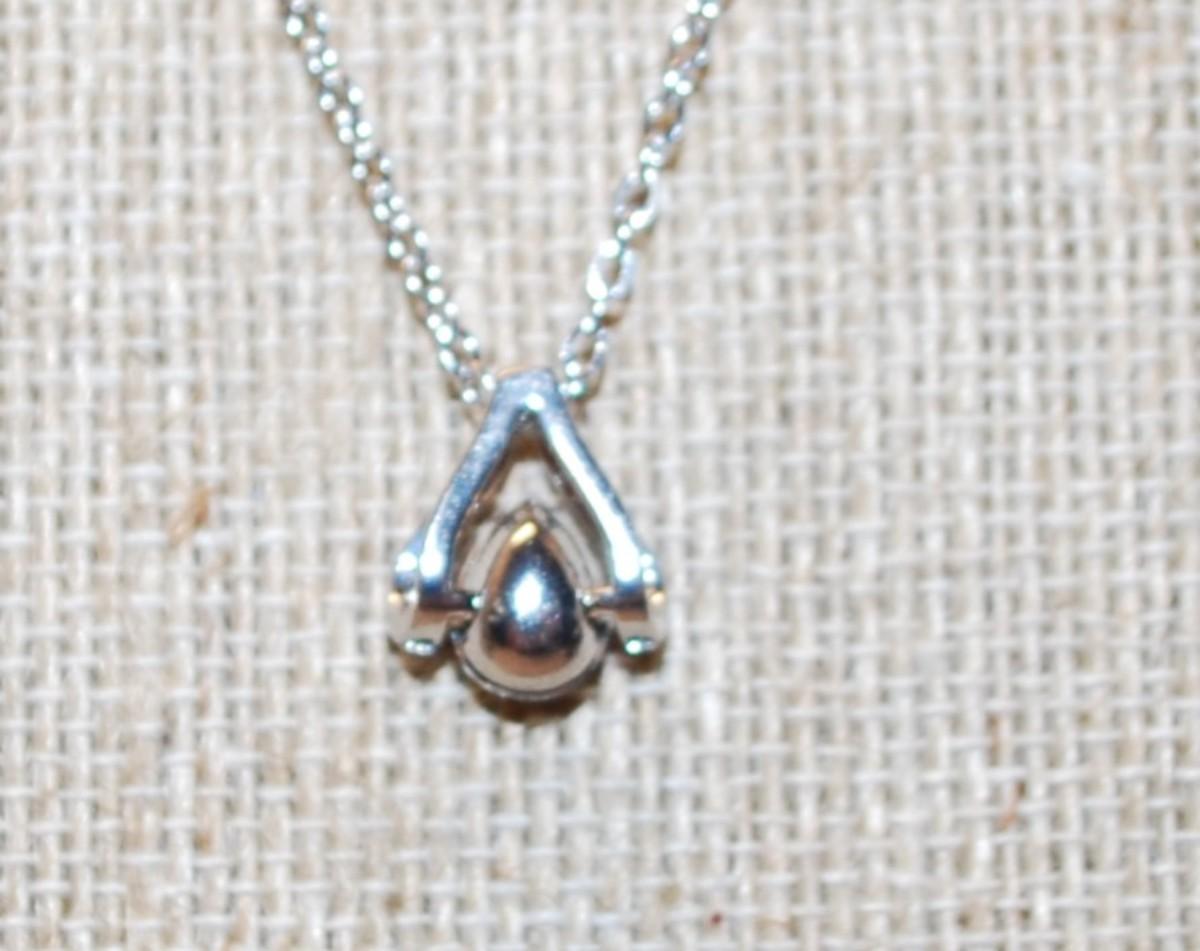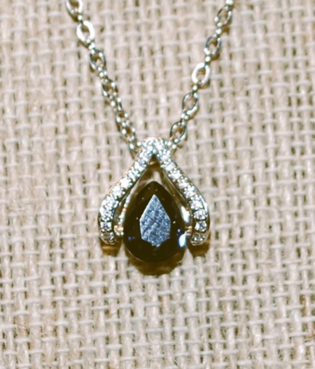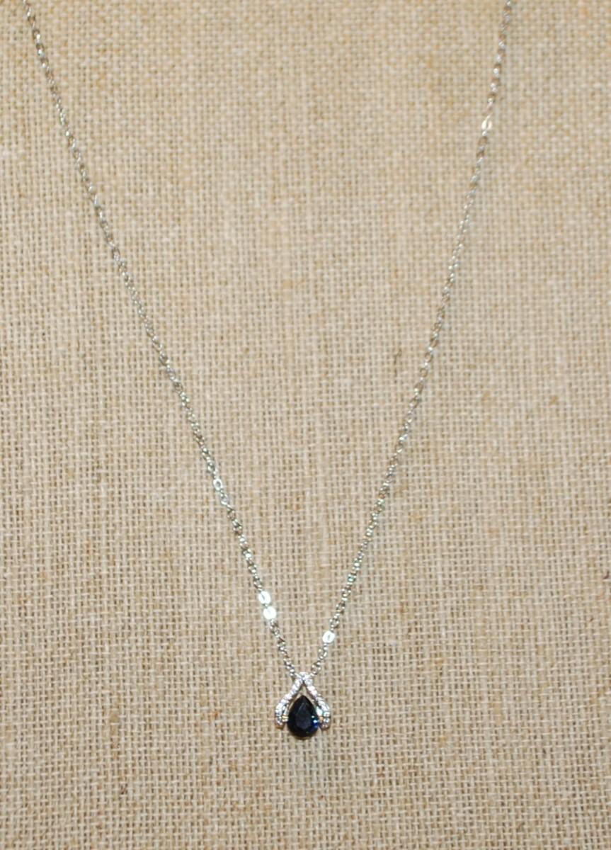 "V" Shaped Surround with a Pear Cut Deep Blue Stone PENDANT (½" x ½") on a Silver Tone Necklace Chain 17" L