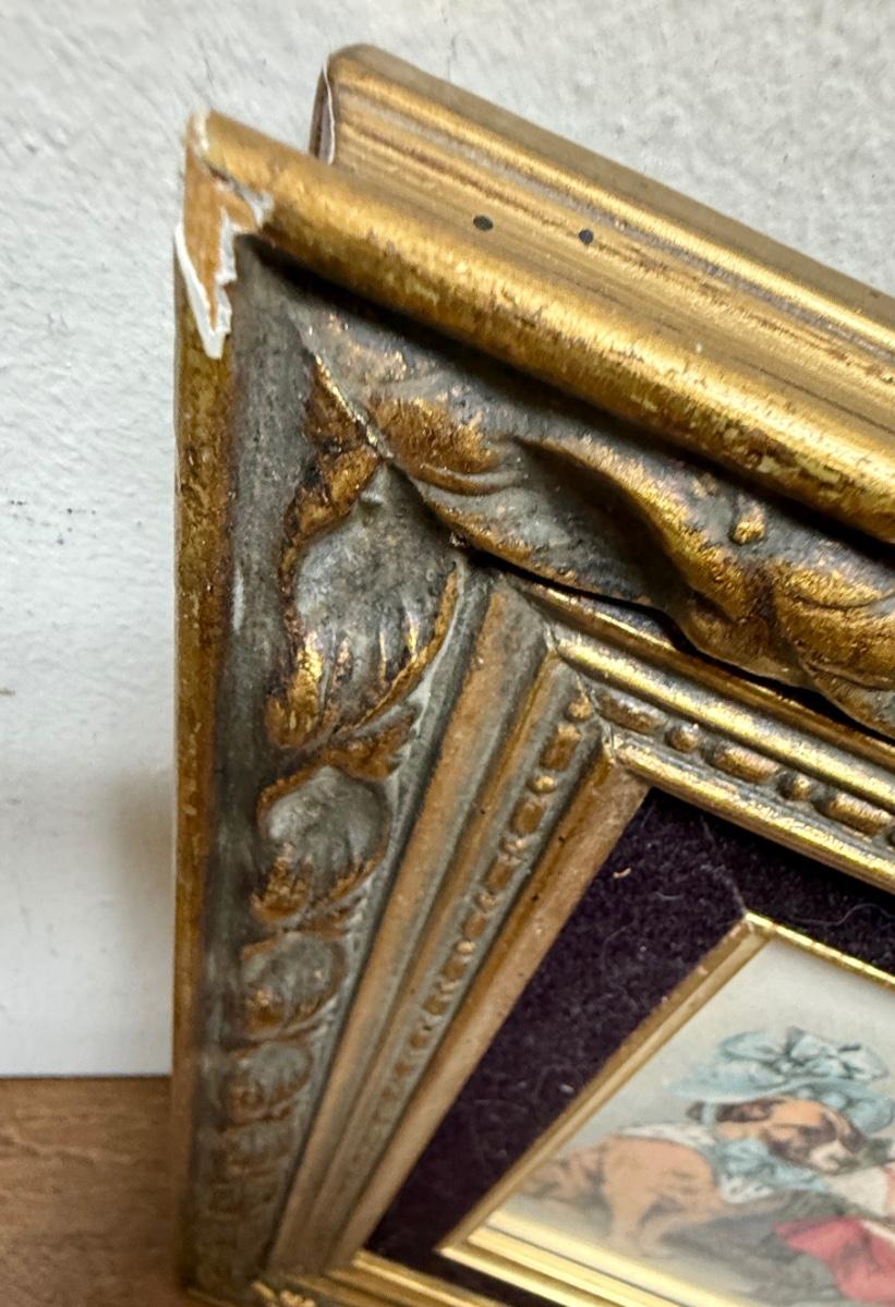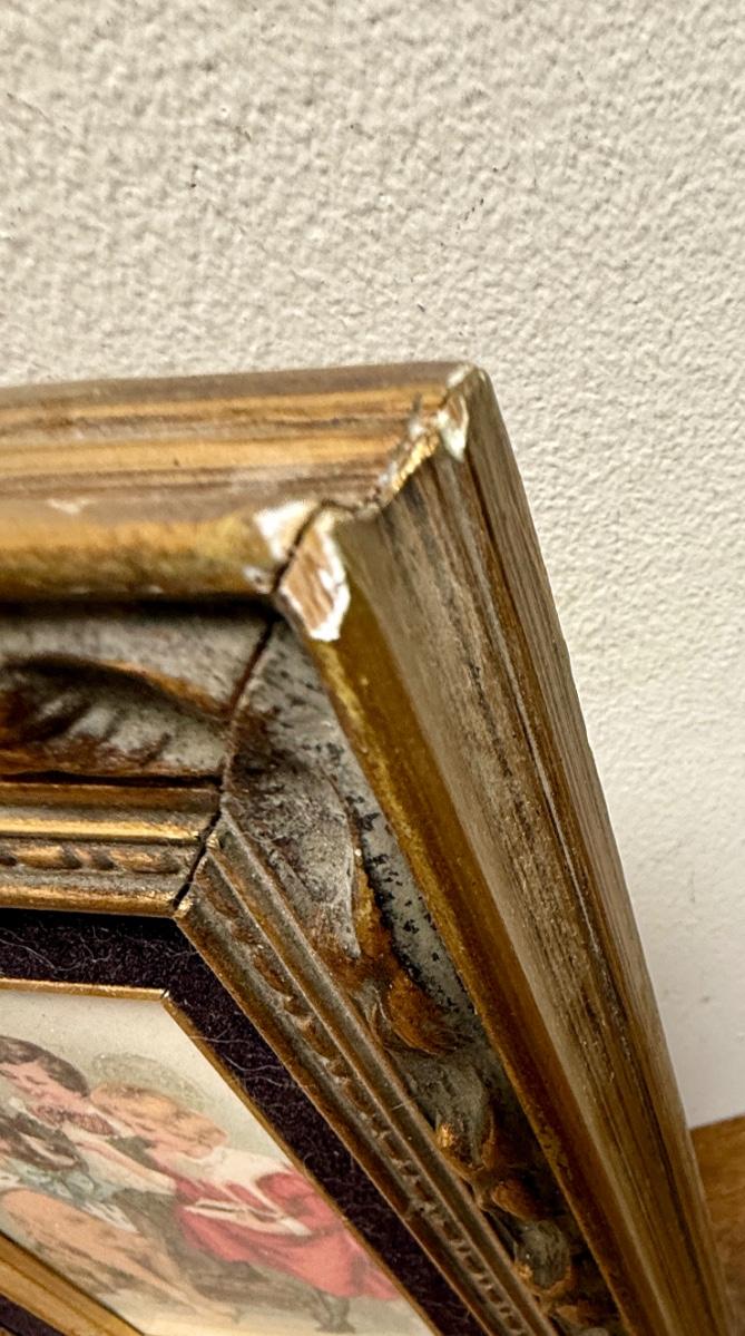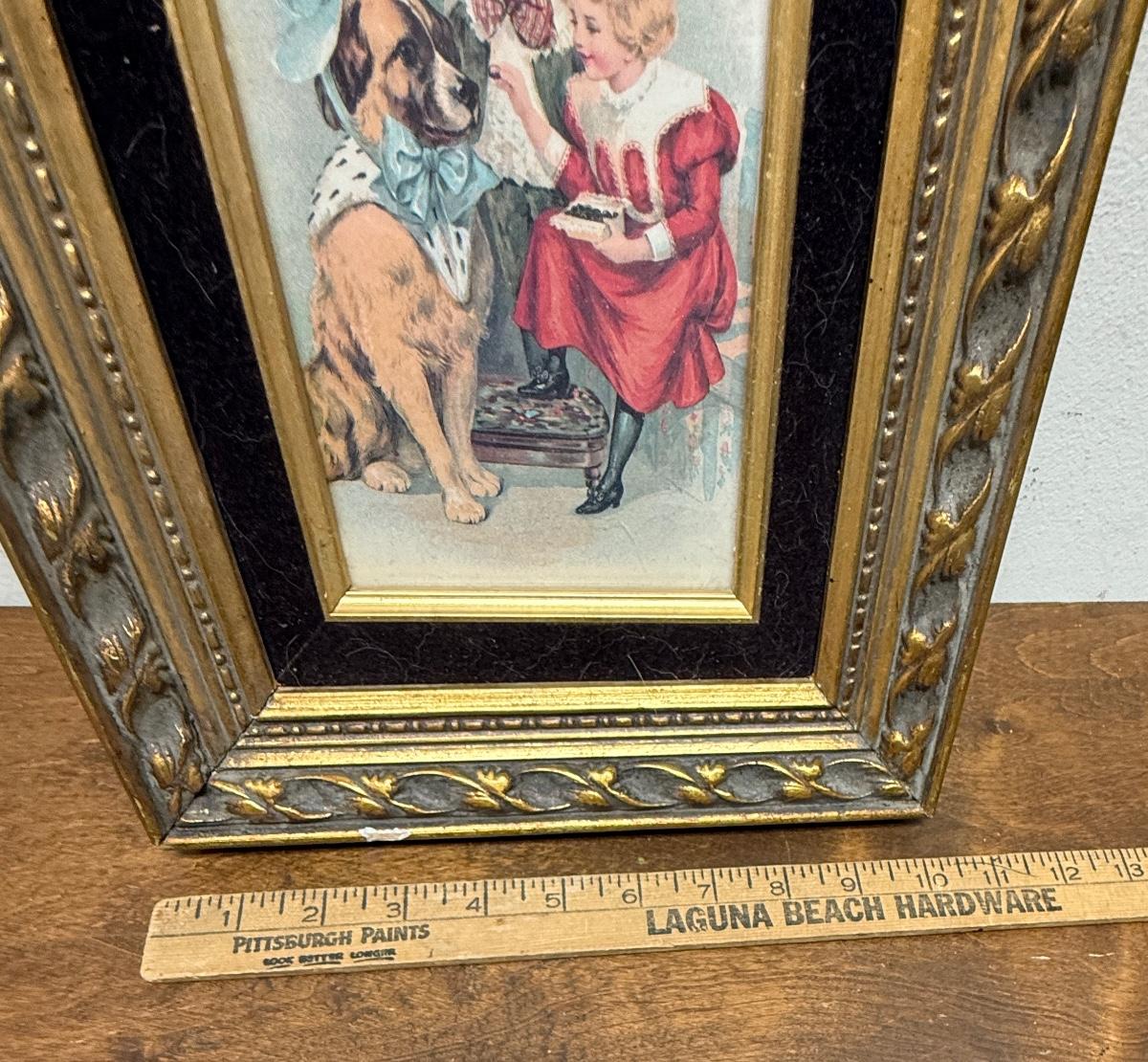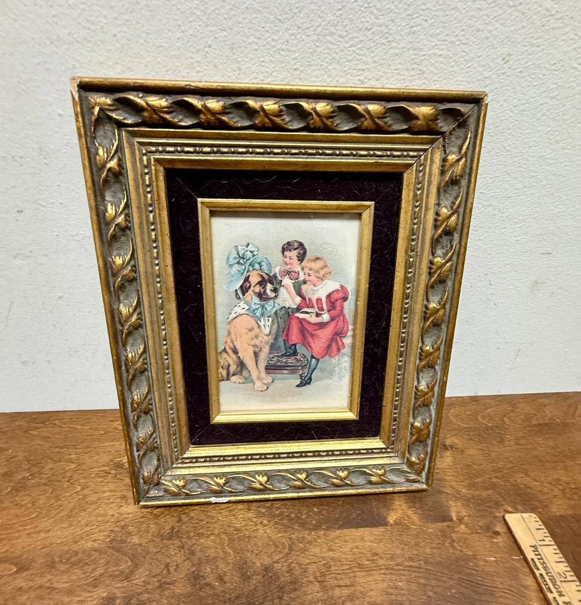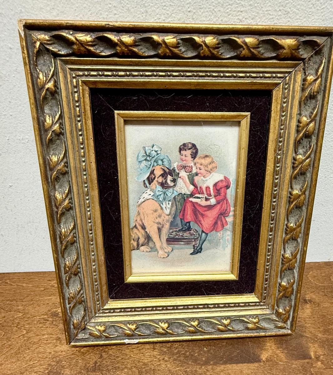 Framed Art: Victorian Style Image of Children Dressing a Dog