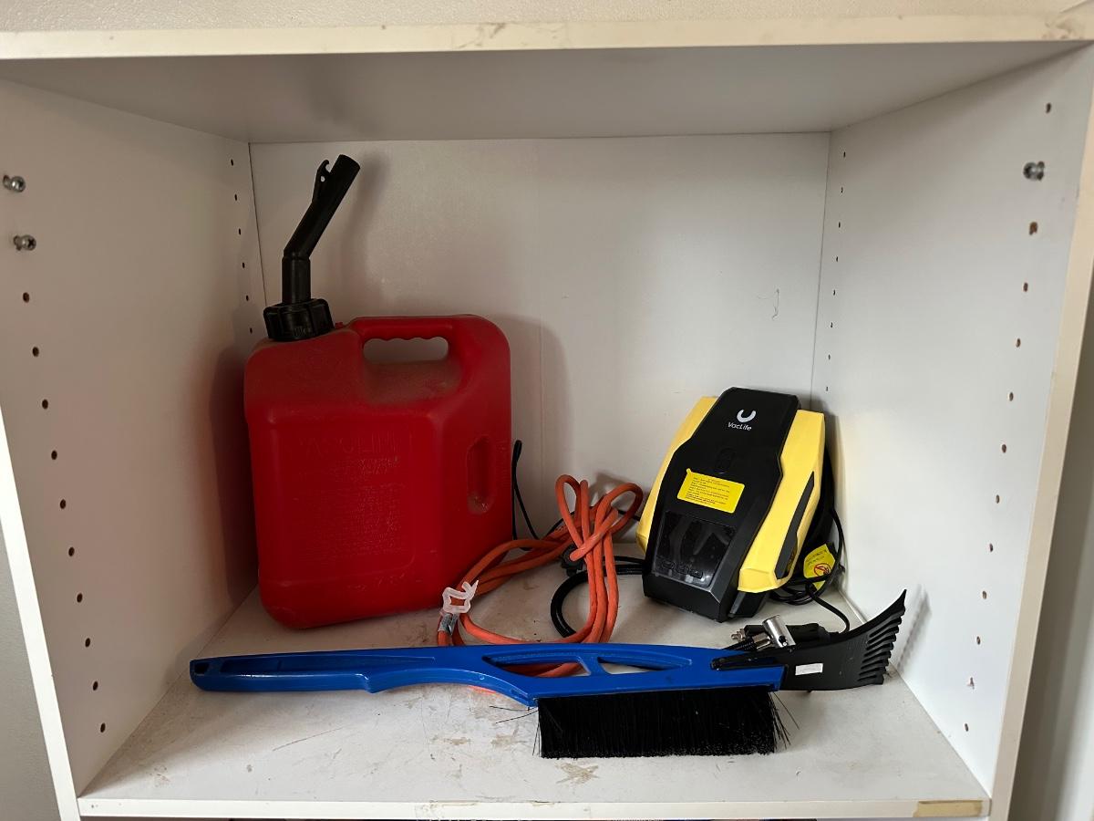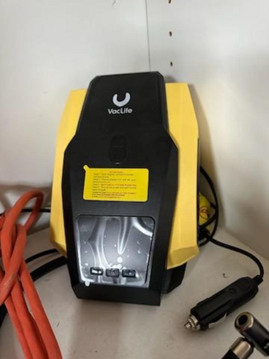 VAC LIFE AIR COMPRESSOR, GAS CAN, EXTENSION CORD AND AUTO BRUSH
