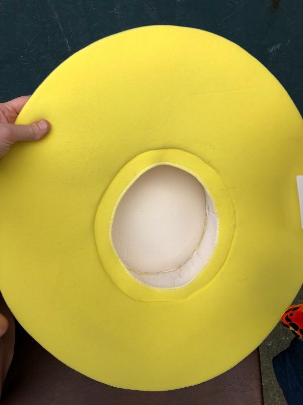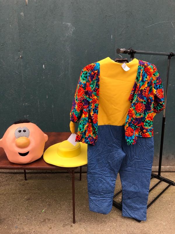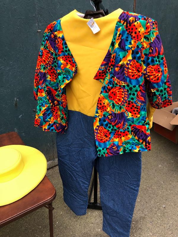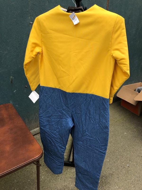 Fun costume! Blue pants and yellow shirt are all one bodysuit and the patterned top is removable. Very oversized costume, will fit a medium adult.